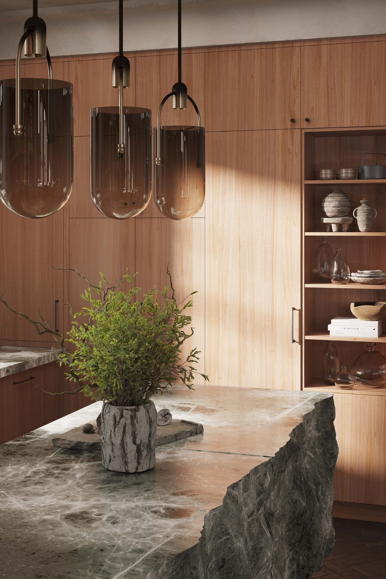 One of the most rewarding moments was seeing the hand-chiselled kitchen island, an epitome of our design philosophy, come to life. Witnessing raw stone transform into an exquisite functional and artistic centrepiece was a validation of our vision. This island epitomized the harmony between rough and refined, and watching it anchor the space was truly a joy.