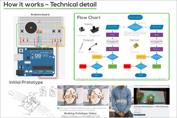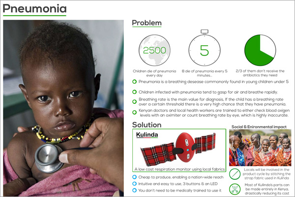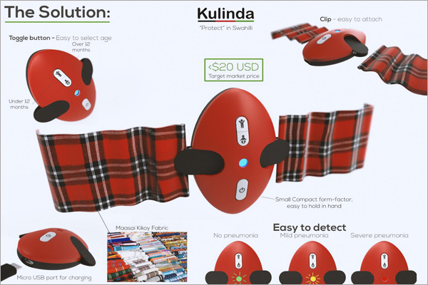 Around 2,500 children die of Pneumonia every day, with a large proportion being from developing countries. As increased respiratory rate is the main symptom for the lethal lung disease, doctors in developing countries count breaths by eye to determine whether it is present, which can leave a large margin for error. The designer obtained insight into the severity of the issue as his mother is a Kenyan doctor. Describing procedure of holding babies to monitor chest movement, with a watch to count respiratory rate, she stressed how inaccurate the method of diagnosis was in practice. After being approached with this problem, the Kulinda solution was developed.