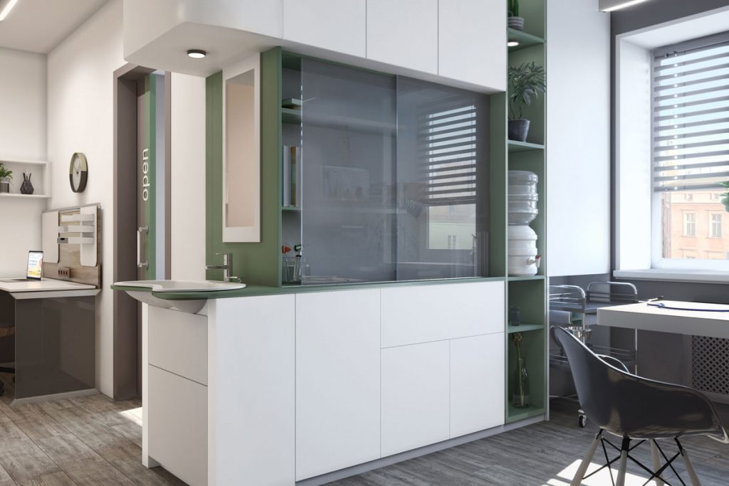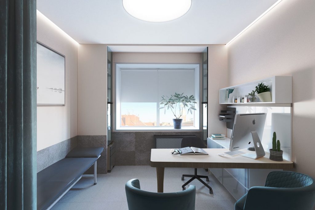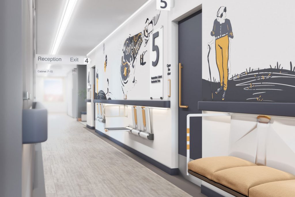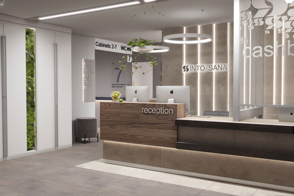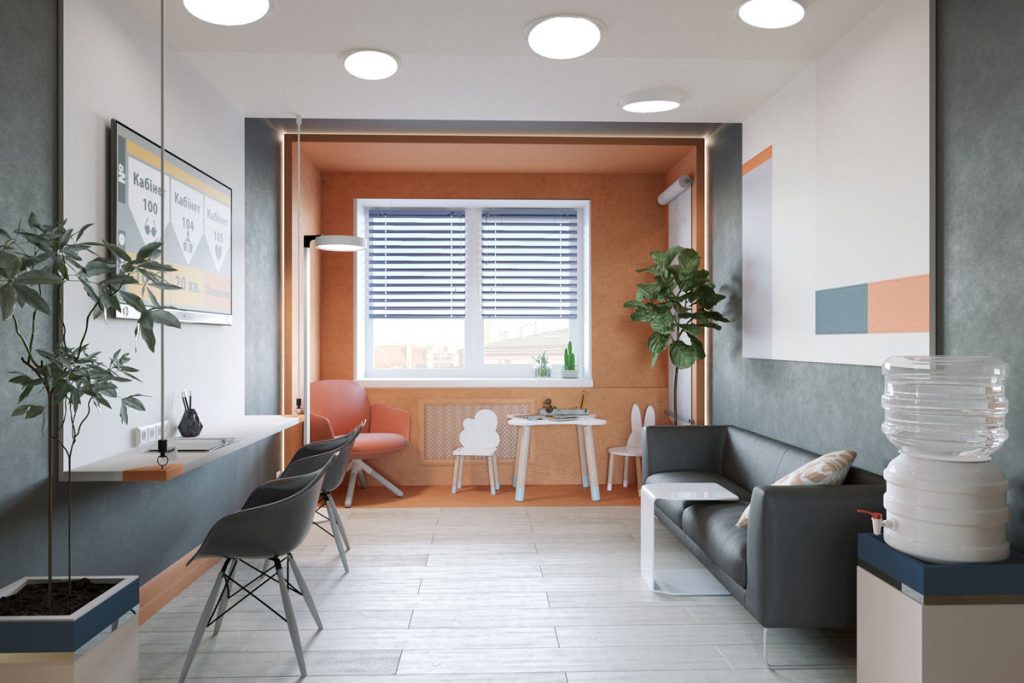 Intuitive design was created with room features taken into account. Each room has a unique colour range to indicate different zones. This project has specially created designer furniture (reception, waiting area in the corridor, washbasins in medical rooms, etc) and navigation systems which adhere to principals of universal design. To ensure patients and visitors can move around the hospital at ease, the design includes a variety of features; the two-level reception desk at height 800 mm and 1100 mm to serve people in wheelchairs, as well as corridors equipped with handrails and automated seats and doors. The seats and the handrails can also be lowered by pressing the button.