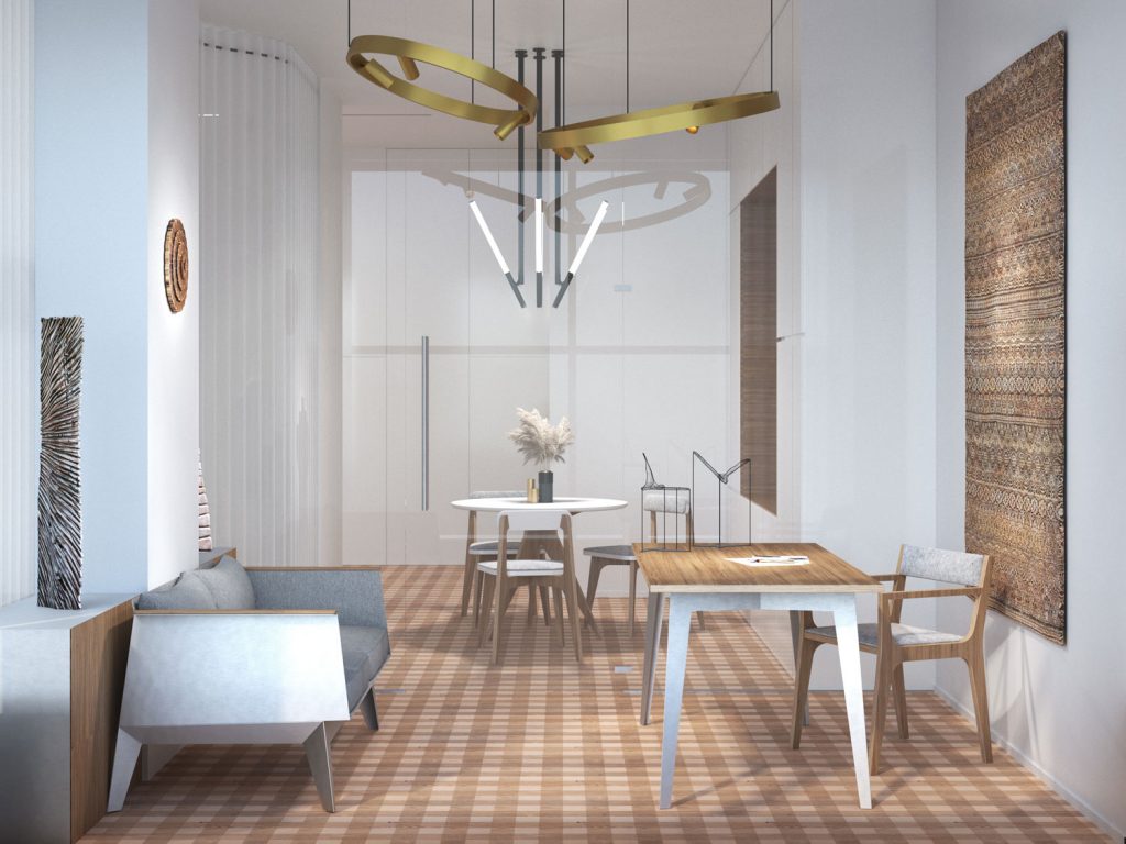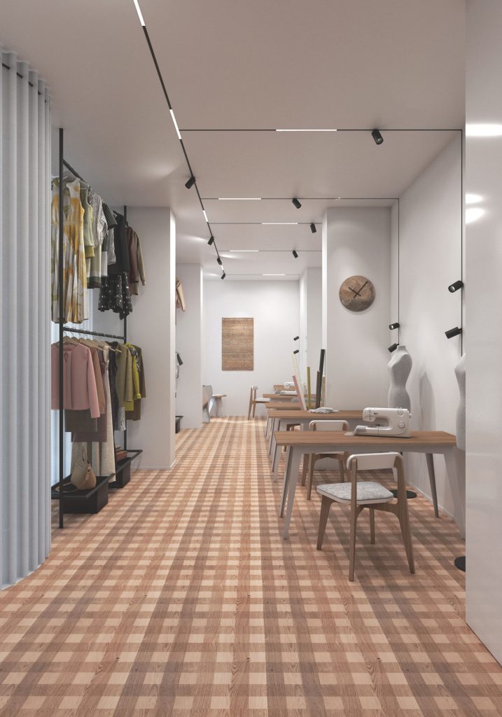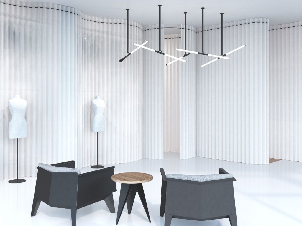 The inspiration for the project was the synergy of the work of Lilia Pustovit and Ukrainian artist Kazimir Malevich. Simple shapes create a space that acts as a background which serves as a place to fill with and exhibit “live” objects with texture and colours. At the same time, the design studio has this cosy feeling and home-like atmosphere. Due to the use of fabric as the main “building material”, the design studio is flooded with natural light. This project is the personification of the combination of modern and historical, simple and complex, warm and cold.