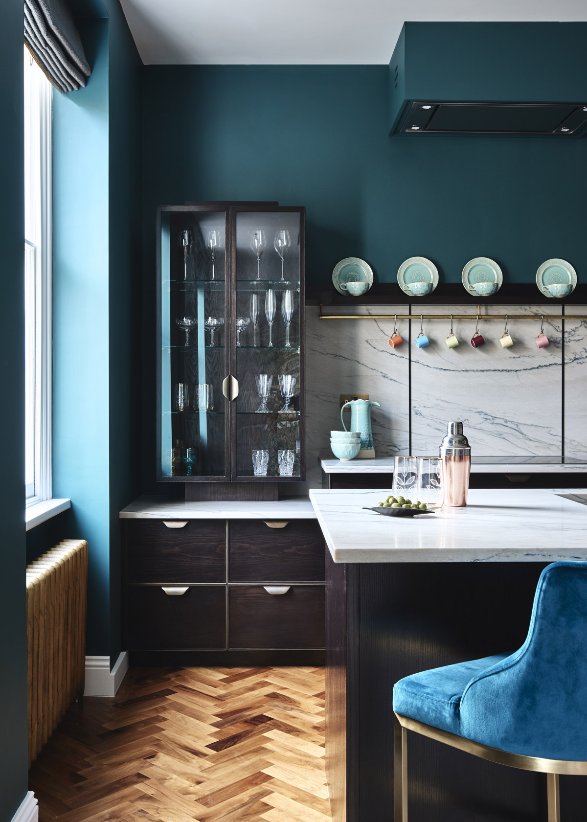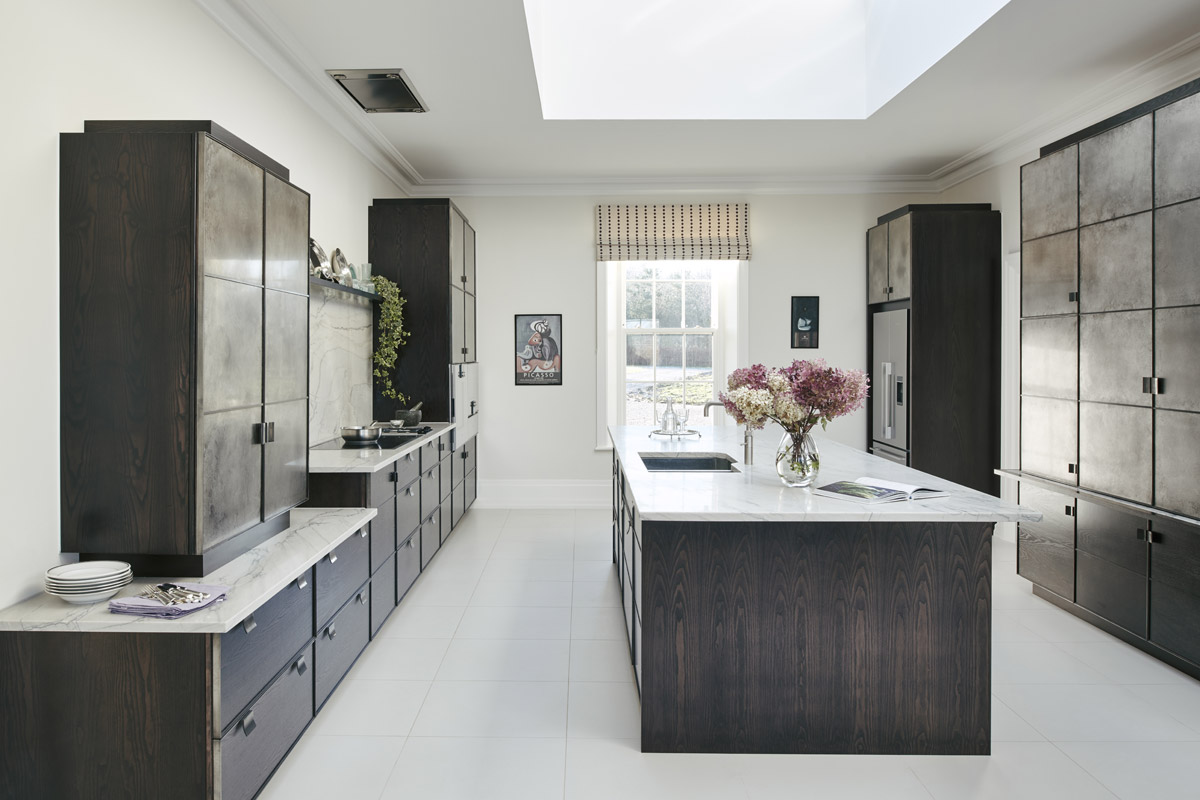 We also collaborate with a handful of talented artists and artisans: Emma Culshaw Bell, an artist and specialist painter who creates bespoke colours and finishes for our painted furniture, and designs and fabricates the Verre Eglomise incorporated into our kitchens; Quentin Reynolds, the craftsman behind our pewter door fronts; and George Winks who carves wood beautifully. We have worked carefully, on a project-by-project basis, to incorporate these elements into our furniture.