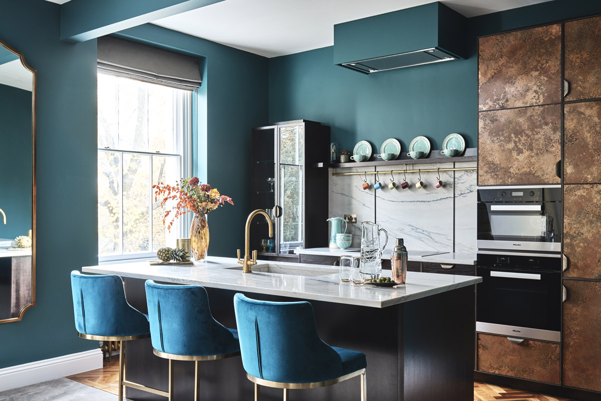 Copper-fronted units house the ovens and integrated fridge-freezer, with cupboards above.