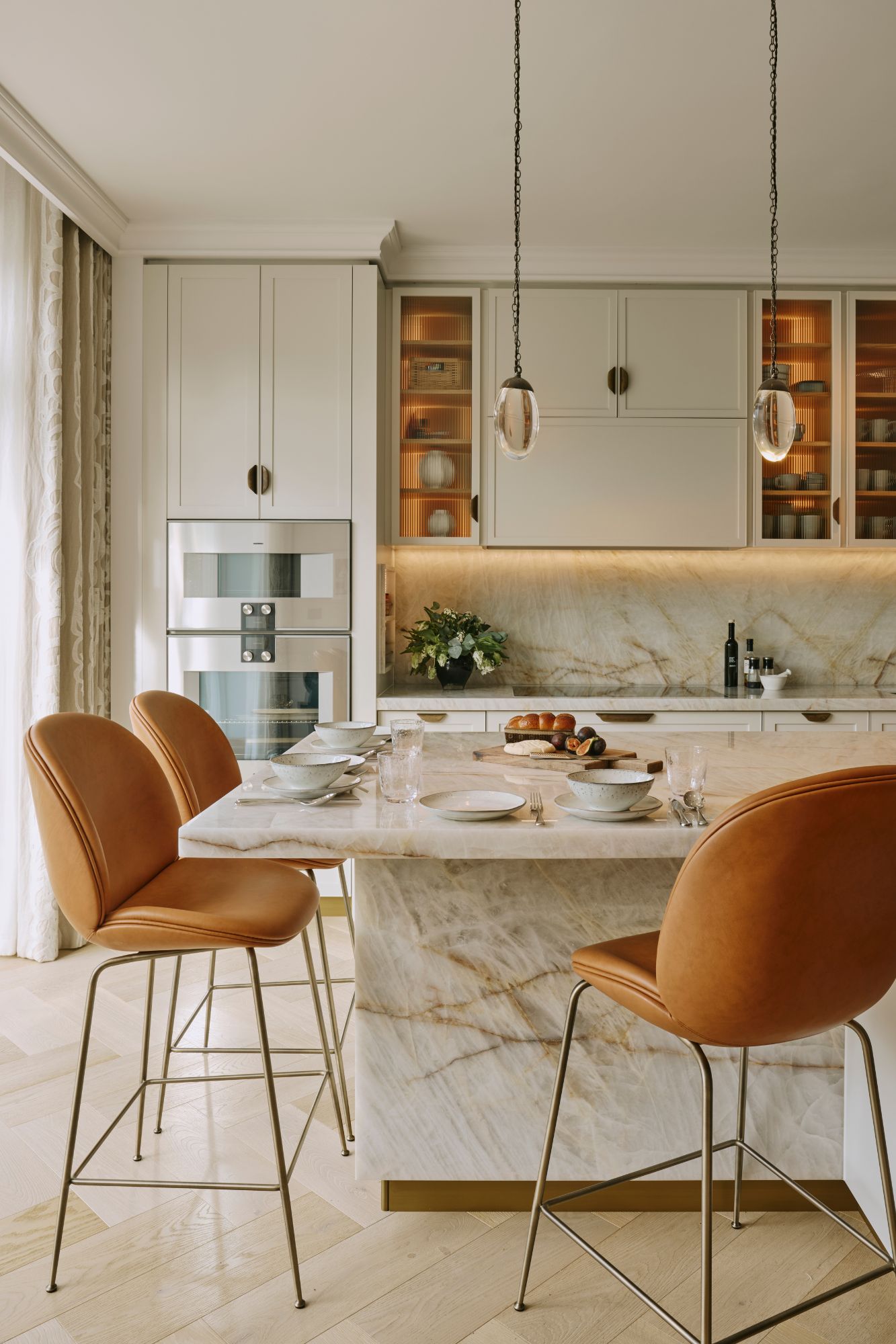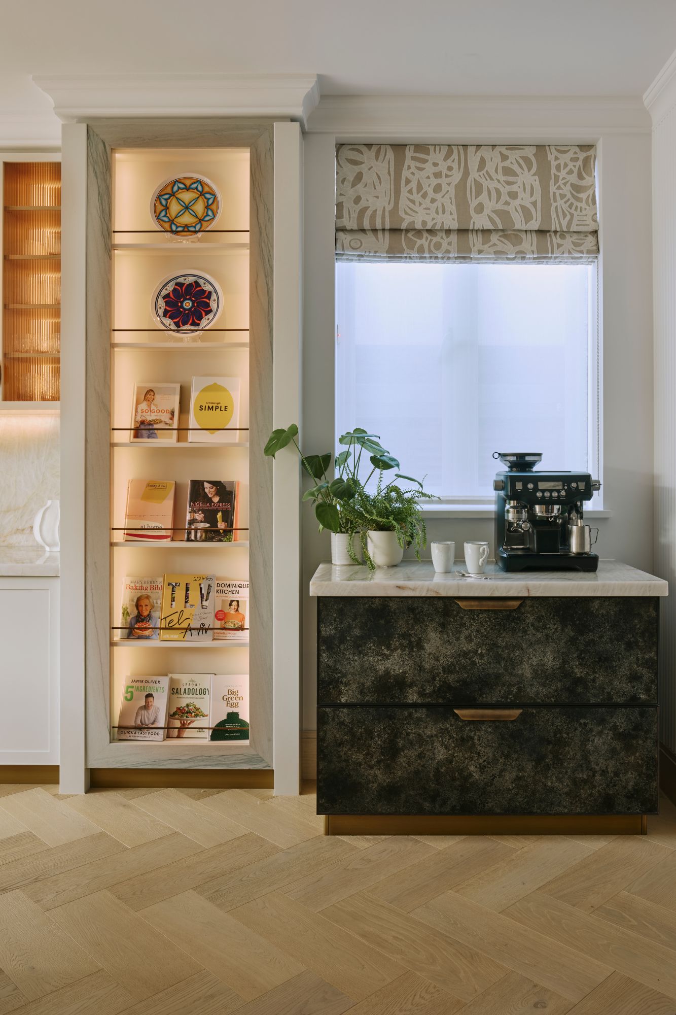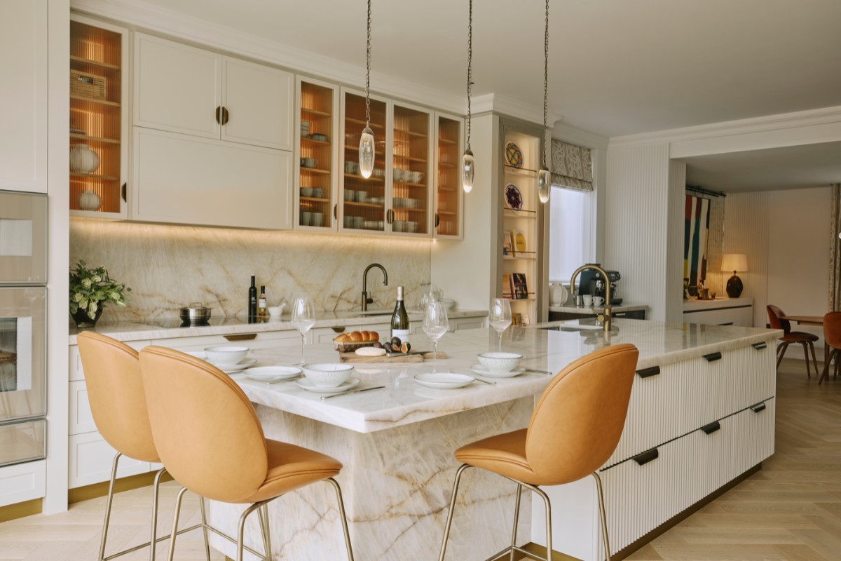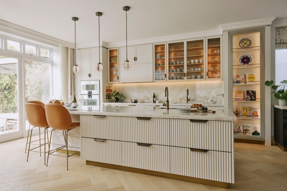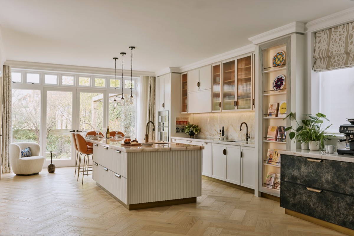 17th December 2024 | IN INTERIOR DESIGN PROJECTS | BY SBID Share Tweet Pinterest LinkedIn The owners of the latest Ledbury Studio project were undertaking a complete renovation of their home when they approached Charlie Smallbone and team to design this elegant open-plan kitchen. For this space, their primary goal was to create a kitchen and dining area that could serve as a versatile room for the entire family to cook, dine and spend time in together. “This kitchen was designed to be both beautiful and practical,” explains Charlie. “The use of different materials and textures creates a dynamic and engaging space, while the layout ensures it meets the needs of a busy family. The combination of metal, marble and quartzite adds depth and interest, making it a room that is not only functional but also a joy to be in.” Stylish neutrals The clients wanted a neutral palette, so Charlie selected painted cabinets with a single panel design in Ash White. But then to prevent the solid fronts from overwhelming the space, he added ribbed glass wall cabinets into the mix, bringing an element of lightness and texture that breaks up the uniformity and enhances visual interest. The stunning island features a reeded surround and Diamond Quartzite worktop. Beautiful metallics Various metallic elements throughout the kitchen add Charlie’s signature wow factor. Aged brass handles and kickplates enhance the cabinetry, while the spice rack features delicate brass rails. The kitchen taps are also brass, as are the fittings on the trio of pendants hung over the island. These touches of brass not only add a luxurious feel but also provide a cohesive look to the kitchen. The show-stopping island The central island is another talking point of the space thanks to its reeded surround and stunning Diamond Quartzite top. Home to the kitchen sink as well as a breakfast bar for casual dining, this eye-catching island serves as both a functional workspace and a social centrepiece. The same Diamond Quartzite is used for the adjacent worktop and splashback, elegantly tying all the kitchen elements together and ensuring a harmonious flow throughout. The refrigeration cupboards are clad in sheets of aged zinc. The refrigeration cupboards are a deliberate contrast with the cool Ash White elsewhere in the kitchen. Industrial chic In contrast to the Ash White cabinets and cool quartzite, the coffee-making station and tall refrigeration cupboards are clad in sheets of zinc that have been aged and patinated. The zinc adds a touch of industrial chic, juxtaposing beautifully with the kitchen’s otherwise polished aesthetic. This contrast both highlights this functional section of the kitchen and adds depth to the overall design. The book rack with marble surround is a fabulous focal point. The walk-in larder provides practical food storage. A focus on food A walk-in pantry was a must-have addition for the clients, creating convenient storage for the family’s food. Given their passion for cooking, Charlie also integrated a floor-to-ceiling book rack into the design, which is stylishly framed in marble and provides ample space for their collection of cookbooks. A space in which to cook, dine and spend time as a family. Prices for a Ledbury Studio kitchen start from £70,000. About Ledbury Studio Ltd Charlie Smallbone needs little introduction. The founder of iconic brand Smallbone of Devizes, he has been pushing the boundaries of kitchen design for over 40 years. Charlie’s latest venture, Ledbury Studio, was born of his desire to harness the beauty of original materials whilst creating practical kitchens that exude style and elegance. Visit Profile If you’d like to feature your news or stories on SBID.org, get in touch to find out more. If you’d like to become SBID Accredited, click here for more information.