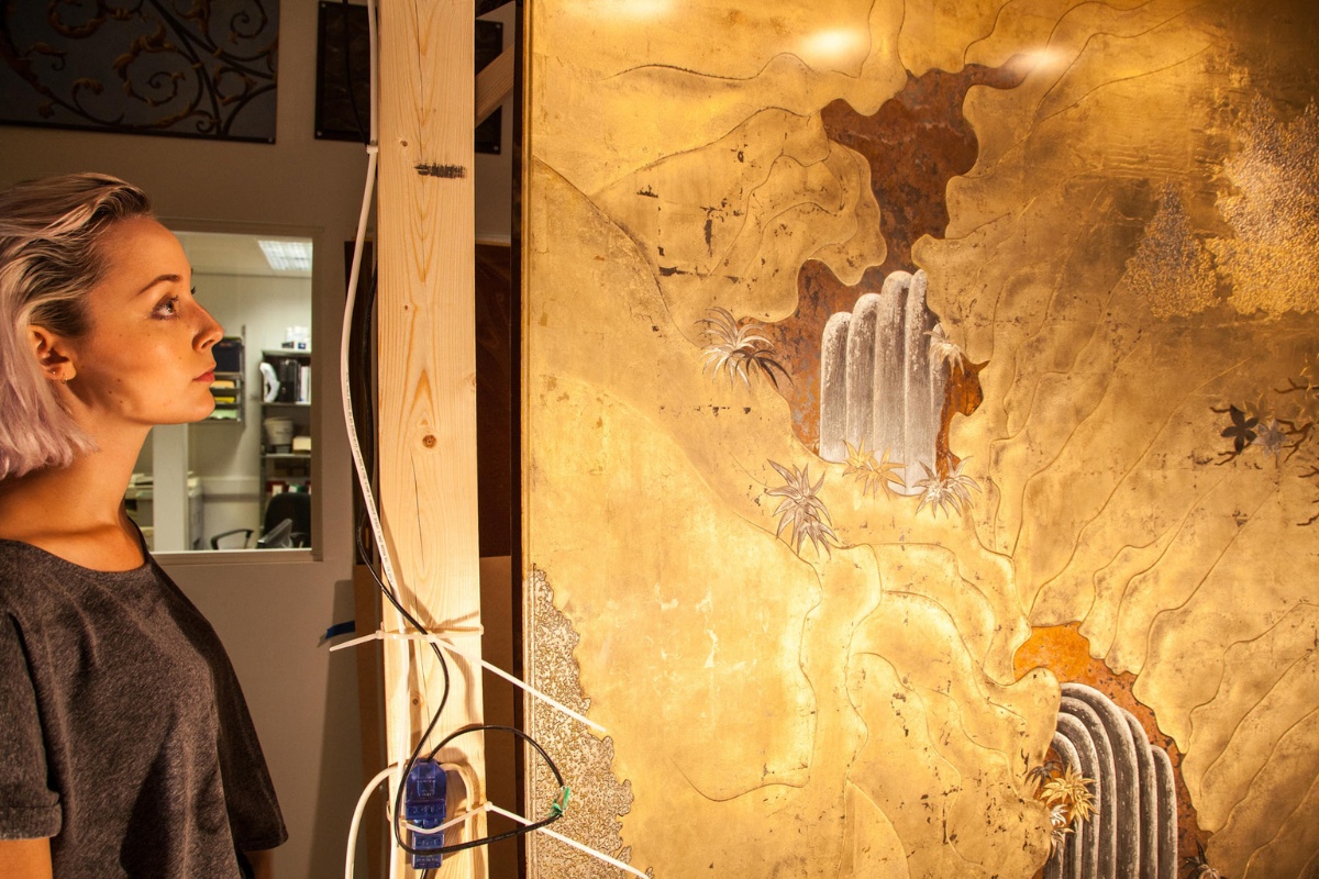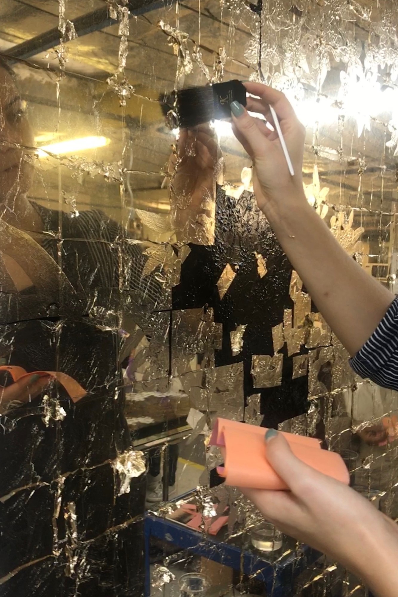 Application of gold leaf to the reverse of glass Verre Églomisé at DKT studio