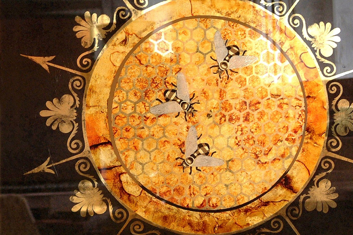 During the creation of our Verre églomisé artworks, we employ the same gelatine adhesive used in the water-based technique. The adhesive is dissolved in water and then carefully “floated” over the glass surface, allowing for swift application of the gold while the surface remains moist. This process demands that our artists work with both great speed and skill to accomplish these precise and intricate works.