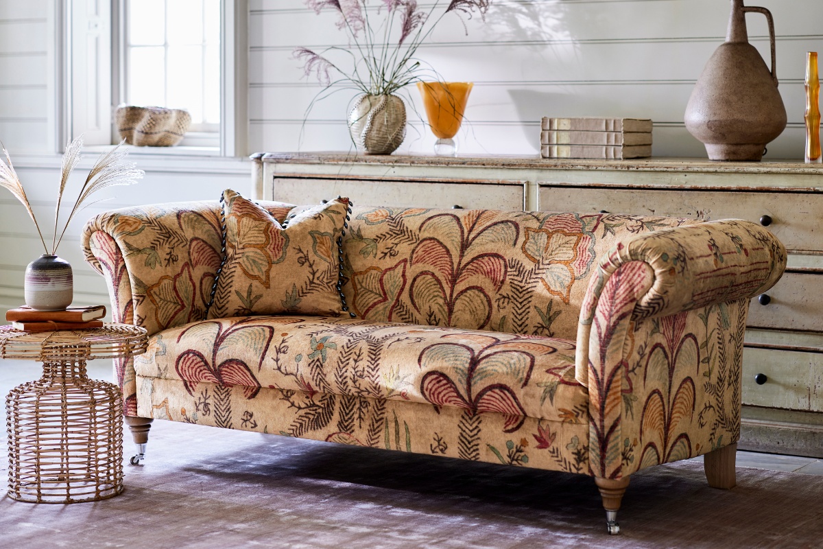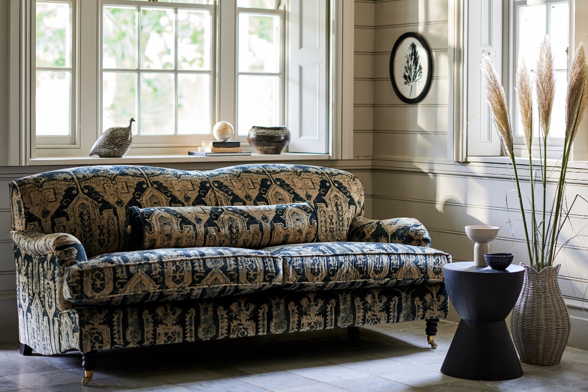 The beauty of velvet is that it complements any number of sofa styles, from sleek, minimal shapes to traditional designs. Velvet can be shown off to stunning effect on a curvy 1950s-style piece yet will look equally glorious on a classic tufted sofa, where buttoning allows the pile to catch the light in different ways. And whilst it is of course important to consider how your choice of velvet sofa will look in the scheme, it is just as crucial to think about how it will be used: an elegant, streamlined design might be perfect for a room that is primarily intended for formal gatherings, but it will probably not be ideal if it is destined for the household to pile onto for a movie night. With its turned legs and soft scrolled arms, the sofa pictured here is a classic piece that lends itself well to traditional settings whilst offering a good level of comfort. The style of the piece is perfectly complemented by our Chora printed velvet; a timeless design inspired by a traditional Turkish kilim. The monochromatic colour palette makes this print particularly versatile – perfect for bringing a touch of pattern to a neutral scheme.