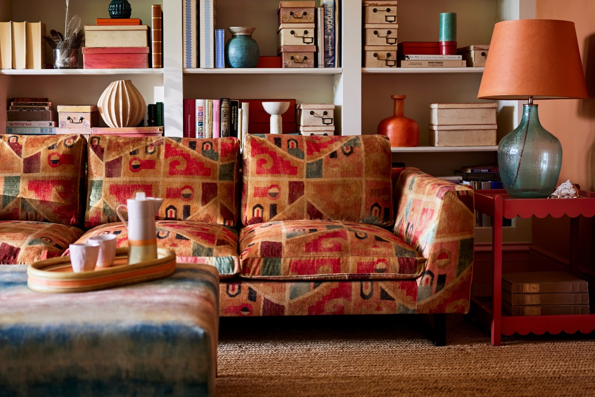 It may well be that you already have a scheme in place when choosing your new velvet sofa, in which case there will be several factors to consider, from the colour palette of the existing décor to the style of the pieces you already own. The striking, angular shape of this sofa fits well with the room’s bold joinery, while the arresting abstract print – Kichana, which is based on a Peruvian document – picks up on the warm terracotta colours of the walls, lampshade and side table, as well as the aqua accents of the accessories and the ottoman’s velvet stripe (Cosmic, our versatile ombré design). Conversely, you can use the design of a velvet sofa to inform an entirely new décor: let the colour options and style of the print – or simply the colour, if you are choosing a plain velvet – guide your choice of pieces, from accessories to cushions, throws and rugs. And when it comes to selecting more fabrics for the scheme, don’t be afraid to introduce different textures: velvet sofas team beautifully with a variety of designs, from linens to wools, silks to leather.