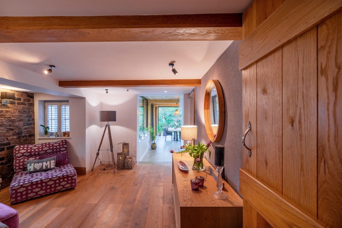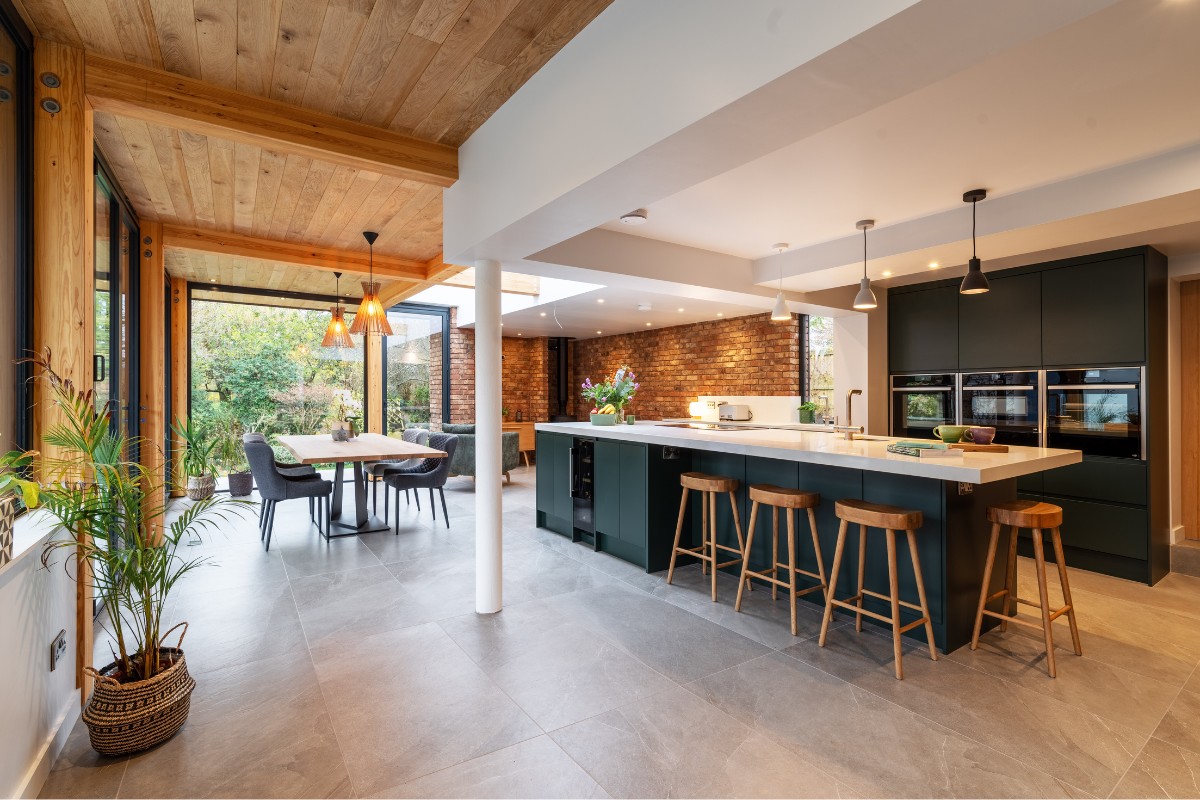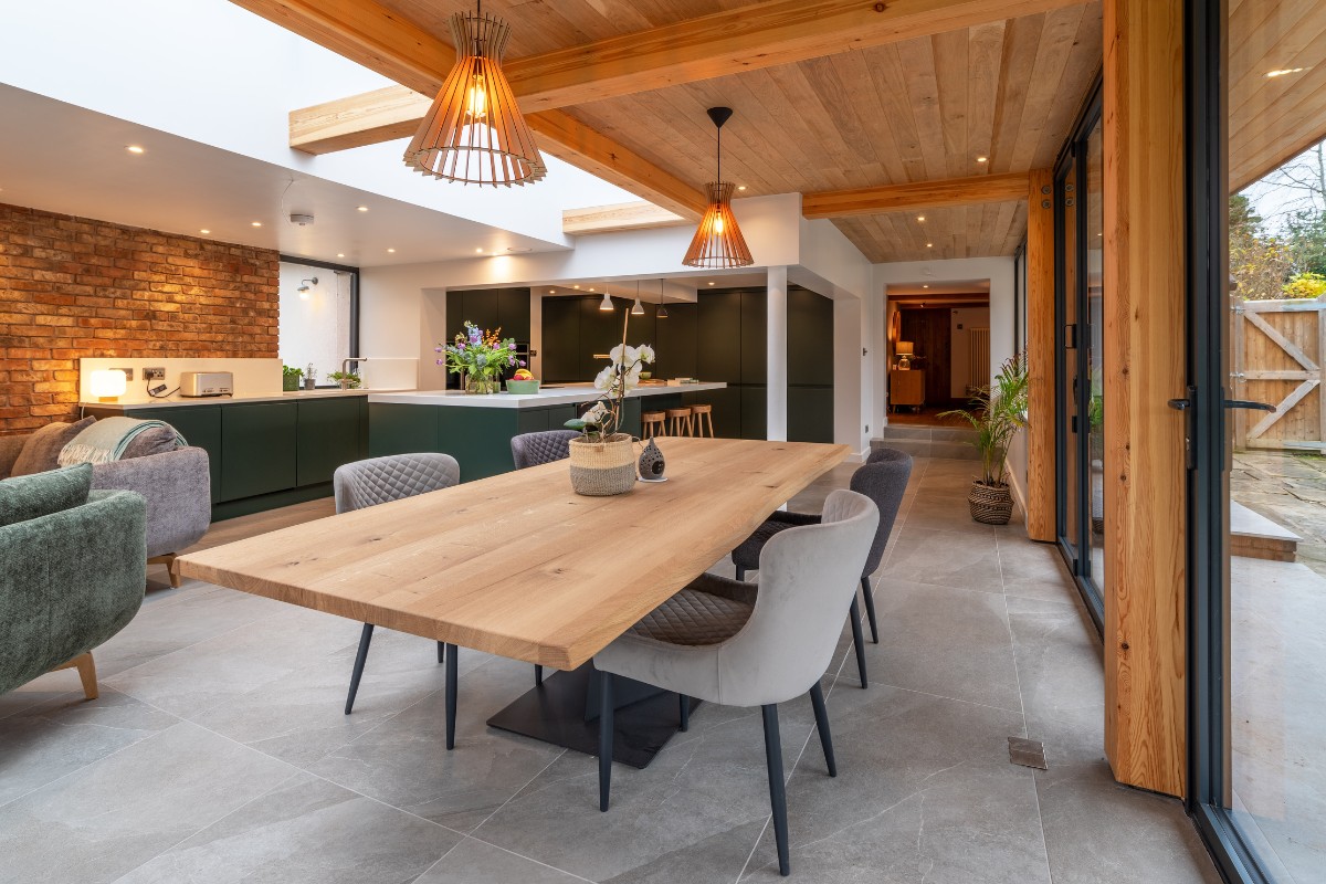19th March 2024 | IN INTERIOR DESIGN PROJECTS | BY SBID Share Tweet Pinterest LinkedIn This traditional cottage in Cheshire has been adapted to meet the exact preferences and lifestyle needs of our clients. The existing kitchen was cramped with a very low ceiling meaning they couldn’t properly enjoy cooking and entertaining – something that was really important to them. Our solution was to build a bespoke contemporary extension that integrates with the existing property. Kimble Roden Architects & Designers This single storey rear extension steps down from the existing ground floor entrance level opening out into a large open plan kitchen, sitting and dining area. We incorporated the existing kitchen space but dropped the internal floor level so that it connected seamlessly with the new extension. By building a brick wall along the boundary with the main road, we created a visual and acoustic barrier and reoriented the view towards the garden. Kimble Roden Architects & Designers For this cottage transformation, we kept continuity between the old and new interior, with an open aspect from the front door that led through the existing entrance room and through to the new extension. The rhythm of the existing oak beams are translated into the new glulam frame accentuating the connection, and the contrast between the existing space and the light filled extension creates a visual and physical link the minute you come through the front door. Kimble Roden Architects & Designers With full height bi-fold doors to the rear and side, the new kitchen now feels part of their lovely garden and gives them a sense of being immersed in their surroundings – in all weathers. Nestled within the embrace of nature, this kitchen exudes a sense of belonging, as if it were an integral part of its lush surroundings making it the perfect place for dinner parties and family get-togethers. Kimble Roden Architects & Designers The main part of the structure is a glulam frame which we have left exposed internally, with a long slot roof light centrally over the space which helps define the kitchen, dining and sitting zones. Because the glazed element of the elevation is south facing, we introduced a deep overhang creating a covered walkway and ensuring solar shading in summer time. Kimble Roden Architects & Designers By leaving the wood structure exposed, with its natural grains and hues, and also leaving the brick wall exposed internally we have created a warm and textured backdrop for the interiors. We have used a contemporary colour palette that complement these materials, elevating the design and creating focal points within the extension. The dark green kitchen echoes the tones of the garden whilst the timber accents tie in with the structural frame. The stone effect porcelain tile runs from the inside to the outside further under pinning the sense of being immersed within the garden. Kimble Roden Architects & Designers This residential project beautifully illustrates the art of blending contemporary design with traditional charm to create a space that is both visually stunning and highly functional. By carefully considering the clients’ desires, architectural constraints, and environmental factors, we have succeeded in crafting an extension that seamlessly integrates with the existing property while meeting the needs of modern living. Every detail of this extension has been thoughtfully planned to enhance the overall living experience and breathe new life into a traditional home. About Kimble Roden Architects & Designers Kimble Roden’s practise mission is to create outstanding architecture and interior projects tailored to meet the needs of our clients. We will bring an outstanding level of creativity and technical brilliance to residential projects. Whether you are building a new home, renovating, extending or have an interior design project we can offer a turnkey solution for your project and bring a level of professionalism that sets the standards in client care. We will provide you with complete peace of mind and add value to your home. Visit Profile If you’d like to feature your news or stories on SBID.org, get in touch to find out more. If you’d like to become SBID Accredited, click here for more information.