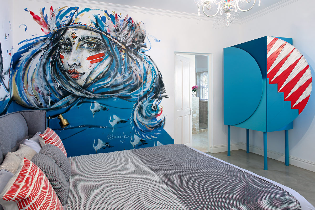 12th June 2019 | IN PROJECT OF THE WEEK | BY SBID Share Tweet Pinterest LinkedIn Project of the Week This week’s instalment of the #SBIDinspire interior design series features a typical Cape Dutch style house with a traditional thatch roof in the village of Franschhoek with a quirky, residential design. The vast white walls in this sunny Cape Town home takes full advantage of the abundance of sunlight to create and accentuate the feeling of space, letting the light flood throughout the property. With the bright, white freshness of this stunning holiday home, ACID+ integrated the client’s love of street art to inject the property with personality. Using authentic South African artworks and hand painted murals by South African artists to punctuate this white-washed home with vibrant splashes of colour. Sector: Residential Design Company: ACID+ Project: Franschhoek Cape Winelands Project Location: Cape Town, Africa What was the client’s brief? To create a comfortable, creative interior and make good use of the fabulous outside space and views. The house was purchased on a whim by the clients when they visited Cape Town and the Western Cape for the first time and saw it advertised on their way to the airport to fly home. They fell in love with the area. The house is a typical Dutch Cape style house with a thatch roof in the village of Franschhoek – beside the fabulous DeLaire Graff wine estate and extraordinary Babylonstoren wine farm in the Cape Winelands. The house also comprises of a separate guest suite with its own entrance, garden, terrace and even its own kitchen for guests to use, so they are able to enjoy privacy and meet up with other friends for sundowners [South Africans are avid Sundowners. Meeting up to drink the fabulous local wines and craft gins in the evenings while the sun sets]. The house is named ‘Rehoboth’, meaning a place to flourish. It was therefore important to balance social spaces whilst also offering privacy throughout the interior design scheme. What inspired the interior design of the project? It’s really all about the views and the garden. The garden was designed by the previous owner and the renowned, late landscape architect Anne Sutton when the house was built 12 years ago. Fragrant Lemon blossom, lavender, Iceberg roses, Murraya exotica, rosemary and snowdrift Thyme make for a perfumed Mediterranean garden. The weather lends itself to almost year-round alfresco living, and that’s exactly what appealed to the clients; a Mediterranean climate in beautiful surroundings with excellent food and wine. The garden wraps around all sides of the house with various sitting, lounging, sunbathing and dining options to be used at different times of the day. The owners inherited the full-time gardener whom has cared for the garden since its creation. The house and gardens get sun all day from early morning to sunset and the separate entrances to the bedrooms means there is no post pool dripping through the house. The client is a lover of street art, so we wanted to integrate this into the design of the home – bringing this concept throughout the interior, as well as on the exterior. The mural in the front garden was executed by a local street artist Wayne Becks. The mural in a guest bedroom is by Ana Kuni, a Ukranian model and artist living in Cape Town. Both artists works captured the owners eye instantly. What was the toughest hurdle your team overcame during the project? The time of year the interior fit out was being done was over the Christmas holidays which was – unknowing to us – the only time of the year when everything closes down. It’s like Europe in summer when factory orders close. Everything closes down in October to February. It was their summer holiday! The time when everyone goes home to visit their families. This meant we had to ship furniture into Cape Town from Hong Kong which was fraught with difficulties and not something we would wish to repeat. This caused an ongoing saga for about 5 months! What was your team’s highlight of the project? When the furniture finally arrived it was in perfect order. Not a single scratch and everything fitted in perfectly. All the art used to punctuate the property with pops of colour was purchased in South Africa and is by South African artist, filling the home with unique and colourful art which they loved. Again – everything came together in the end and worked together perfectly! Questions answered by Anji Connell, Design Director at ACID+ Anji Connell Interior Design If you missed last week’s Project of the Week featuring a contemporary and environmentally-friendly design for a sustainable family home in Mexico City, click here to see more. We hope you feel inspired by this week’s residential design! Let us know what inspired you #SBIDinspire ACID+