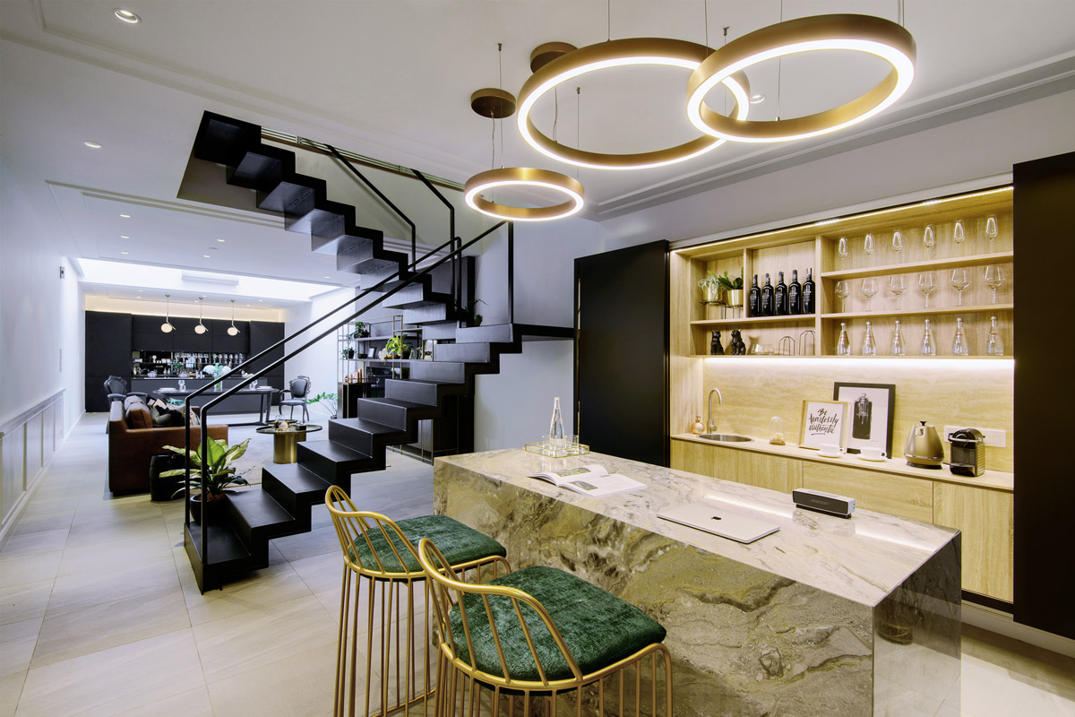 30th January 2019 | IN PROJECT OF THE WEEK | BY SBID Share Tweet Pinterest LinkedIn This week’s instalment of the #SBIDinspire interior design series features a modern-day luxury home that manages to combine both old-school opulence and contemporary cosiness under the same roof. Superior air ventilation incorporated into the interior of this property allows it to feel larger and more spacious. A stark contrast to the dark and cramped image of a pre-war house. The house is equipped with three bedrooms, which are hosted on the upper levels. Sticking to the modern European theme, the first bedroom features a soft, neutral palette, enhanced with soft blue furnishing & a semi open wardrobe. The second bedroom comes with a softer, baby blue accent, a sleek, custom-made wardrobe / dressing table as a nifty space saving highlight, as well as a hotel-like bathroom with arabescato marble feature wall. Warm, earthy tones blanketed the final bedroom with a restful atmosphere, a clear glass door wardrobe and an en-suite bathroom. Company: NEVERMORE Project: The Irrawady House Project Location: Penang, Malaysia What was the client’s brief? For this project, our objective is very clear, we wanted to make the 15 foot wide pre-war terrace house open plan, to break away from the traditional pre-war house layout. Therefore we divided the space into 2 zones; the common area for the ground level and then personal and private spaces for the first floor. With this chosen layout we were able to maximise the usage and fulfil all the needs and requirements of the clients. On the ground floor, as we enter from the main entrance, we are greeted with the pantry and bar counter clad in beautiful Italian marble, complete with a pair of Reza Feiz’s Bride’s Veil bar stool; the space serves as a pantry / bar to offer space for storage and entertainment as one of the client’s needs and requirements for the design. The living space is housed further in the middle of the house; to be some distance away off the main road. The dining is located beside the living space right under the skylight; where ample day light is cast into the interior; perfect for energy saving through-out the day. As for the kitchen, all necessary facilities of a fully equipped kitchen are held within the smallest possible footprint at the end of the open layout. A hidden door leads towards the back yard which consist of the laundry and powder room. The room also features a sculpture-like spiral staircase fabricated in mild steel and finished with special rust. On the first floor, with the chosen layout, we are able to maximise the bedroom sizes, equip with bathroom for each room which typical pre-war houses do not have. Generous panes of glass are utilised to turn ordinarily opaque walls transparent, providing generous views in some surprising places. In one of the bedrooms, the bath is rendered in the manner of a boutique showcase, with generous stretch of windows putting the freestanding tub on display in the air-well with a fully imported Italian arabescato marble feature wall as the backdrop. For the guest bedroom, we wanted created a sense of privacy, it is located 10 feet away from the other bedroom and can only be access via the spiral staircase located at the far end of the house. The monochromatic basis of this bedroom is enhanced for eye pleasing variety with the introduction of greater range of wood tones in fabrics and architectural finishes. What inspired the interior design of the project? The elongated living room is connected with the kitchen, dining area and open bar area as the decor features a modern twist to classical European designs. Fitted with a daring open staircase, this bold design is further enhanced with the selection of large circular pendants & imported Italian marble counter. Gold finishes are thrown in to the interior design to elevate the overall look with a hint of glitz. Meanwhile, the living room, dining area and kitchen enjoy the warm glow derived from the skylight feature, giving the space a natural comfort, bathed in natural light. What was the toughest hurdle your team overcame during the project? Dealing with structural issues which related to the creation of the column-less, open plan interior within a typical pre-war terrace house; to resolve this, we came up with an “i” beam steel support to withstand the weight of the cast concrete flooring on the first floor. Also, the spiral staircase was not installed without difficulty as it had to be pre-fabricated at the workshop and then reinstalled at site. What was your team’s highlight of the project? For me this is definitely the results of the open plan layout! Also other elements of the interior design like the cantilever bath tub, the use of skylights throughout, the spiral staircase finished in rust paint, and a gorgeous moooi smoke chair! Why did you enter the SBID International Design Awards? We wanted to see where would stand on an international level and thought the SBID Awards would be the best platform for this! Questions answered by Chuah Say Yang, Creative Director and Chong Su Min, Design Director of NEVERMORE If you missed last week’s Project of the Week featuring a unique and inspiring home that pushes boundaries with a sophisticated balance of layers, click here to see more. We hope you feel inspired! Let us know what inspired you #SBIDinspire NEVERMORE | SBID International Design Awards 2018