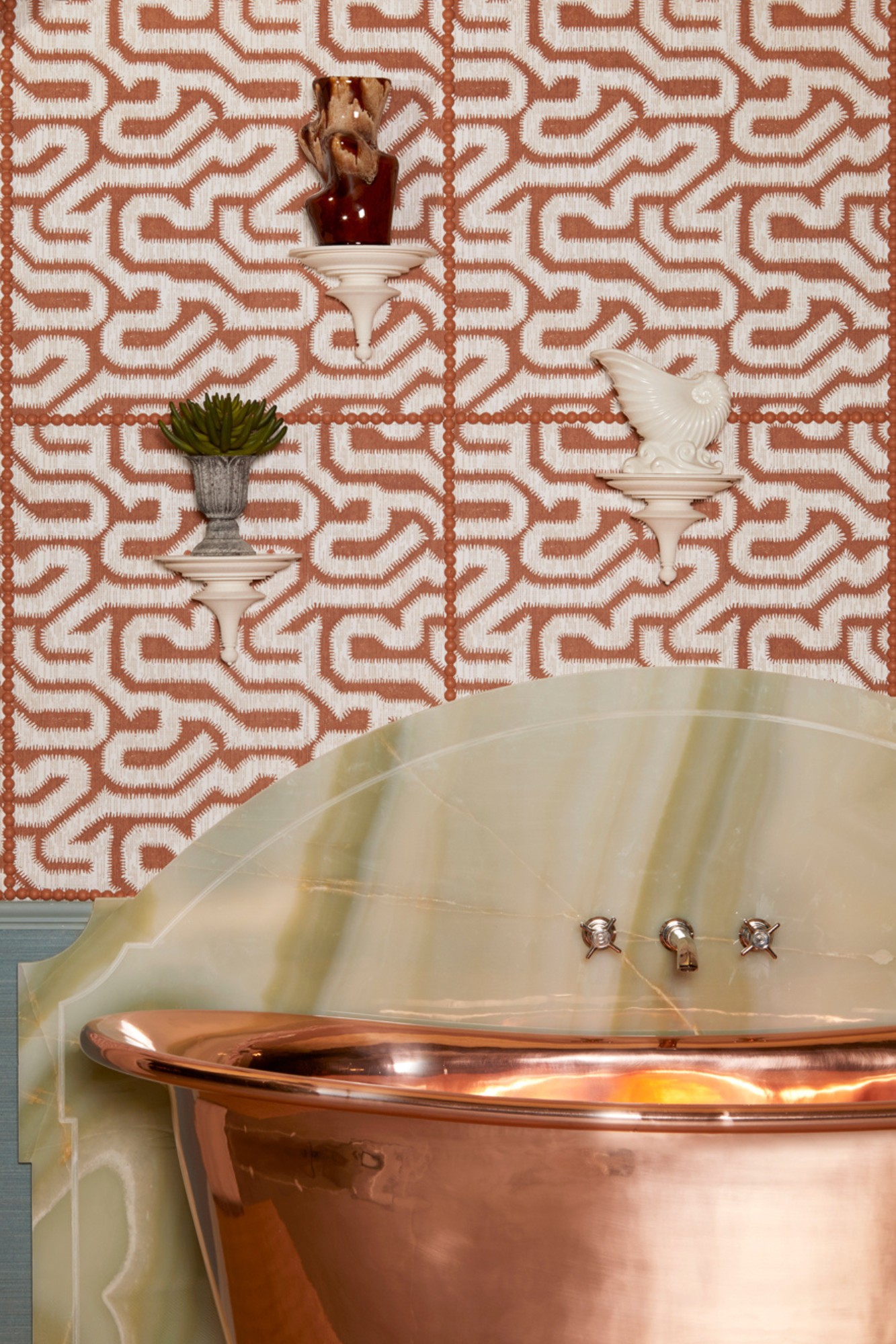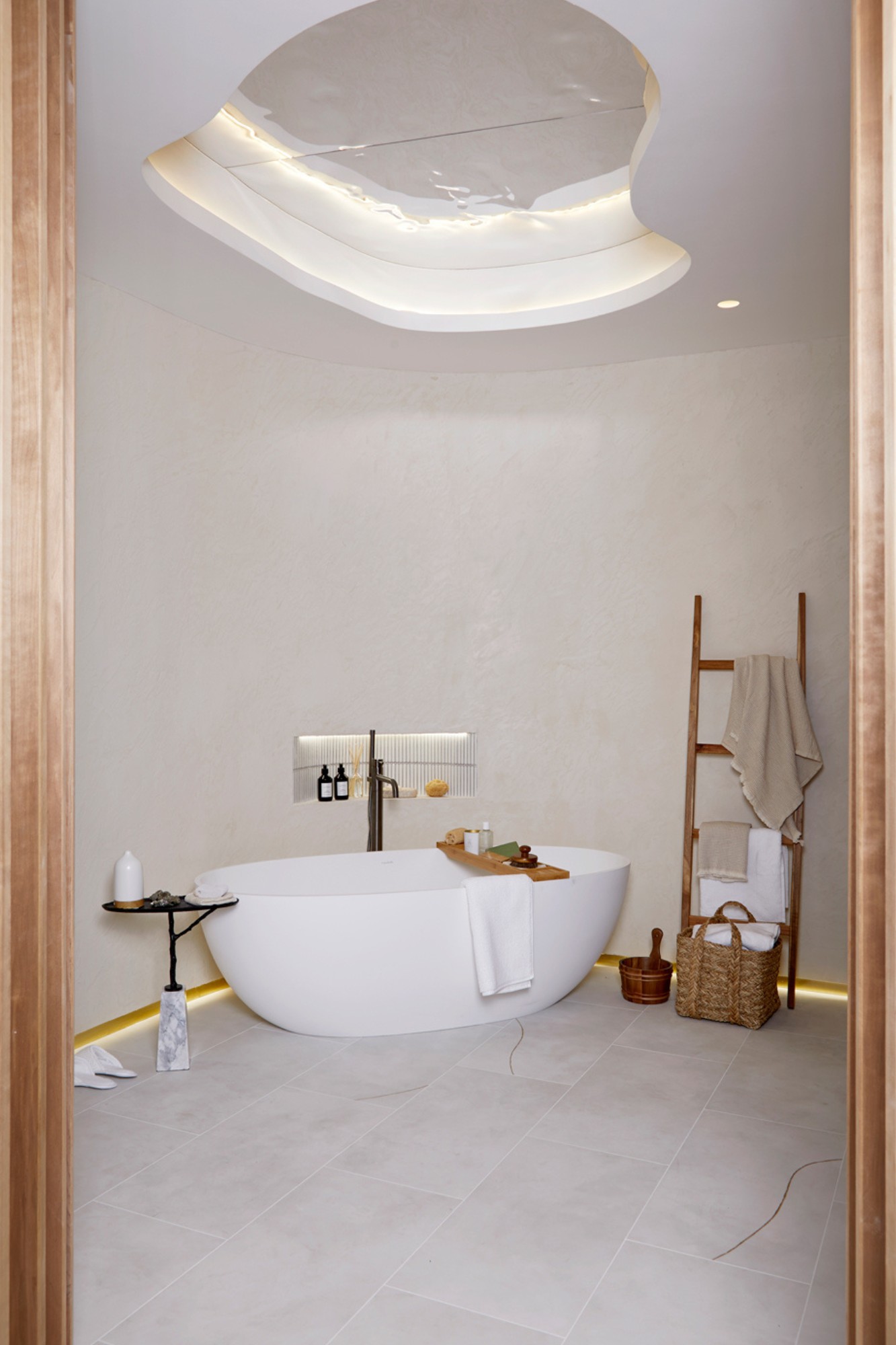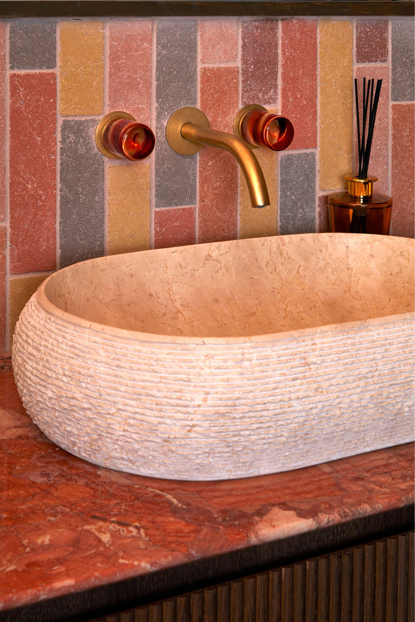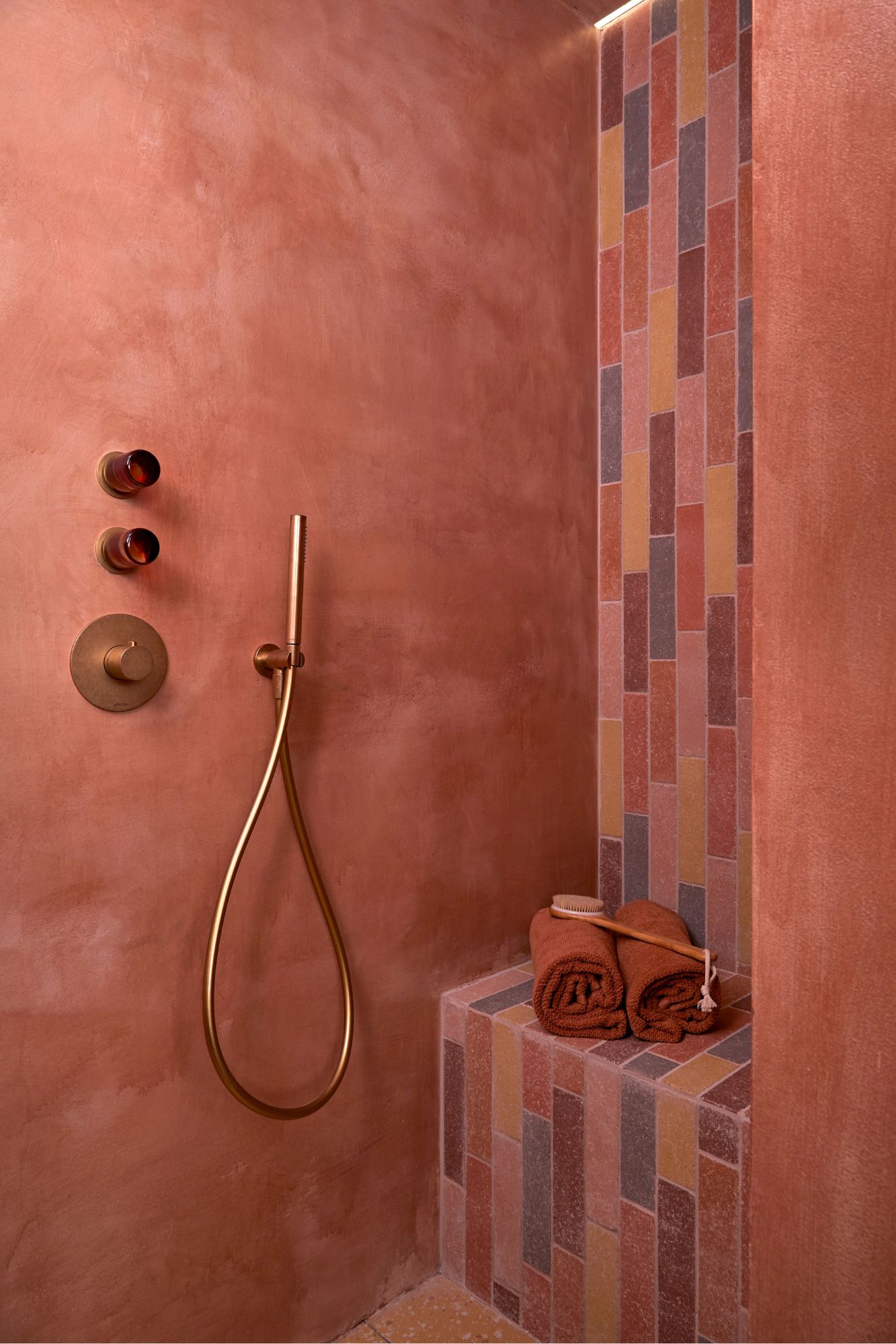 Bath: Seven Freestanding Bath in Sahara Matt by IdeaGroup - £3,681 Brassware: Venezia Wall-Mounted Basin Mixers with Nice Spout in Bespoke Pure Brass PVD, Venini Red Murano Glass Handles by Fantini - From £890, Nostromo Floor-Standing Bath Mixer in Standard Pure Brass PVD by Fantini - £4,043 Vanity: Bespoke Galiano Vanity in Brunette Oak with Marble Top in Breccia Rossa by Buto - £4,717 Basin: Petra Domed Oval Washbasins in Beige Stone - Price On Application WC: Shui Wall-Mounted WC in Linoby by Cielo - £1,015 Floor Tiles: Inclusion Classico Tiles in Matt - £88 Per Tile Wall Tiles: Cromie 15mm in Mixed Finishes - £3 Per Tile Mirror: Bespoke Mirror by Buto - £1,667 Lighting: Vintage Pendant and Wall Light
