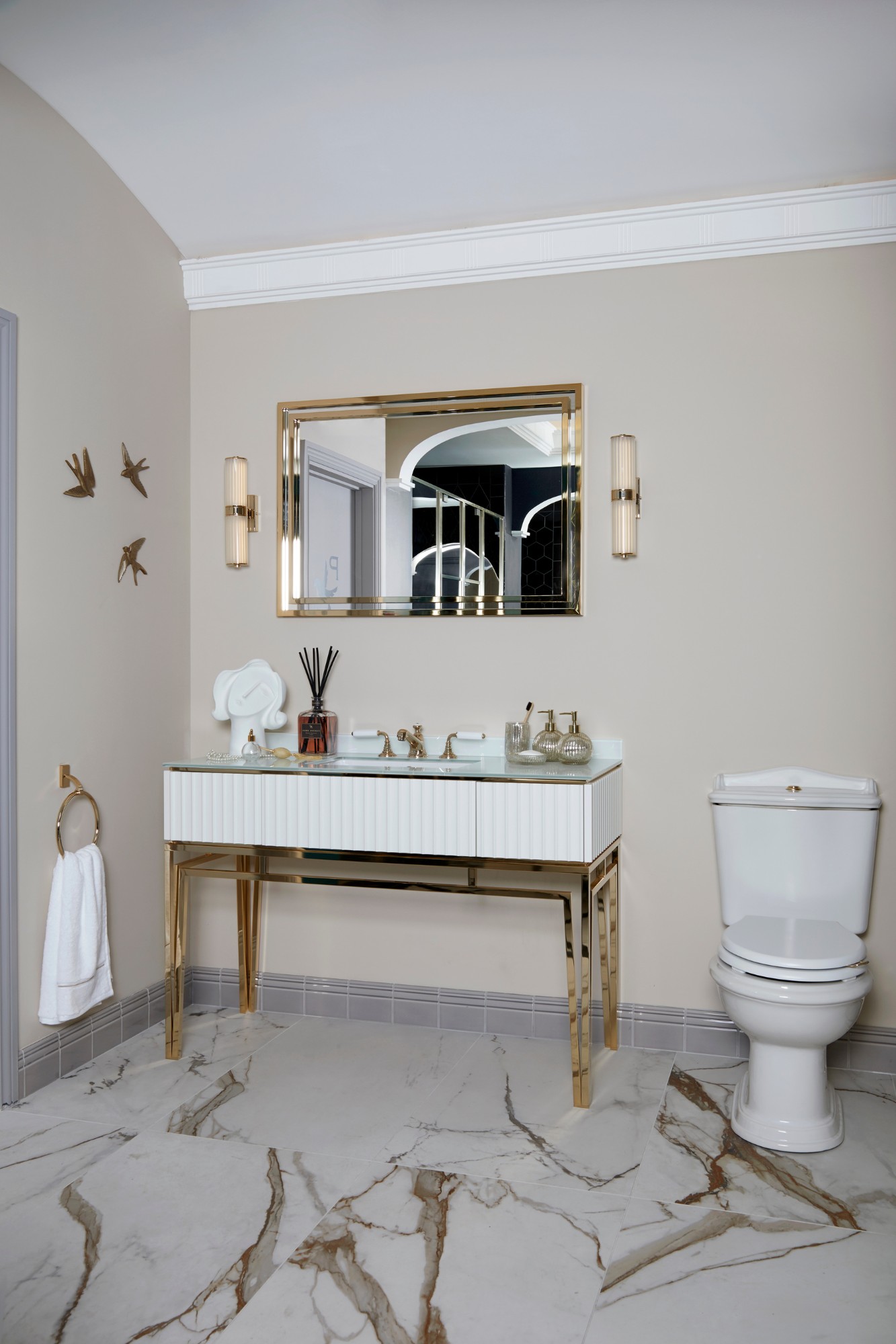 “The shower room was conceived with meticulous attention to detail,” shares the Design team. “We extended the gold theme into this space, incorporating brassware selections from our Original and Waterloo ranges. To maintain a cohesive aesthetic, we colour-matched the brassware’s finish with the basin stand, towel radiator, and Matki Eauzone shower screens, strategically installed in the corner to optimise space.”