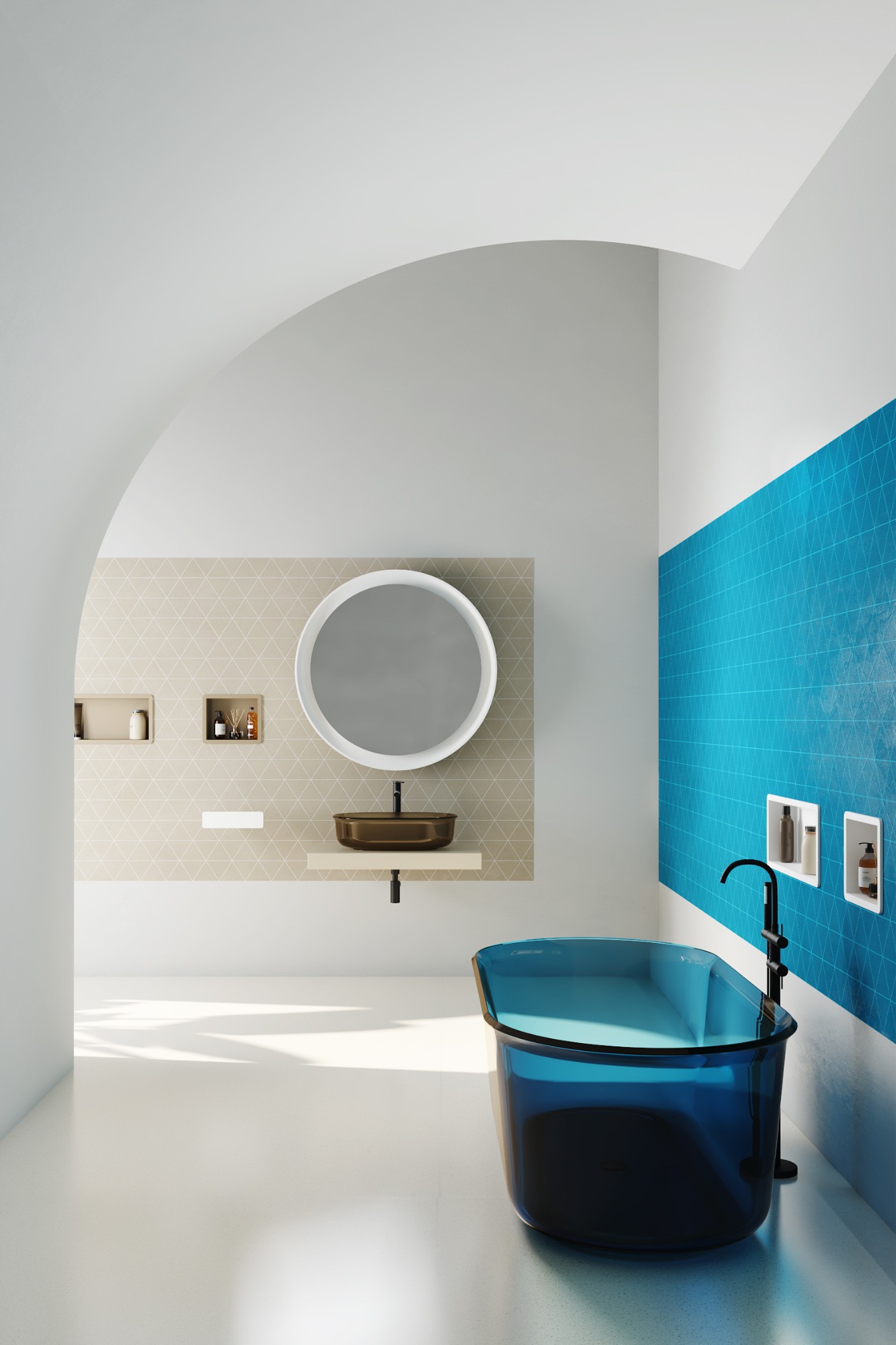 Organic, curvy, and free-flowing irregular shapes have come to the fore. Reminiscent of fluid ripples, puddles, lakes, and rivers, these non-geometric shapes and asymmetrical patterns break away from rigid lines and uniformity – a perfect counterbalance to the often-found harsh lines in bathrooms.