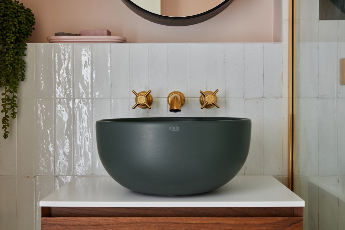 Brushed Gold brassware features throughout the bathroom, all specified from C.P. Hart’s exclusive and highly sought-after Epoch collection. In the shower, a three-way diverter controls the overhead shower, hand shower, and bath filler. The Epoch wall-mounted mixer was chosen for the basin, installed above the Cielo Shui Washbowl in ‘Muschio’ to free space on the Cubik vanity.