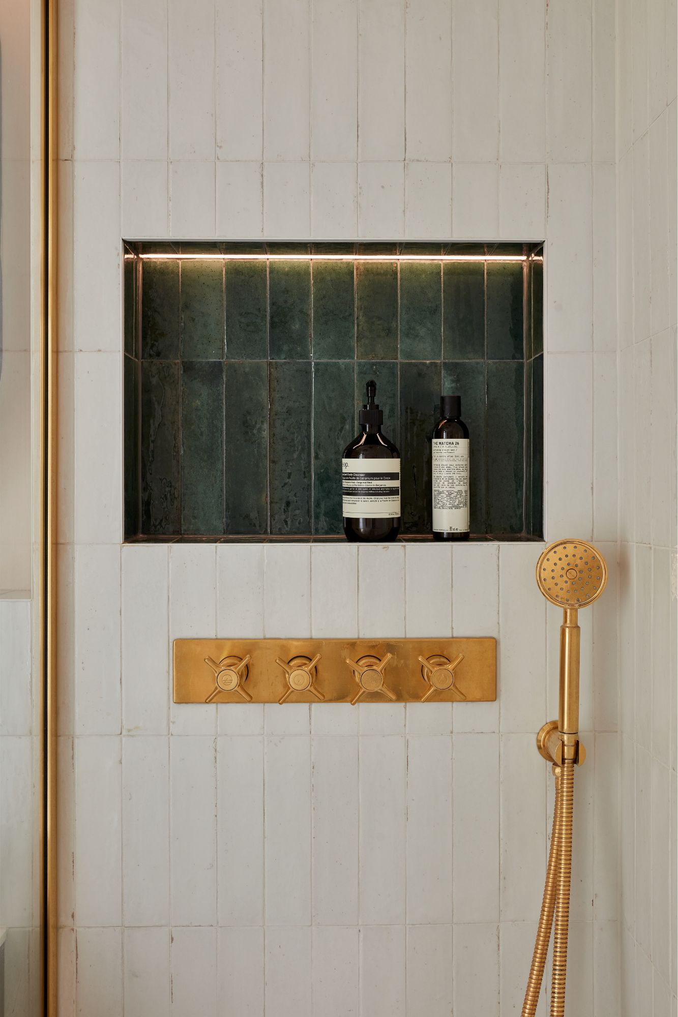 “To add more depth and visual interest, we replaced the ‘White’ Luminous Lume tiles with their ‘Green’ counterparts in each niche,” shares the team. “Both the niches and Astro Tacoma Twin light, installed above the mirror cabinet, are dimmable – the perfect year-round ambience setter.”