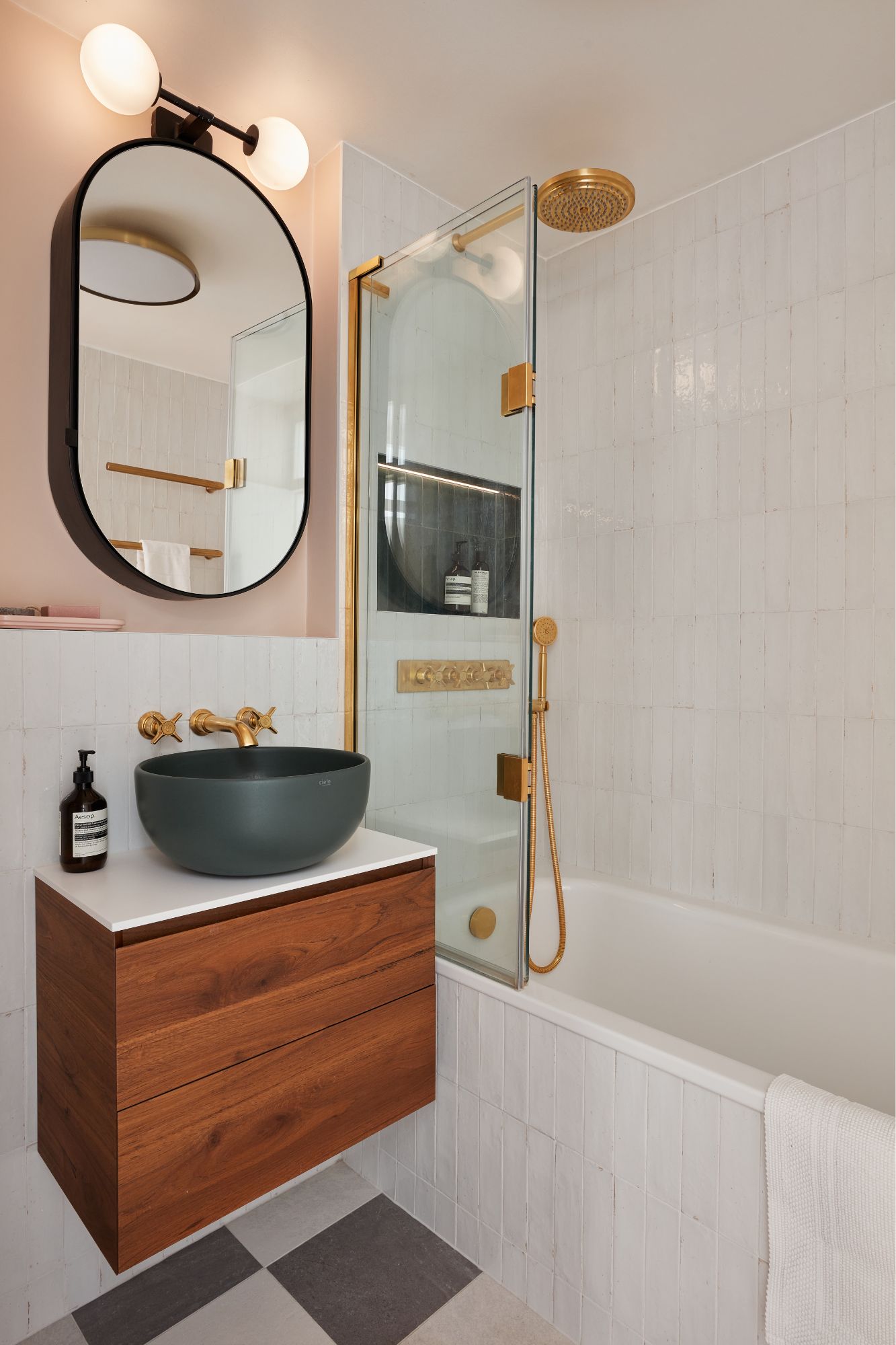 Farrow & Ball’s ‘Middleton Pink’ finishes the bathroom with playful charm.