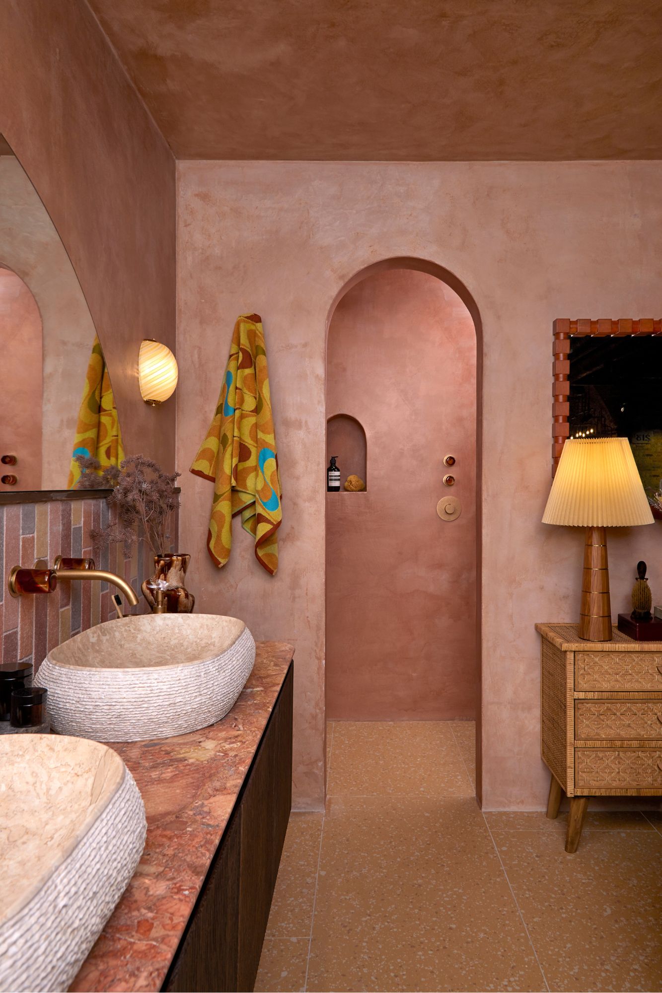 “Living in the coastal village of Deià, I was influenced by the local Mallorcan landscape and Balearic interiors,” Matthew adds. “The sunset’s pink-gold glow inspired the palette; sand-toned terrazzo, blush pink marble and concrete, rosewood, plaster walls, brass, and rattan.”