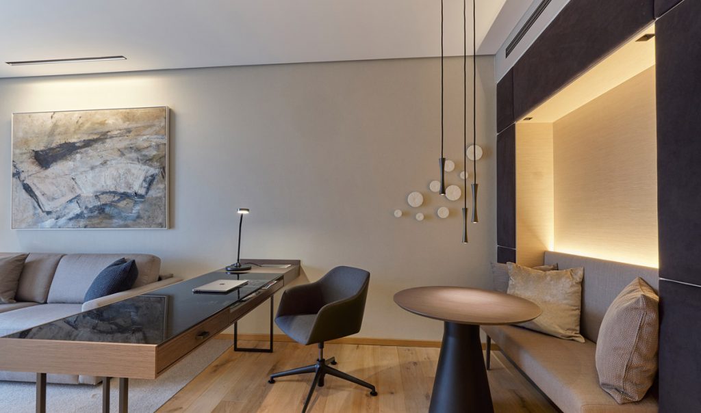 The living area has been designed with a strong entertaining social element in mind, with a variety of different zones. Each zoned area was as important as the other. Bang & Olufsen equipment has been installed for a high-tech finish, ideal for meetings, and the client wanted a perfect backdrop from behind as a Zoom screen for international meetings. The office is set up in the living space at the centre of the apartment. A premium Italian leather desk and chair complement the dark wood and brass detailed designer desk, blending together for an incredibly opulent final product.
