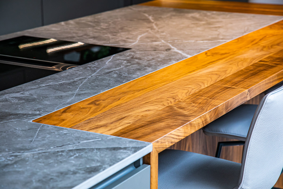 Within the central island, Dekton® blends effortlessly with rich walnut, which creates visual contrast and provides a warm tone for the breakfast bar area with its high stools for snacks and coffee. The BORA Professional extractor hob in an all-black steel finish sits neatly within the surface while antique brass pendant lights from Italy drop stylishly from above. The slim profile of the worksurface beautifully enhances the elegance of the appliances and kitchen furniture, while the colour palette is warm and inviting, creating a relaxed, contemporary look.