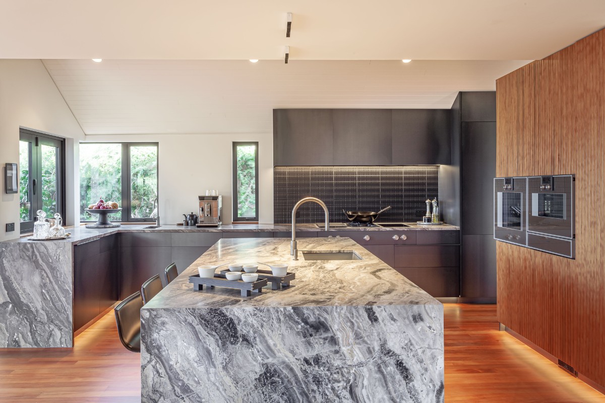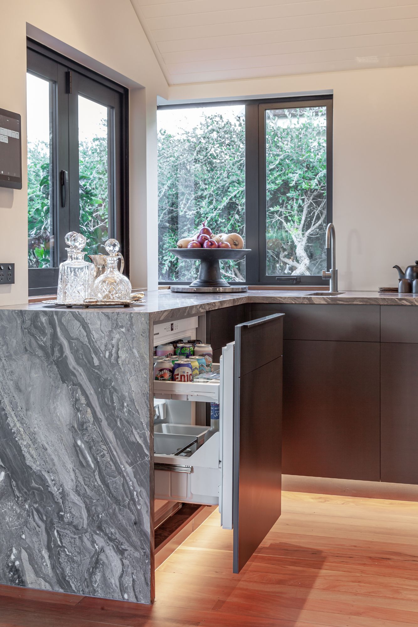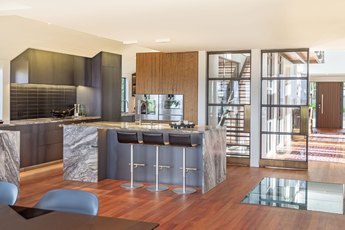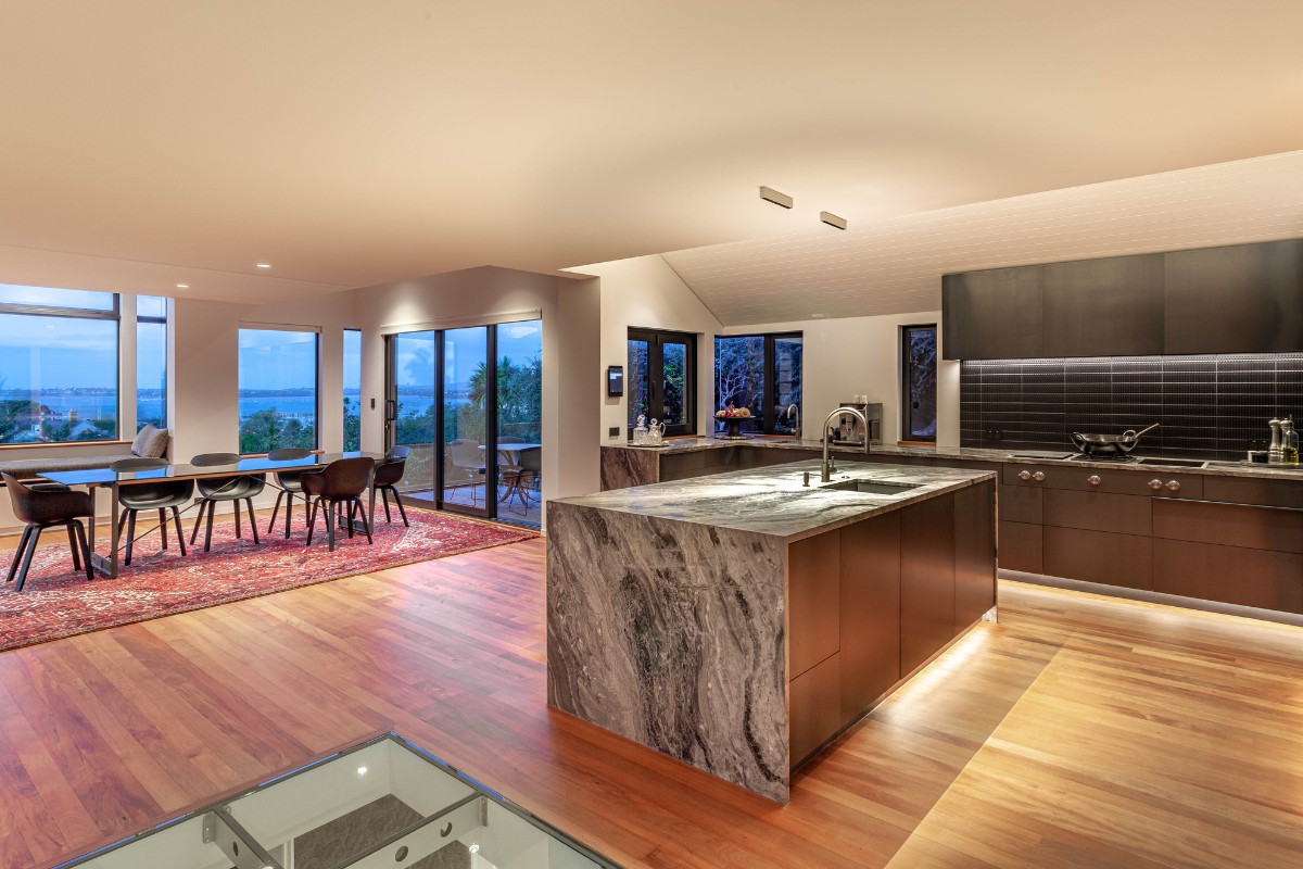 The expat owners of this 1990s architecturally designed home returned to New Zealand for their retirement and called upon the designer to renovate their kitchen living area. They wanted to ensure it would fit with the home’s existing architecture and, as avid cooks, needed a much larger space to comfortably use. The wanted to enhance the harbour views the room enjoyed which was constrained by walls on entering the space.