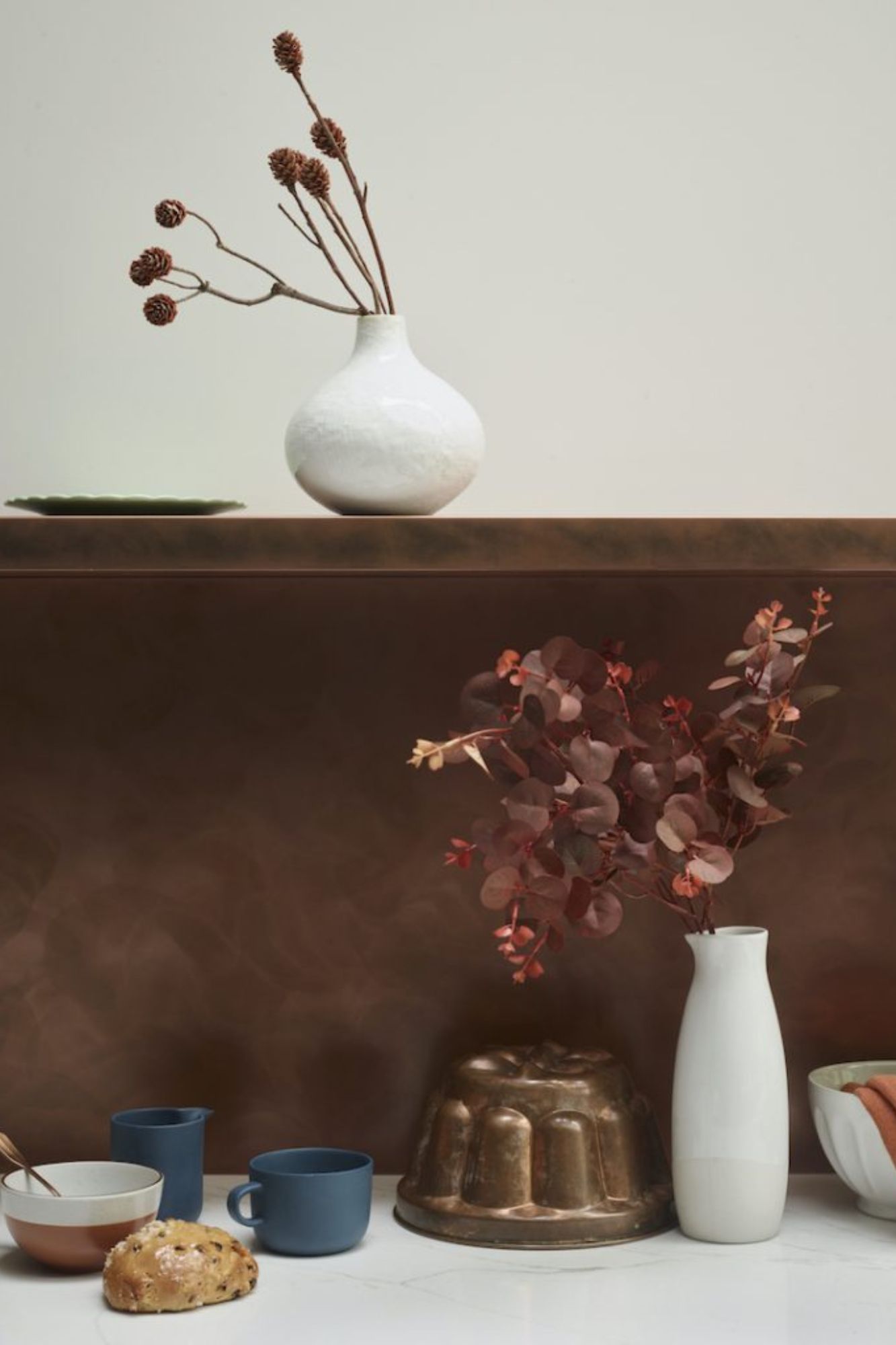One of the easiest ways to work the earthy neutrals trend in kitchens is by integrating natural materials like wood and stone. Timber toned cabinetry, worktops, and open shelving in warm, natural finishes can dramatically shift the ambient temperature of a neutral kitchen. Similarly, stone elements – whether they are marble-inspired quartz or natural stone splashbacks – will help reinforce the connection to outdoors. Patinated metallic finishes in warm copper tones dial into the terracotta trend, without disrupting the serene atmosphere of a soothing neutral scheme.