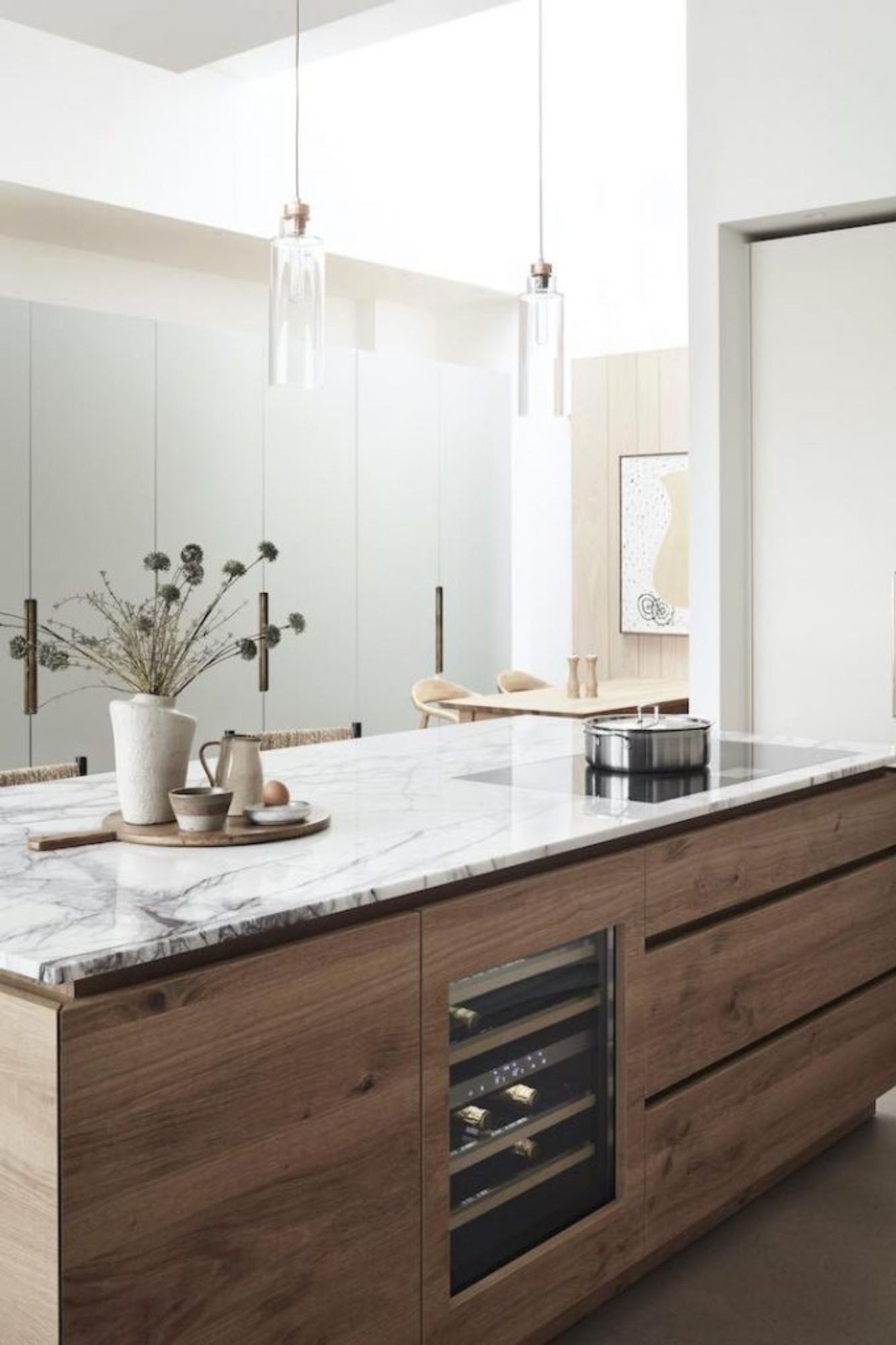 Wood has always underpinned Japandi’s warm simplicity. In 2025, Roundhouse Design’s team is embracing wood’s individuality more deeply than ever by celebrating unusual grain patterns, textural effects and considered installations. A recent project named Bulpitt showcases bookmatched crown-cut oak veneer that stretches across handle-less push-touch cabinets, creating movement and intrigue. By highlighting the tree’s natural heritage, a luxury bespoke kitchen feels both grounded and inviting. To discuss how wood can shape your bespoke Japandi kitchen, book a design consultation with Roundhouse experts.
