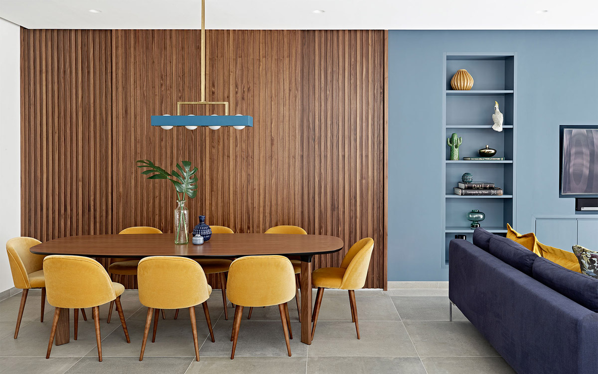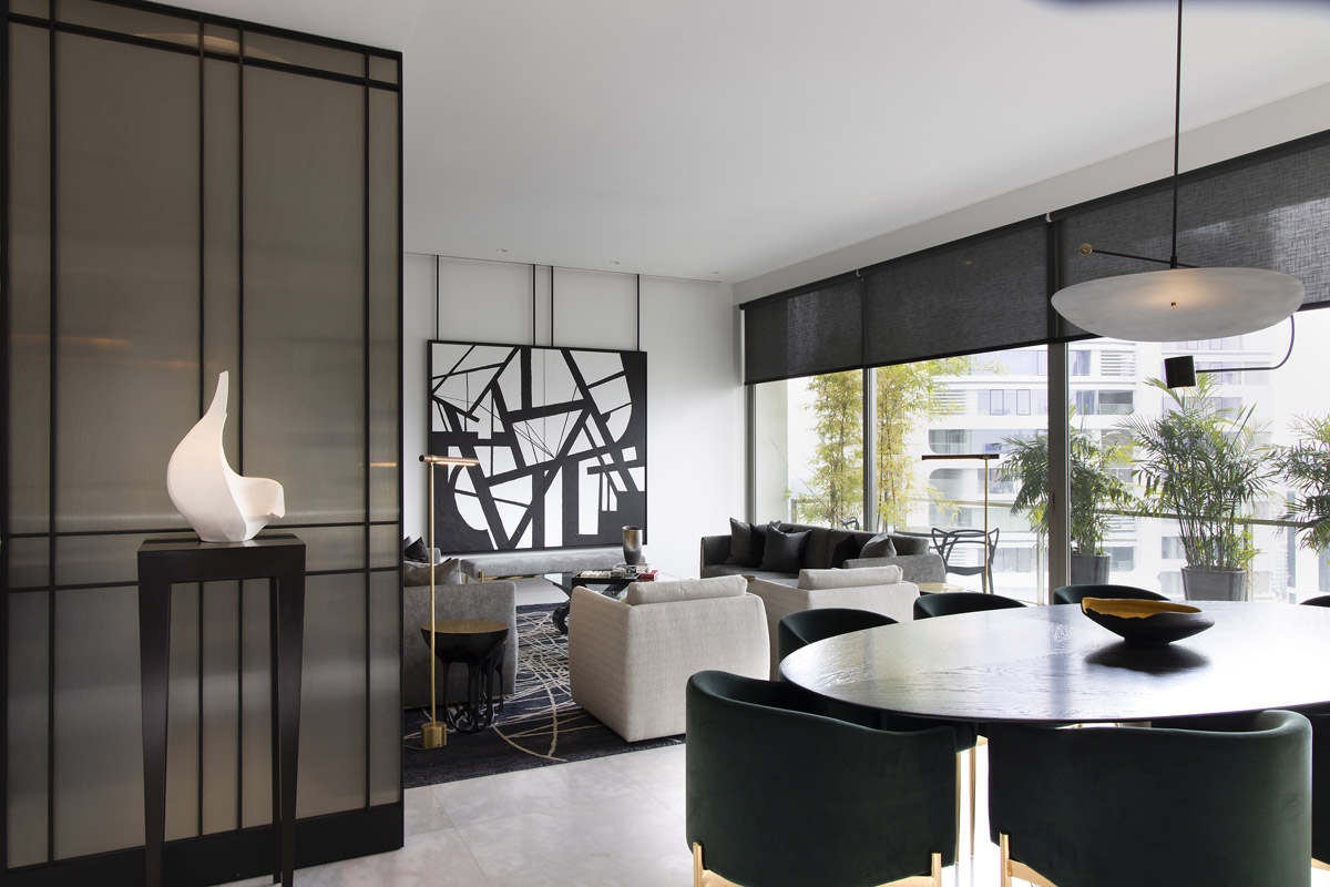 Based closely on an aquatic theme, the use of blue accents and fluid lines infused a sense of serenity associated with the attributes of water. Engulfed by sleek, stylish furnishing details, this sophisticated design serves as a contemporary upgrade to the apartment while retaining the architectural brilliance of its structure. Functioning as a sanctuary and a place to entertain, the aquatic themed design, inspired by the pool, instinctively emboldens the interior with an aesthetic that echoes the chicness and grandeur of a home located at the heart of a city.