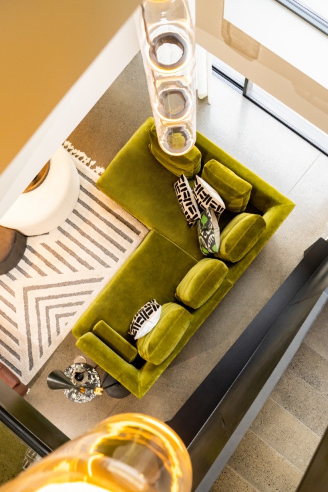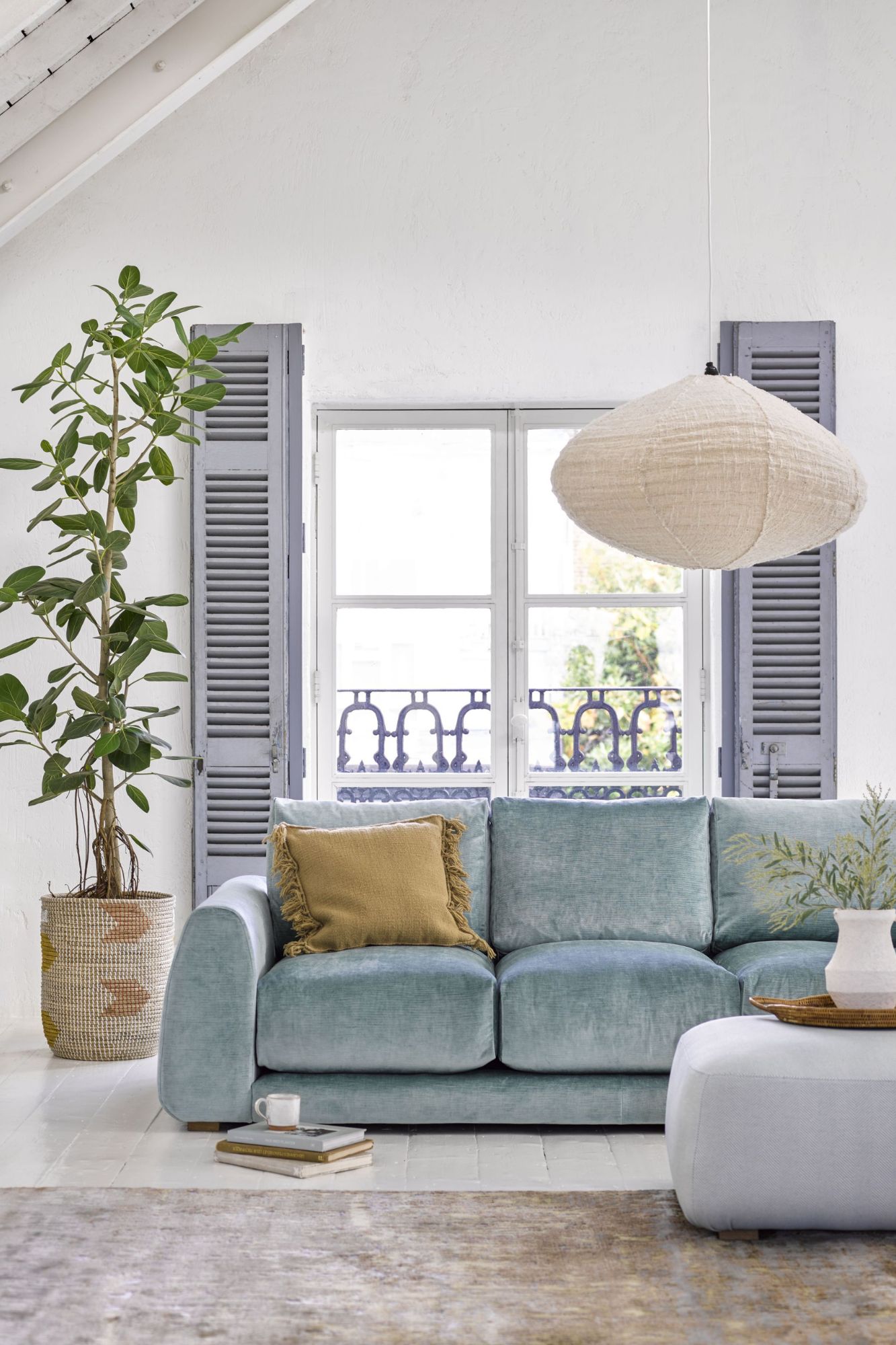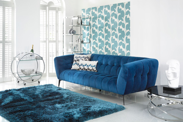 It may well be that you already have a scheme in place when choosing your new velvet sofa, in which case there will be several factors to consider, from the colour palette of the existing décor to the style of the pieces you already own. The striking, angular shape of this sofa fits well with the room’s bold joinery, while the arresting abstract print – Kichana, which is based on a Peruvian document – picks up on the warm terracotta colours of the walls, lampshade and side table, as well as the aqua accents of the accessories and the ottoman’s velvet stripe (Cosmic, our versatile ombré design). Conversely, you can use the design of a velvet sofa to inform an entirely new décor: let the colour options and style of the print – or simply the colour, if you are choosing a plain velvet – guide your choice of pieces, from accessories to cushions, throws and rugs. And when it comes to selecting more fabrics for the scheme, don’t be afraid to introduce different textures: velvet sofas team beautifully with a variety of designs, from linens to wools, silks to leather.
