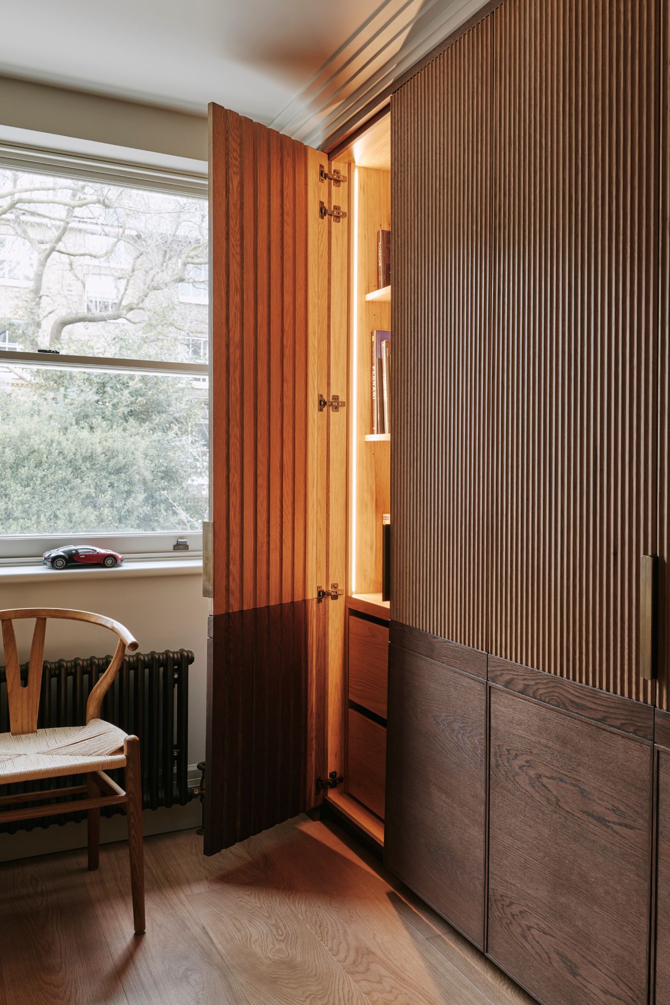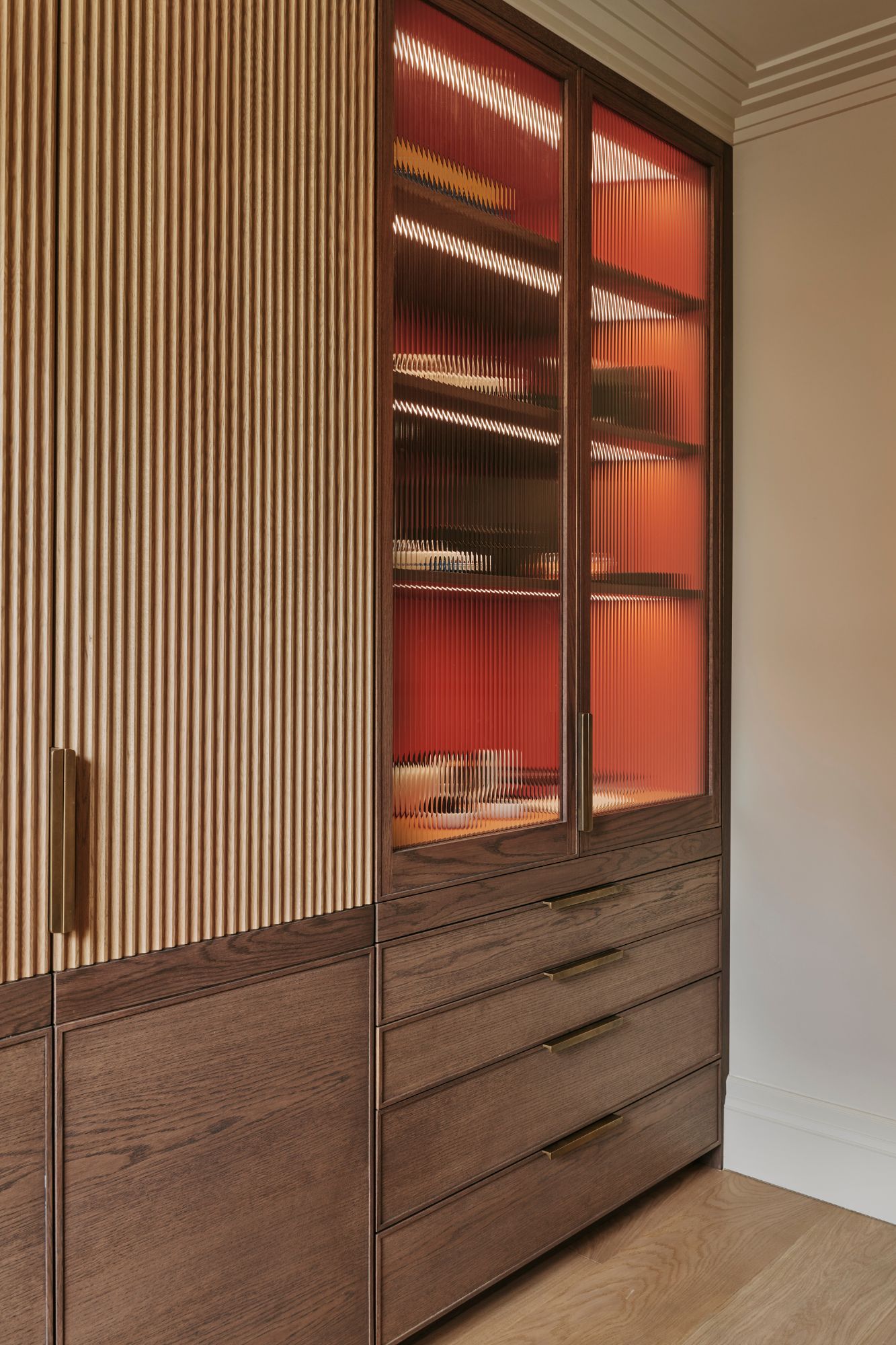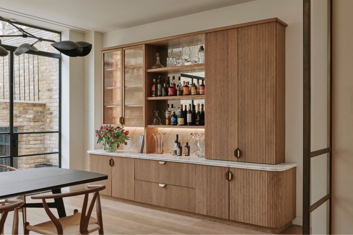9th July 2024 | IN PRODUCT NEWS | BY SBID Share Tweet Pinterest LinkedIn Charlie Smallbone’s designs can be seen throughout this Kensington home, where he and the Ledbury Studio team were tasked with creating furniture for several spaces. Harnessing a style his client coined as ‘Australian Scandi’, Charlie designed beautiful and harmonious pieces for the kitchen, dining area, TV snug, home office, utility room and hallway. Ledbury Studio Reoccurring themes such as the use of pale oak, fluted finishes, brass handles and marble countertops tie the rooms together. As such, far from being a collection of rooms under one roof, the spaces are united by the warmth of the materials and the pleasing lines of finely crafted bespoke furniture. The open-plan kitchen has a dining area to one side and a TV snug to the other. The desk has a burnt orange leather inset that mirrors the finish at the back of the cupboard. The Kitchen-Living Space Highlights of the kitchen include natural and painted oak cabinetry, which has been book matched on the drawers, as well as fluted on the outside of the island. All the handles are patinated brass, as are the kickplates, furniture surrounds and the sculptural brass hanging structure above the island. In the home office, both fluted oak and walnut feature. In the home office, both fluted oak and walnut feature. Over in the dining area, the enviable drinks cabinet ties in with the kitchen design, featuring fluted oak and glass, along with a Statuario marble worktop and panelling. The glass cabinet is lit from within to create a display of the contents, while the open shelves have a mirrored panel behind to reflect the displayed bottles and decanters. An eye-catching wall-hung fluted TV cabinet continues the aesthetic at the other end of the room, in the TV snug. In the home office, both fluted oak and walnut feature. The calming aesthetic continues in the hallway. Home Office Stunning floor-to-ceiling cabinetry ensures the home office downstairs is kept clutter free and takes advantage of the high ceilings. The furniture, like the kitchen design, features fluted oak doors, an internally lit fluted glass cabinet and hand-made patinated brass handles. However, to create a contrast with the oak, Charlie chose walnut for the desk and lower section of the cabinetry. A lovely detail is the burnt orange leather inset on the desk, the colour of which is mirrored in the orange paint finish at the back of the fluted glass cupboard. Hallway and Cloakroom In the hallway on the lower ground floor, furniture has once again been used to make the most of the space available. Here, Charlie designed a boot area with racks and built-in seat, plus floor-to-ceiling wardrobes and cupboards to store all outdoor wear in one place. Once again, fluted oak and brass handles unite the design with the spaces upstairs. Meanwhile, there are pale oak cabinets in the compact utility room. These have been teamed with a rich but practoical ombre quartz and complemented by deep green tiles in the cloakroom. The calming aesthetic continues in the cloakroom. About Ledbury Studio Charlie Smallbone needs little introduction. The founder of iconic brand Smallbone of Devizes, he has been pushing the boundaries of kitchen design for over 40 years. Charlie’s latest venture, Ledbury Studio, was born of his desire to harness the beauty of original materials whilst creating practical kitchens that exude style and elegance. Visit Profile If you’d like to feature your news or stories on SBID.org, get in touch to find out more. If you’d like to become SBID Accredited, click here for more information.