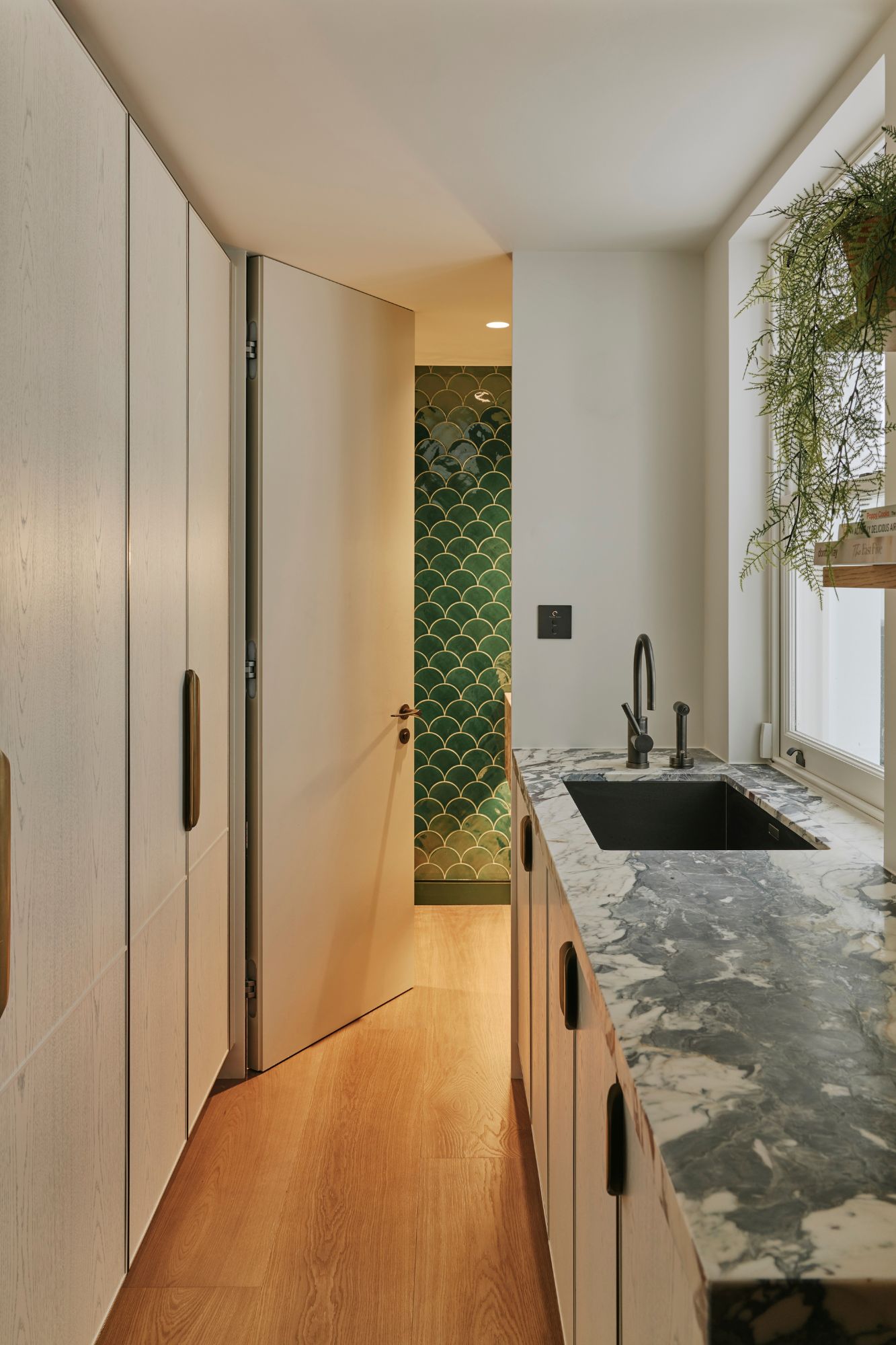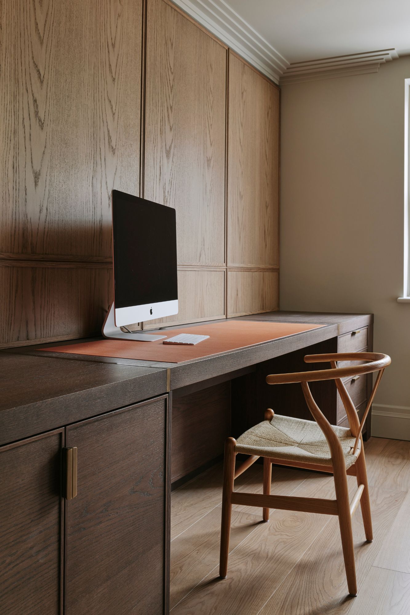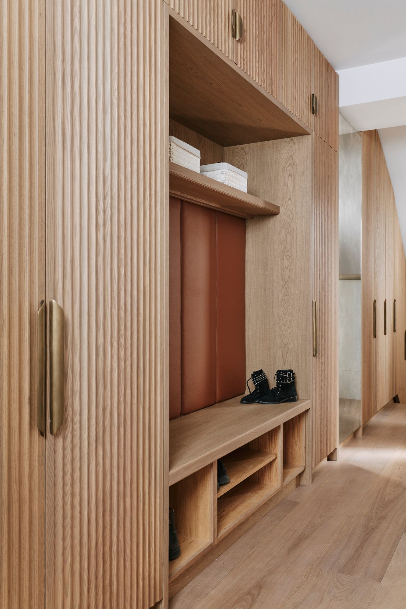 9th July 2024 | IN PRODUCT NEWS | BY SBID Share Tweet Pinterest LinkedIn Charlie Smallbone’s designs can be seen throughout this Kensington home, where he and the Ledbury Studio team were tasked with creating furniture for several spaces. Harnessing a style his client coined as ‘Australian Scandi’, Charlie designed beautiful and harmonious pieces for the kitchen, dining area, TV snug, home office, utility room and hallway. Ledbury Studio Reoccurring themes such as the use of pale oak, fluted finishes, brass handles and marble countertops tie the rooms together. As such, far from being a collection of rooms under one roof, the spaces are united by the warmth of the materials and the pleasing lines of finely crafted bespoke furniture. The open-plan kitchen has a dining area to one side and a TV snug to the other. The desk has a burnt orange leather inset that mirrors the finish at the back of the cupboard. The Kitchen-Living Space Highlights of the kitchen include natural and painted oak cabinetry, which has been book matched on the drawers, as well as fluted on the outside of the island. All the handles are patinated brass, as are the kickplates, furniture surrounds and the sculptural brass hanging structure above the island. In the home office, both fluted oak and walnut feature. In the home office, both fluted oak and walnut feature. Over in the dining area, the enviable drinks cabinet ties in with the kitchen design, featuring fluted oak and glass, along with a Statuario marble worktop and panelling. The glass cabinet is lit from within to create a display of the contents, while the open shelves have a mirrored panel behind to reflect the displayed bottles and decanters. An eye-catching wall-hung fluted TV cabinet continues the aesthetic at the other end of the room, in the TV snug. In the home office, both fluted oak and walnut feature. The calming aesthetic continues in the hallway. Home Office Stunning floor-to-ceiling cabinetry ensures the home office downstairs is kept clutter free and takes advantage of the high ceilings. The furniture, like the kitchen design, features fluted oak doors, an internally lit fluted glass cabinet and hand-made patinated brass handles. However, to create a contrast with the oak, Charlie chose walnut for the desk and lower section of the cabinetry. A lovely detail is the burnt orange leather inset on the desk, the colour of which is mirrored in the orange paint finish at the back of the fluted glass cupboard. Hallway and Cloakroom In the hallway on the lower ground floor, furniture has once again been used to make the most of the space available. Here, Charlie designed a boot area with racks and built-in seat, plus floor-to-ceiling wardrobes and cupboards to store all outdoor wear in one place. Once again, fluted oak and brass handles unite the design with the spaces upstairs. Meanwhile, there are pale oak cabinets in the compact utility room. These have been teamed with a rich but practoical ombre quartz and complemented by deep green tiles in the cloakroom. The calming aesthetic continues in the cloakroom. About Ledbury Studio Charlie Smallbone needs little introduction. The founder of iconic brand Smallbone of Devizes, he has been pushing the boundaries of kitchen design for over 40 years. Charlie’s latest venture, Ledbury Studio, was born of his desire to harness the beauty of original materials whilst creating practical kitchens that exude style and elegance. Visit Profile If you’d like to feature your news or stories on SBID.org, get in touch to find out more. If you’d like to become SBID Accredited, click here for more information.