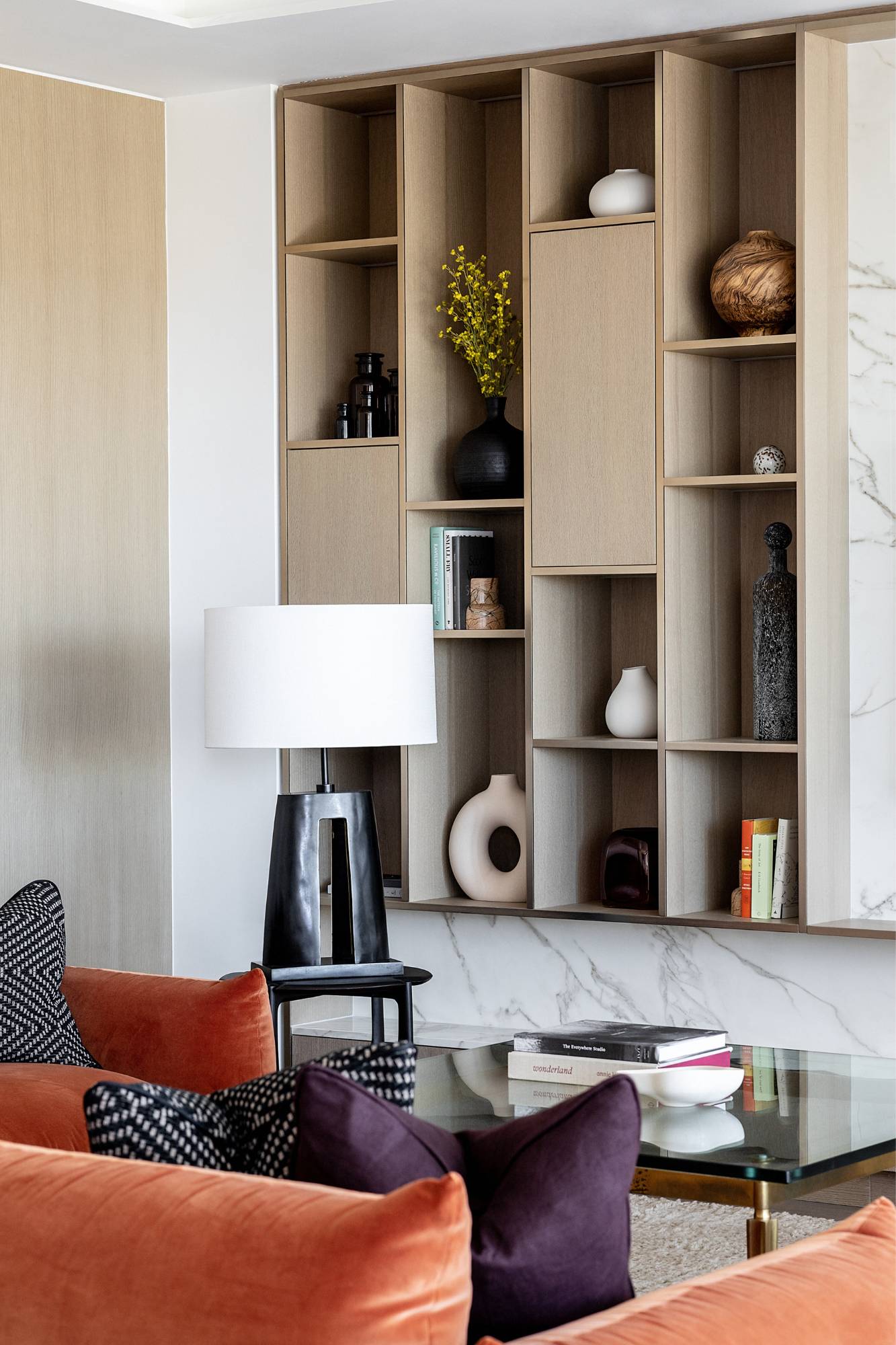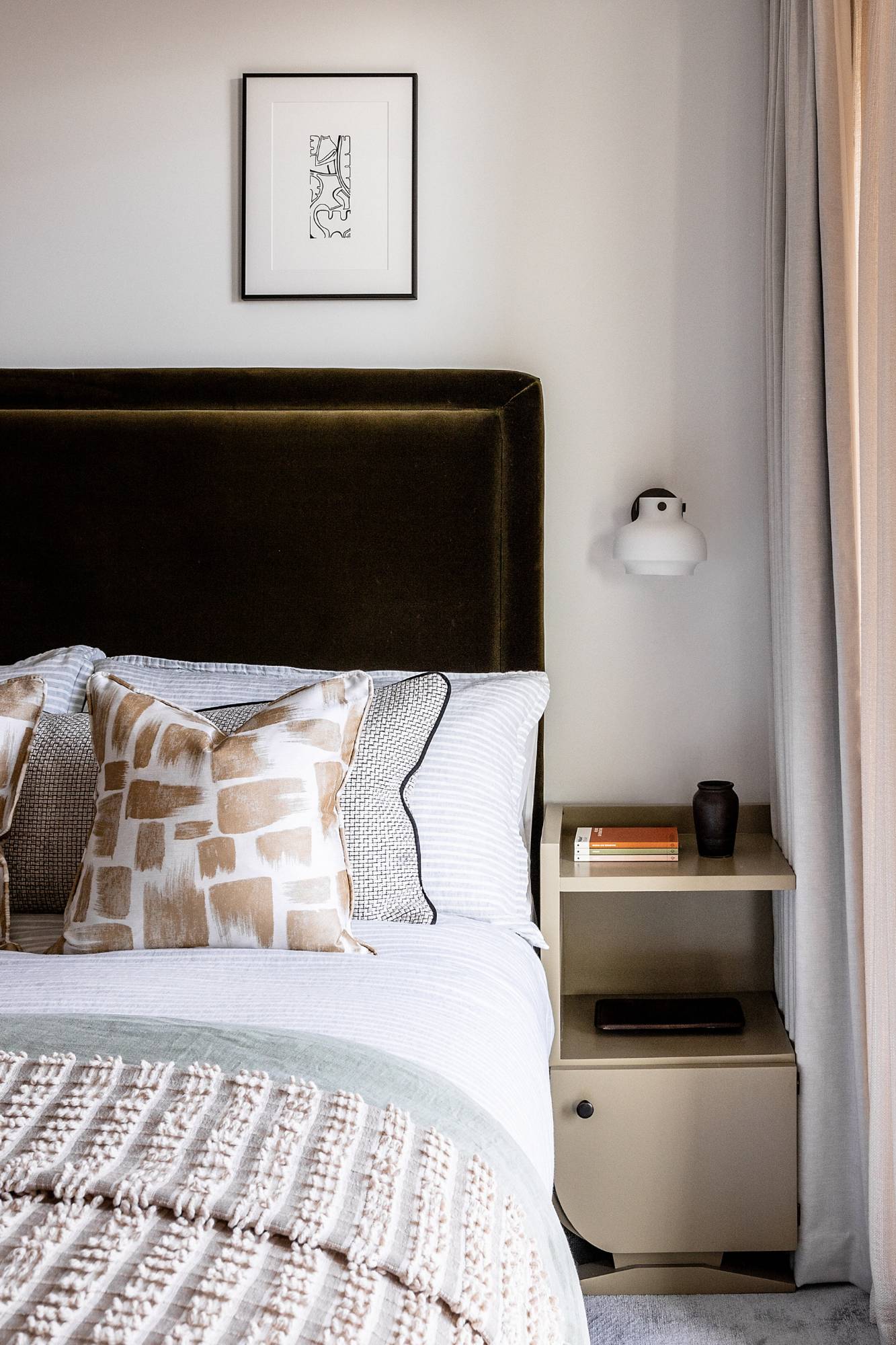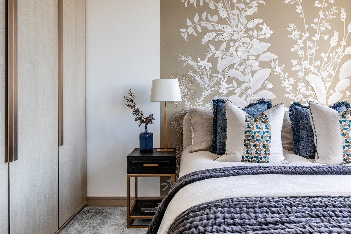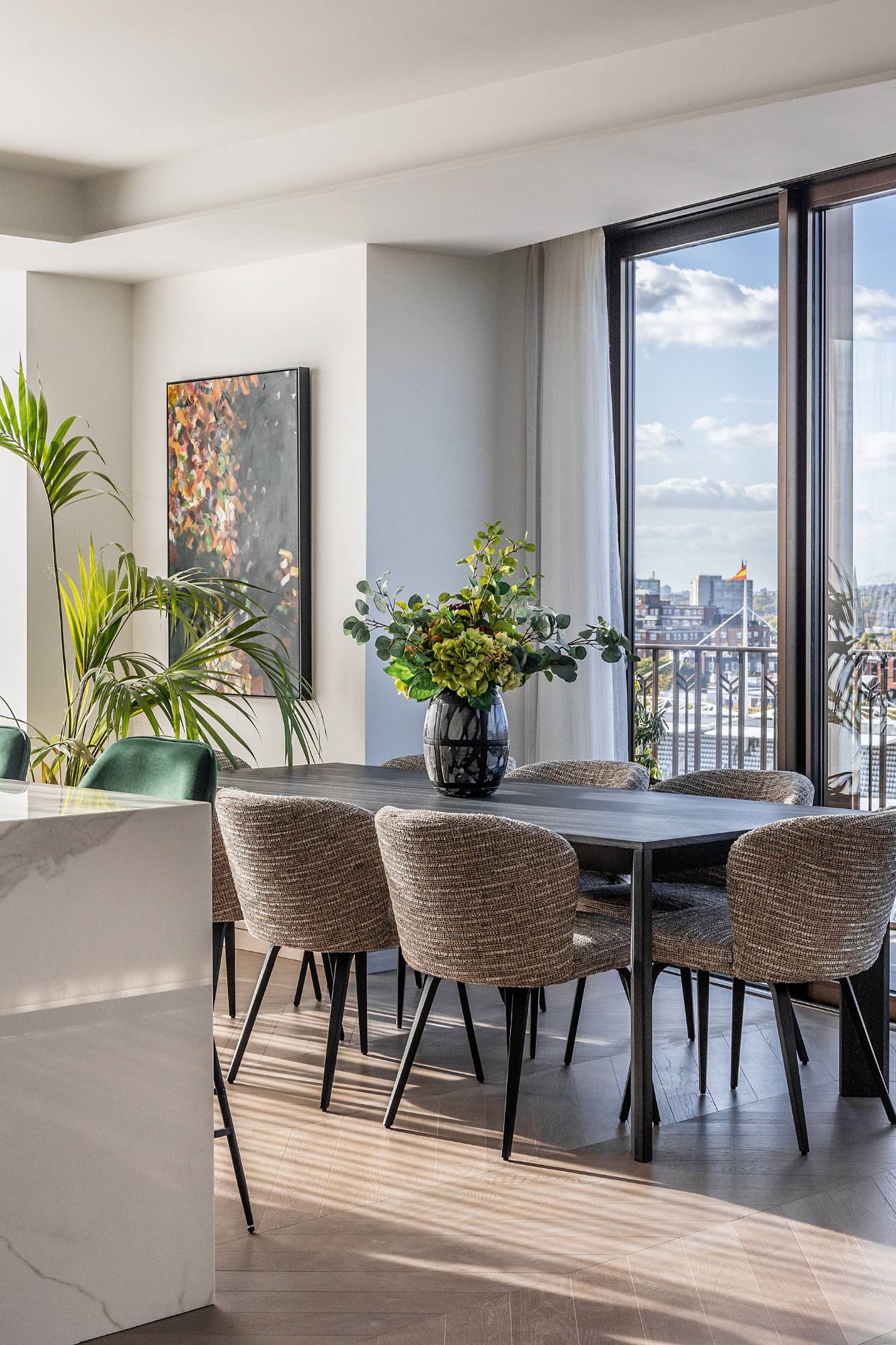 12th December 2022 | IN INTERIOR DESIGN PROJECTS | BY SBID Share Tweet Pinterest LinkedIn Angel O’Donnell were asked to interior design a penthouse and sub-penthouse inside One St. John’s Wood, a new luxury development in NW8. Both residences enjoy the rarest of London views: big skies, treetops as far as the eye can see, golden sunrises, showstopping sunsets and, of course, the legendary Lord’s Cricket Ground. This happy blend of nature and iconic architecture inspired many choices – from hand-drawn floral motifs to sculptural furniture and geometric patterns. Each apartment, while different, feels part of an exclusive collection, something our client was keen to achieve. In full flow The rippling bronze coffee table base. The oscillating lines on the rug that resemble light-dappled water. The dimpled vase. The curled wooden bowl. Even the folds and twisted leather piping on the cushions. These fluid and irregular shapes balance the clean-lined simplicity of the joinery. While the sofa Angel O’Donnell designed – with its walnut plinth base and mix of textured linen and multi-yarn weaves – is low-slung to maximise the views outside. Making a splash The designers upholstered these two Vladimir Kagan armchairs in a soft Edelman leather. They love their shape, like the flukes of a whale’s tail emerging from the watery deep. In the mix Arranging shapes, textures and colours is a way of forging relationships between seemingly disparate objects. It could be a conical lampshade paired with a pyramidal sculpture. Or a set of mixed-media collages that share tonal similarities with wood, brass and marble finishes. By selecting pieces with commonalities, the team brought an unsuspecting corner of the living room to life. Cushion the blow Striped cushions of multi-coloured linen yarns. Stone-washed cushions with handmade leather straps. And a superabundance of pillows and throws. It’s what every bedroom deserves. Artwork depicting Singapore’s Garden City – with its intersecting lines and architectural supertrees – complement the elliptical shapes and parallel lines elsewhere in the room. Go native Against the cool calm of the white cotton sheets, dove-grey headboard and evergreen cushions, sit two bold fabrics inspired by Native American iconography. The mix of print and embroidery, geometric motifs and bright colours invigorate the warm neutrals in the scheme. Turn over a new leaf The flourishing mural of large leaves, delicate pods and long grasses has been hand drawn and printed onto panels. The design is exuberant and life-affirming – and a pleasing counterpoint to the measured fumed oak side tables, and cushions with their neat arrangement of teal, mint and ochre circles and crescents. In good shape The large bronze table lamp resembles a Stonehenge monolith. Its substantial frame provides a visual backbone to the mix of soft, plump and lean shapes in the room. Whether it’s the reassuringly rounded profile of the Marenco sofa or the shiny accents of the glamorous Hollywood Regency coffee table – there’s plenty to savour. Lean into it Like Disney’s Pixar lamp, our thin-stemmed floor light has an animated quality. As it leans over the two bespoke lounge chairs, its posture appears inquisitive. Its reflective copper shade mirrors the gleam of the coffee table. While its angled rod echoes the diagonals in the wool, mohair and alpaca fabric of the chairs. All clear The glass- and ash-wood table was designed in-house. The base, which pays homage to miyadaiku Japanese carpentry, is cunningly simple. No bolts or nails. Just five interlocking pieces of wood that form a top with four triangular legs. It looks architectural, skeletal even. The precision of the half lap joints combined with the drama of the scorched wood are beautiful to behold. Looking sharp Structural forms and materials continue to flourish throughout the apartment. In particular, the Roman-like arches of the headboard and the ziggurat-inspired shape of the lamps. These speak to the riot of architectural genres found in the neighbouring Lord’s Cricket Ground. We especially love how the lamps’ teeth look wincingly sharp against the smooth, burgundy velvet. Butter wouldn’t melt In the same bedroom, vintage drawers painted a pale buttercup, a flower-like wall light and an impressionist landscape create a bucolic scene. It’s a surprising contrast to the industrial-looking lamps diagonally opposite. And that’s what St. John’s Wood is all about: village sensibility mingled with a little raw-edged urban style. Green to be seen A dark, moss velvet headboard further endears us to nature. So, too, do the opal-glass wall lamps and chunky hand-knotted throw. There’s a soft, rounded wholesomeness to these pieces, which is gently counterpointed by the geometric patterns of the cushions, and sharp detailing of the art deco bedsides. In the frame A large piece of art – coppery, elemental, strong – provides a striking focal point in a room filled with houndstooth and lightly stippled pear-hued cushions, linen and lambswool throws, and pale grey upholstered walls. Just as nature ages, the pleated brass pendant lights will patina over time and develop some of the dark, rich tones present in the artwork. Photo credit: Taran Wilkhu About Angel O’Donnell Since launching our London interior design studio in 2018, Angel O’Donnell has won a variety of international awards – both for our designs and for our outstanding client-focused work ethic. Our portfolio features a diverse mix of projects – from Deco-inspired penthouses and traditional country retreats to contemporary Greek villas, modular student accommodation and luxury show apartments in multi-unit developments, including the rapidly popular Build to Rent sector. And that’s what we’re all about: creating an assortment of styles that elevate, enhance and embolden every project we do. There’s no signature look. Just exquisite design and impe