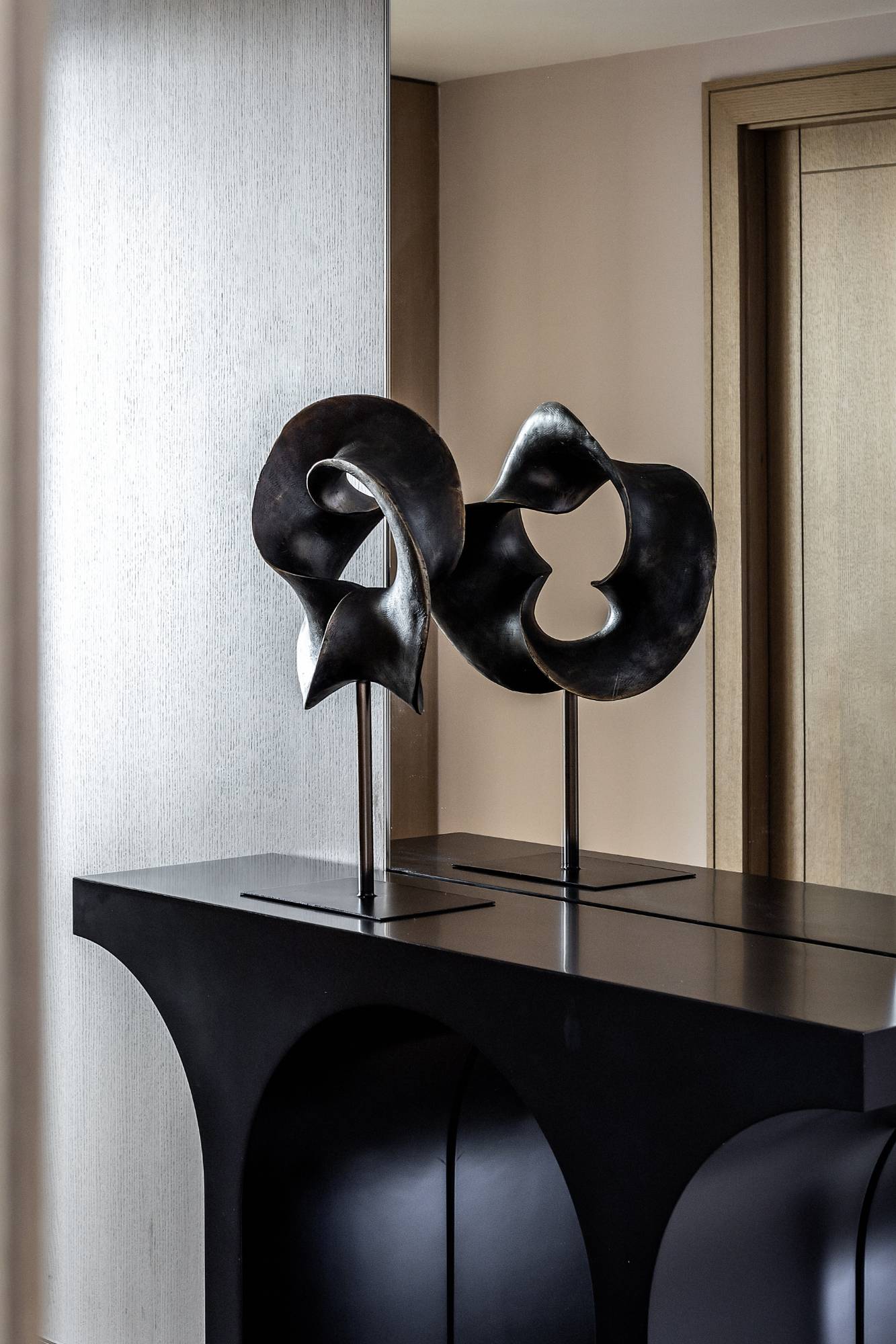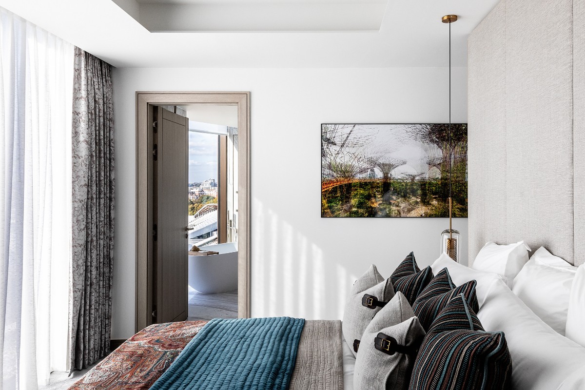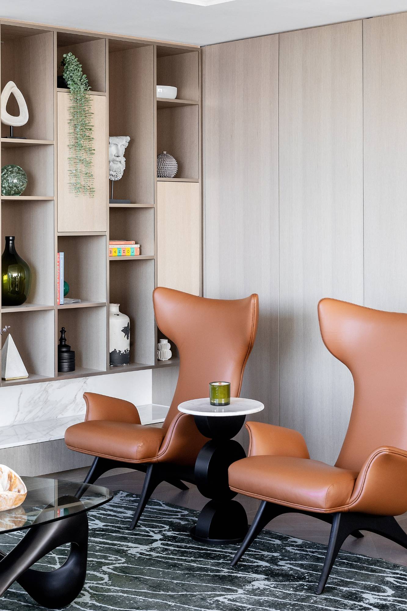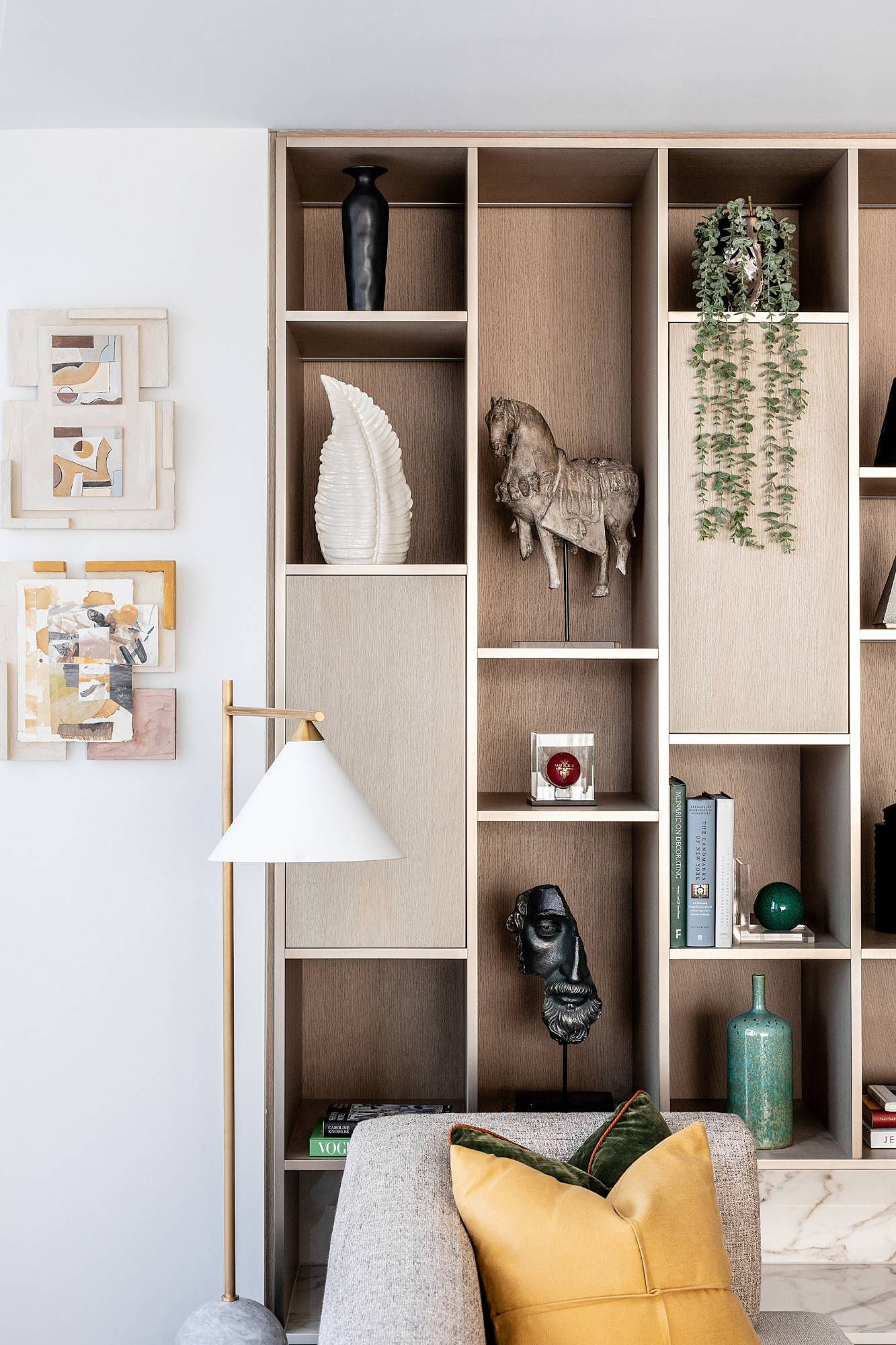 12th December 2022 | IN INTERIOR DESIGN PROJECTS | BY SBID Share Tweet Pinterest LinkedIn Angel O’Donnell were asked to interior design a penthouse and sub-penthouse inside One St. John’s Wood, a new luxury development in NW8. Both residences enjoy the rarest of London views: big skies, treetops as far as the eye can see, golden sunrises, showstopping sunsets and, of course, the legendary Lord’s Cricket Ground. This happy blend of nature and iconic architecture inspired many choices – from hand-drawn floral motifs to sculptural furniture and geometric patterns. Each apartment, while different, feels part of an exclusive collection, something our client was keen to achieve. In full flow The rippling bronze coffee table base. The oscillating lines on the rug that resemble light-dappled water. The dimpled vase. The curled wooden bowl. Even the folds and twisted leather piping on the cushions. These fluid and irregular shapes balance the clean-lined simplicity of the joinery. While the sofa Angel O’Donnell designed – with its walnut plinth base and mix of textured linen and multi-yarn weaves – is low-slung to maximise the views outside. Making a splash The designers upholstered these two Vladimir Kagan armchairs in a soft Edelman leather. They love their shape, like the flukes of a whale’s tail emerging from the watery deep. In the mix Arranging shapes, textures and colours is a way of forging relationships between seemingly disparate objects. It could be a conical lampshade paired with a pyramidal sculpture. Or a set of mixed-media collages that share tonal similarities with wood, brass and marble finishes. By selecting pieces with commonalities, the team brought an unsuspecting corner of the living room to life. Cushion the blow Striped cushions of multi-coloured linen yarns. Stone-washed cushions with handmade leather straps. And a superabundance of pillows and throws. It’s what every bedroom deserves. Artwork depicting Singapore’s Garden City – with its intersecting lines and architectural supertrees – complement the elliptical shapes and parallel lines elsewhere in the room. Go native Against the cool calm of the white cotton sheets, dove-grey headboard and evergreen cushions, sit two bold fabrics inspired by Native American iconography. The mix of print and embroidery, geometric motifs and bright colours invigorate the warm neutrals in the scheme. Turn over a new leaf The flourishing mural of large leaves, delicate pods and long grasses has been hand drawn and printed onto panels. The design is exuberant and life-affirming – and a pleasing counterpoint to the measured fumed oak side tables, and cushions with their neat arrangement of teal, mint and ochre circles and crescents. In good shape The large bronze table lamp resembles a Stonehenge monolith. Its substantial frame provides a visual backbone to the mix of soft, plump and lean shapes in the room. Whether it’s the reassuringly rounded profile of the Marenco sofa or the shiny accents of the glamorous Hollywood Regency coffee table – there’s plenty to savour. Lean into it Like Disney’s Pixar lamp, our thin-stemmed floor light has an animated quality. As it leans over the two bespoke lounge chairs, its posture appears inquisitive. Its reflective copper shade mirrors the gleam of the coffee table. While its angled rod echoes the diagonals in the wool, mohair and alpaca fabric of the chairs. All clear The glass- and ash-wood table was designed in-house. The base, which pays homage to miyadaiku Japanese carpentry, is cunningly simple. No bolts or nails. Just five interlocking pieces of wood that form a top with four triangular legs. It looks architectural, skeletal even. The precision of the half lap joints combined with the drama of the scorched wood are beautiful to behold. Looking sharp Structural forms and materials continue to flourish throughout the apartment. In particular, the Roman-like arches of the headboard and the ziggurat-inspired shape of the lamps. These speak to the riot of architectural genres found in the neighbouring Lord’s Cricket Ground. We especially love how the lamps’ teeth look wincingly sharp against the smooth, burgundy velvet. Butter wouldn’t melt In the same bedroom, vintage drawers painted a pale buttercup, a flower-like wall light and an impressionist landscape create a bucolic scene. It’s a surprising contrast to the industrial-looking lamps diagonally opposite. And that’s what St. John’s Wood is all about: village sensibility mingled with a little raw-edged urban style. Green to be seen A dark, moss velvet headboard further endears us to nature. So, too, do the opal-glass wall lamps and chunky hand-knotted throw. There’s a soft, rounded wholesomeness to these pieces, which is gently counterpointed by the geometric patterns of the cushions, and sharp detailing of the art deco bedsides. In the frame A large piece of art – coppery, elemental, strong – provides a striking focal point in a room filled with houndstooth and lightly stippled pear-hued cushions, linen and lambswool throws, and pale grey upholstered walls. Just as nature ages, the pleated brass pendant lights will patina over time and develop some of the dark, rich tones present in the artwork. Photo credit: Taran Wilkhu About Angel O’Donnell Since launching our London interior design studio in 2018, Angel O’Donnell has won a variety of international awards – both for our designs and for our outstanding client-focused work ethic. Our portfolio features a diverse mix of projects – from Deco-inspired penthouses and traditional country retreats to contemporary Greek villas, modular student accommodation and luxury show apartments in multi-unit developments, including the rapidly popular Build to Rent sector. And that’s what we’re all about: creating an assortment of styles that elevate, enhance and embolden every project we do. There’s no signature look. Just exquisite design and impe