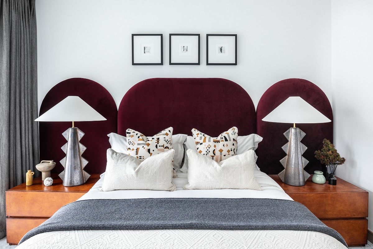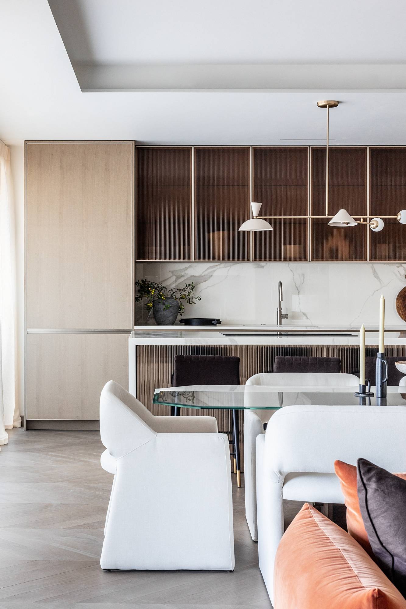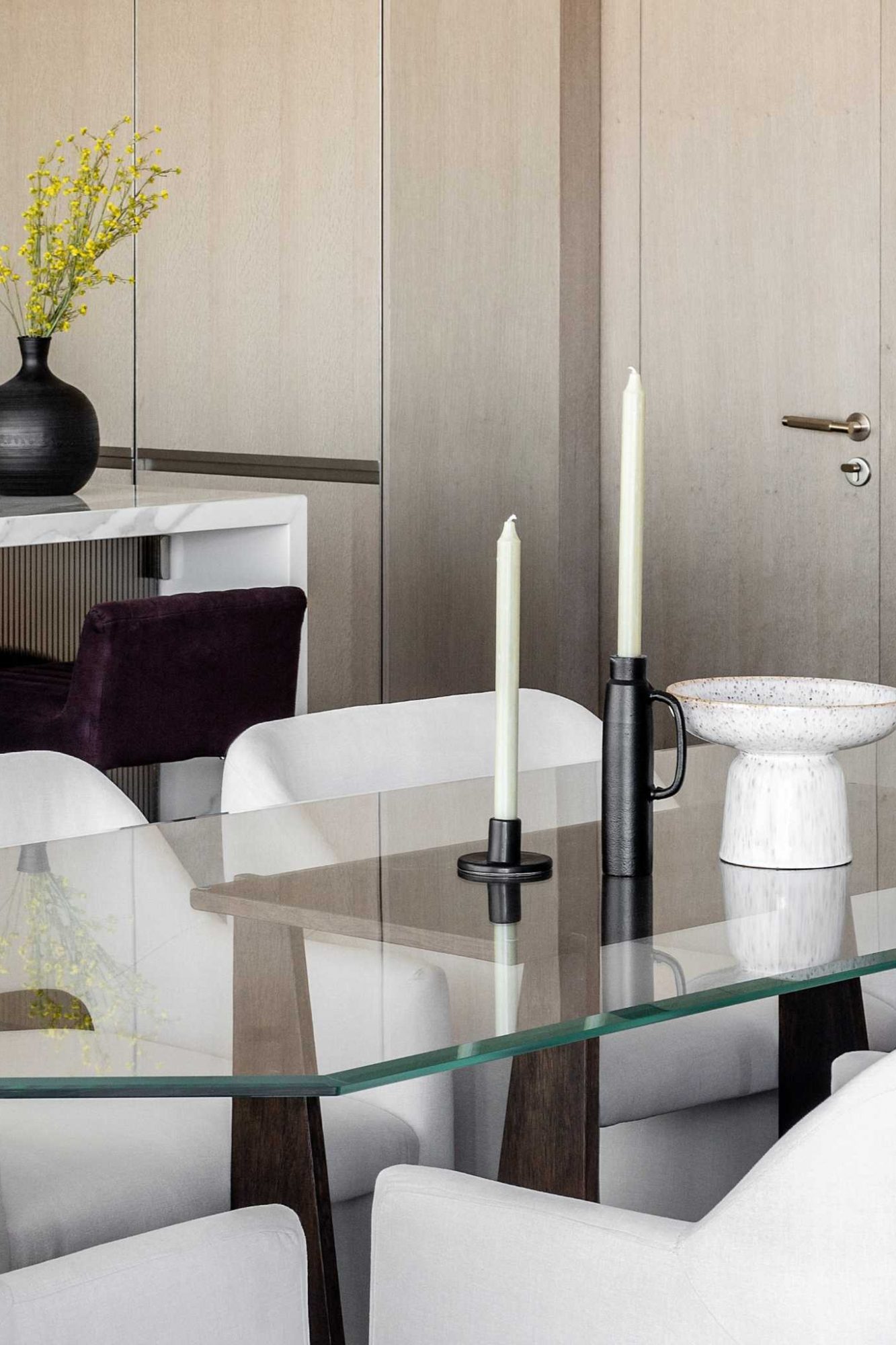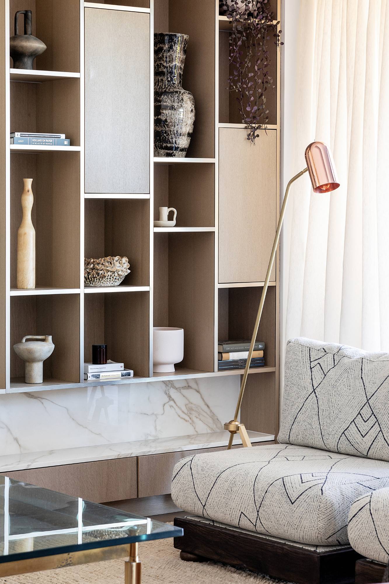 12th December 2022 | IN INTERIOR DESIGN PROJECTS | BY SBID Share Tweet Pinterest LinkedIn Angel O’Donnell were asked to interior design a penthouse and sub-penthouse inside One St. John’s Wood, a new luxury development in NW8. Both residences enjoy the rarest of London views: big skies, treetops as far as the eye can see, golden sunrises, showstopping sunsets and, of course, the legendary Lord’s Cricket Ground. This happy blend of nature and iconic architecture inspired many choices – from hand-drawn floral motifs to sculptural furniture and geometric patterns. Each apartment, while different, feels part of an exclusive collection, something our client was keen to achieve. In full flow The rippling bronze coffee table base. The oscillating lines on the rug that resemble light-dappled water. The dimpled vase. The curled wooden bowl. Even the folds and twisted leather piping on the cushions. These fluid and irregular shapes balance the clean-lined simplicity of the joinery. While the sofa Angel O’Donnell designed – with its walnut plinth base and mix of textured linen and multi-yarn weaves – is low-slung to maximise the views outside. Making a splash The designers upholstered these two Vladimir Kagan armchairs in a soft Edelman leather. They love their shape, like the flukes of a whale’s tail emerging from the watery deep. In the mix Arranging shapes, textures and colours is a way of forging relationships between seemingly disparate objects. It could be a conical lampshade paired with a pyramidal sculpture. Or a set of mixed-media collages that share tonal similarities with wood, brass and marble finishes. By selecting pieces with commonalities, the team brought an unsuspecting corner of the living room to life. Cushion the blow Striped cushions of multi-coloured linen yarns. Stone-washed cushions with handmade leather straps. And a superabundance of pillows and throws. It’s what every bedroom deserves. Artwork depicting Singapore’s Garden City – with its intersecting lines and architectural supertrees – complement the elliptical shapes and parallel lines elsewhere in the room. Go native Against the cool calm of the white cotton sheets, dove-grey headboard and evergreen cushions, sit two bold fabrics inspired by Native American iconography. The mix of print and embroidery, geometric motifs and bright colours invigorate the warm neutrals in the scheme. Turn over a new leaf The flourishing mural of large leaves, delicate pods and long grasses has been hand drawn and printed onto panels. The design is exuberant and life-affirming – and a pleasing counterpoint to the measured fumed oak side tables, and cushions with their neat arrangement of teal, mint and ochre circles and crescents. In good shape The large bronze table lamp resembles a Stonehenge monolith. Its substantial frame provides a visual backbone to the mix of soft, plump and lean shapes in the room. Whether it’s the reassuringly rounded profile of the Marenco sofa or the shiny accents of the glamorous Hollywood Regency coffee table – there’s plenty to savour. Lean into it Like Disney’s Pixar lamp, our thin-stemmed floor light has an animated quality. As it leans over the two bespoke lounge chairs, its posture appears inquisitive. Its reflective copper shade mirrors the gleam of the coffee table. While its angled rod echoes the diagonals in the wool, mohair and alpaca fabric of the chairs. All clear The glass- and ash-wood table was designed in-house. The base, which pays homage to miyadaiku Japanese carpentry, is cunningly simple. No bolts or nails. Just five interlocking pieces of wood that form a top with four triangular legs. It looks architectural, skeletal even. The precision of the half lap joints combined with the drama of the scorched wood are beautiful to behold. Looking sharp Structural forms and materials continue to flourish throughout the apartment. In particular, the Roman-like arches of the headboard and the ziggurat-inspired shape of the lamps. These speak to the riot of architectural genres found in the neighbouring Lord’s Cricket Ground. We especially love how the lamps’ teeth look wincingly sharp against the smooth, burgundy velvet. Butter wouldn’t melt In the same bedroom, vintage drawers painted a pale buttercup, a flower-like wall light and an impressionist landscape create a bucolic scene. It’s a surprising contrast to the industrial-looking lamps diagonally opposite. And that’s what St. John’s Wood is all about: village sensibility mingled with a little raw-edged urban style. Green to be seen A dark, moss velvet headboard further endears us to nature. So, too, do the opal-glass wall lamps and chunky hand-knotted throw. There’s a soft, rounded wholesomeness to these pieces, which is gently counterpointed by the geometric patterns of the cushions, and sharp detailing of the art deco bedsides. In the frame A large piece of art – coppery, elemental, strong – provides a striking focal point in a room filled with houndstooth and lightly stippled pear-hued cushions, linen and lambswool throws, and pale grey upholstered walls. Just as nature ages, the pleated brass pendant lights will patina over time and develop some of the dark, rich tones present in the artwork. Photo credit: Taran Wilkhu About Angel O’Donnell Since launching our London interior design studio in 2018, Angel O’Donnell has won a variety of international awards – both for our designs and for our outstanding client-focused work ethic. Our portfolio features a diverse mix of projects – from Deco-inspired penthouses and traditional country retreats to contemporary Greek villas, modular student accommodation and luxury show apartments in multi-unit developments, including the rapidly popular Build to Rent sector. And that’s what we’re all about: creating an assortment of styles that elevate, enhance and embolden every project we do. There’s no signature look. Just exquisite design and impe