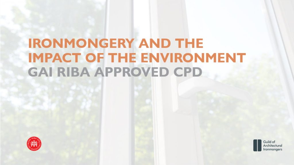 This presentation about Ironmongery and the Impact of the Environment by the Guild of Architectural Ironmongers (GAI) covers how to select ironmongery to meet the relevant environmental regulations and key principles of sustainability.