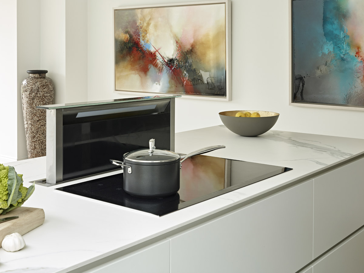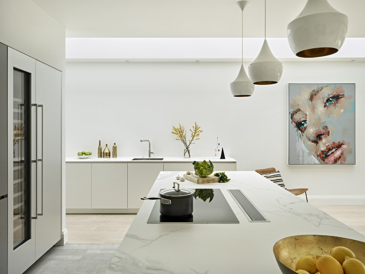 Most people seem to want taps that provide boiling water, it’s definitely growing in the market. Also, it depends on the age of the client, but sometimes features like pull-out storage are integrated so they won’t need to bend down as they get older. When creating a kitchen for a woman in a wheelchair, we looked at details such as oven height and how it opened, how the fridge was configured and where she put her tap. We designed a long thin hob, and because she couldn’t reach the hood, its fan and lights automatically turned on when the burners did. It’s also more popular to have appliances with technology that lets them be monitored and controlled remotely, for example from your phone you can track the progress of your washing machine, your dishwasher, turn your oven on and some ovens let you look at what’s happening inside. Say you have meat in your oven, you can actually see remotely a clear picture of it every 30 seconds. It’s slightly gimmicky, but it’s there if people want it. Others have a door that opens slightly after the oven’s s turned off so an item doesn’t carry on cooking from retained heat.. The hot air is pushed out and cool air is drawn in so food isn’t overcooked. Some people talk about the fact that gas might not be around forever, so if you’re going to futureproof a kitchen, induction hobs are good to have.