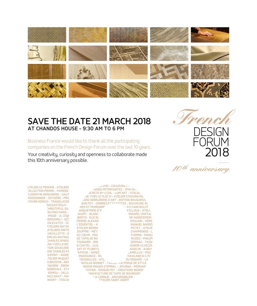 The French Design Forum is an exclusive annual event hosted by Business France in partnership with a selection of experts from the French and British interior design and architecture industries. For one day only, the event brings together a selection of craftsmen and ateliers who are highly specialised in private residential or commercial design projects. This year’s 10th anniversary edition of the French Design Forum is a celebration of the creativity, curiosity and openness to collaborate that every participant has brought to the event. The 2018 event, held at the prestigious Chandos House, will present 11 French masters of design, showcasing their savoir-faire and craftsmanship through visual and digital installations. This one-day showcase has been curated exclusively for professionals in the interior design and architecture industries. They are invited to meet this curated selection of gifted designers and ateliers at this exclusive event, which will provide unparalleled insight into their work in an intimate setting.
