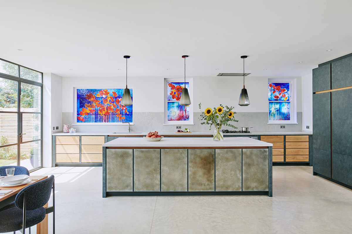 8th October 2021 | IN KBB DESIGN | BY SBID Share Tweet Pinterest LinkedIn Charlie Smallbone, founder of Ledbury Studio, has garnered a reputation for collaborating with talented artisans. His latest project in Wimbledon is no exception. It features stunning stained-glass windows by celebrated artist Brian Clarke that strike a colourful contrast to Charlie’s cool, industrial-inspired design. “As a lover and collector of modern art, our client wanted a minimal look to the kitchen that would allow her paintings, as well as the stained-glass windows, to really pop,” explains Charlie. To achieve this, Charlie used aged, hand-finished solid zinc doors from the Metallics Collection on the side of the island facing the room. Elsewhere, the cabinetry features a specially commissioned paint-effect created onsite by Ledbury Studio’s resident artist Emma Culshaw Bell. “To maintain the less-is-more approach that our client covets, all cabinets are handleless to create a sleek, unfussy look,” adds Charlie. Two sets of natural oak drawers with exposed dovetail joints inject a craft-inspired vibe into the pared-back design. Airy Concrete Caesarstone was then chosen for the worktops; a perfect complement to the concrete flooring. The finishing flourish is Crittall patio doors that open into the garden – an essential element of any industrial-inspired kitchen. “This is a kitchen that works on so many levels,” concludes Charlie. “It’s a highly functional family kitchen, a great open-plan entertaining space – that links so well with the garden – and the backdrop for some truly stunning pieces of art. I couldn’t be more delighted with the finished effect.” Ledbury Studio kitchens start from £50,000. About Ledbury Studio Charlie Smallbone needs little introduction. The founder of iconic brand Smallbone of Devizes, he has been pushing the boundaries of kitchen design for over 40 years. Charlie’s latest venture, Ledbury Studio, was born of his desire to harness the beauty of original materials whilst creating practical kitchens that exude style and elegance. If you’d like to feature your projects here, get in touch to find out more. If you’d like to become SBID Accredited, click here for more information.