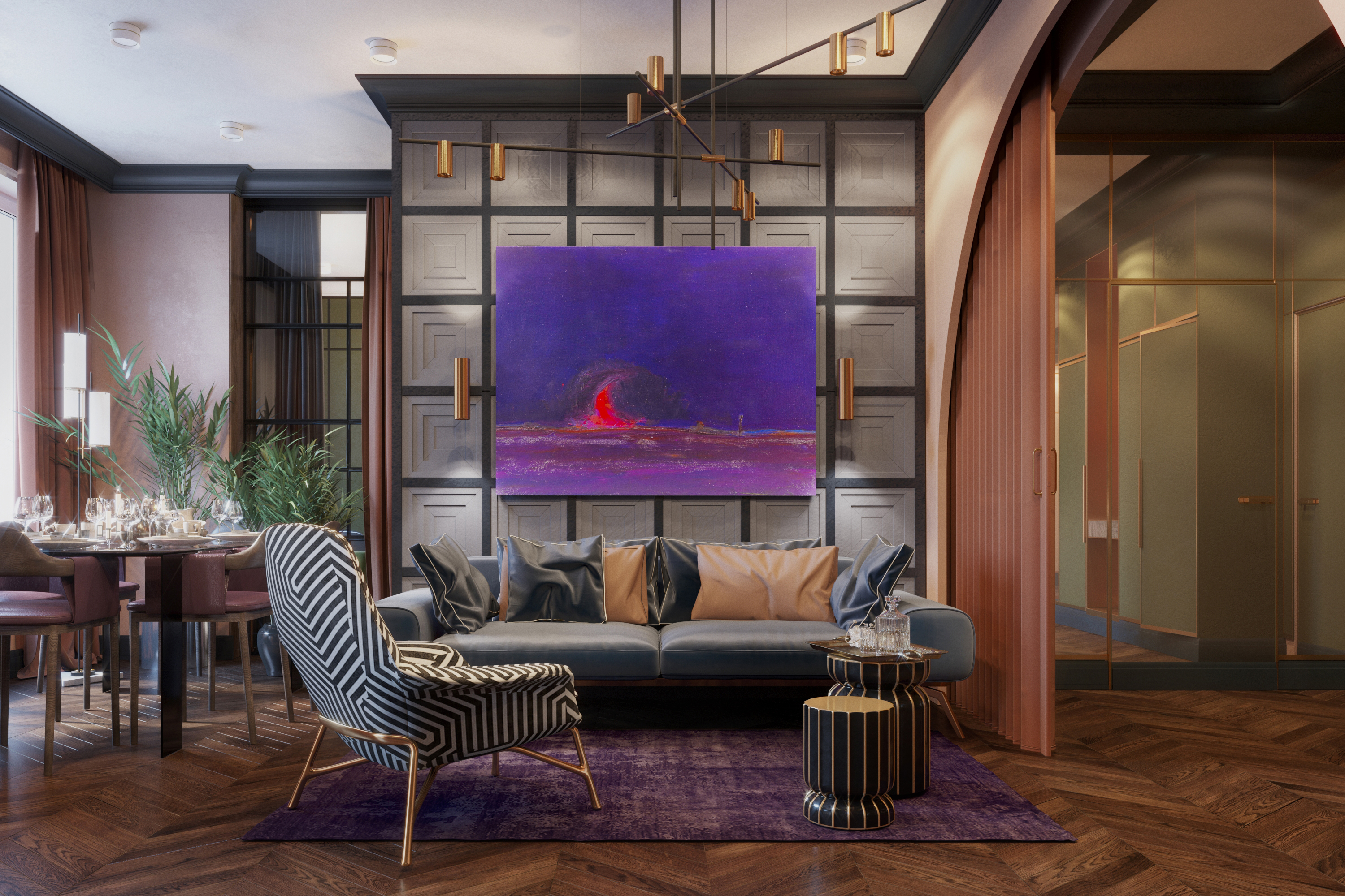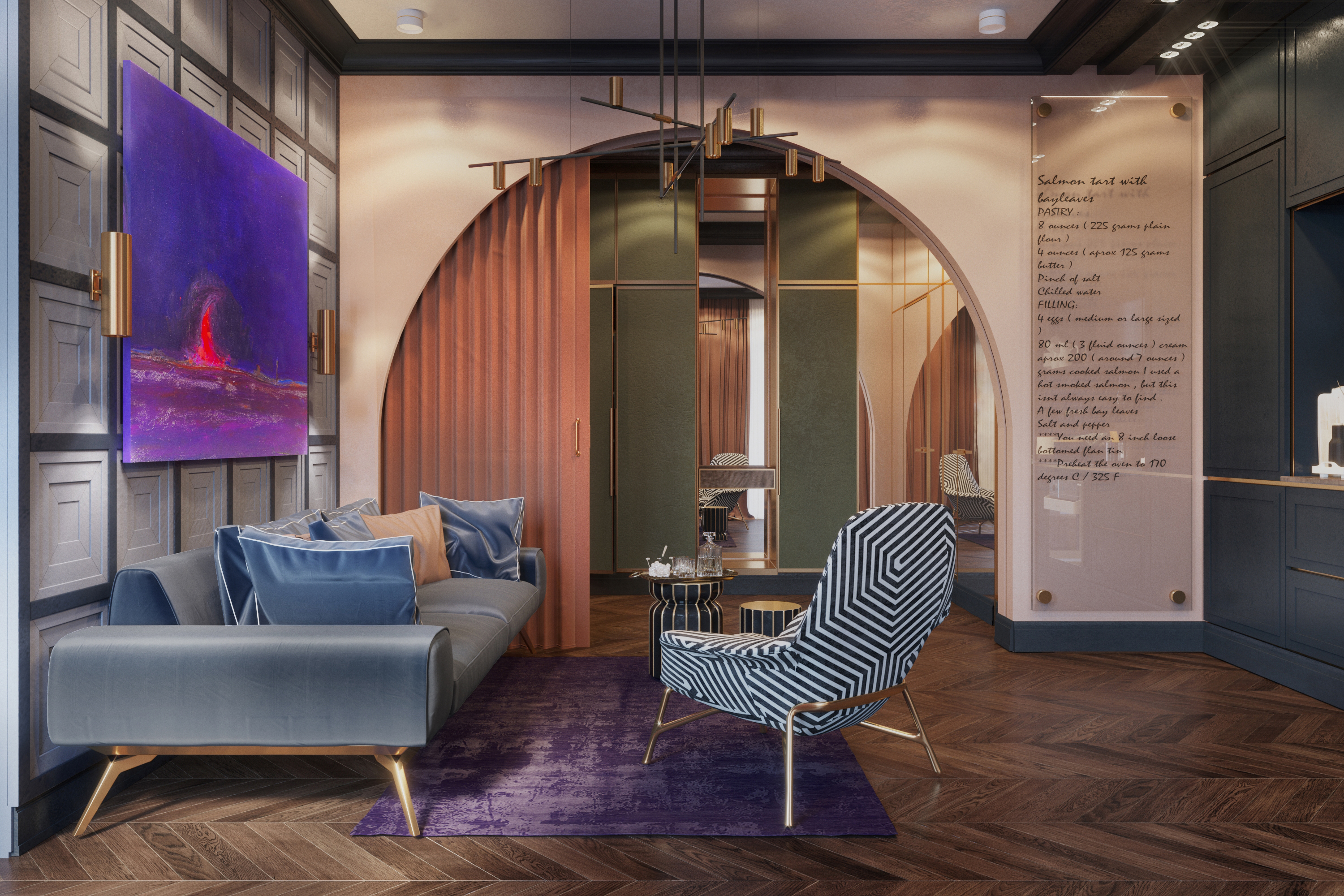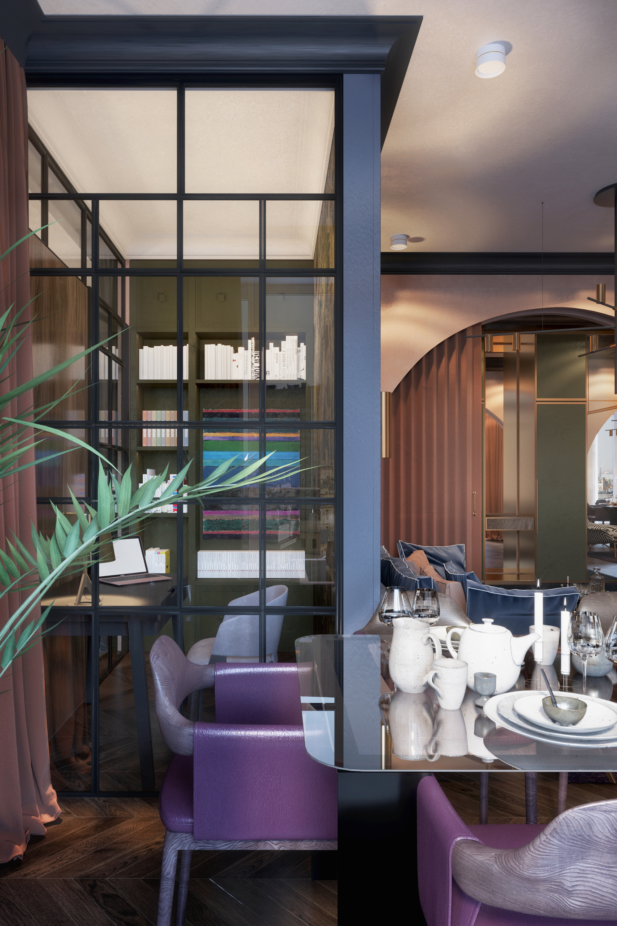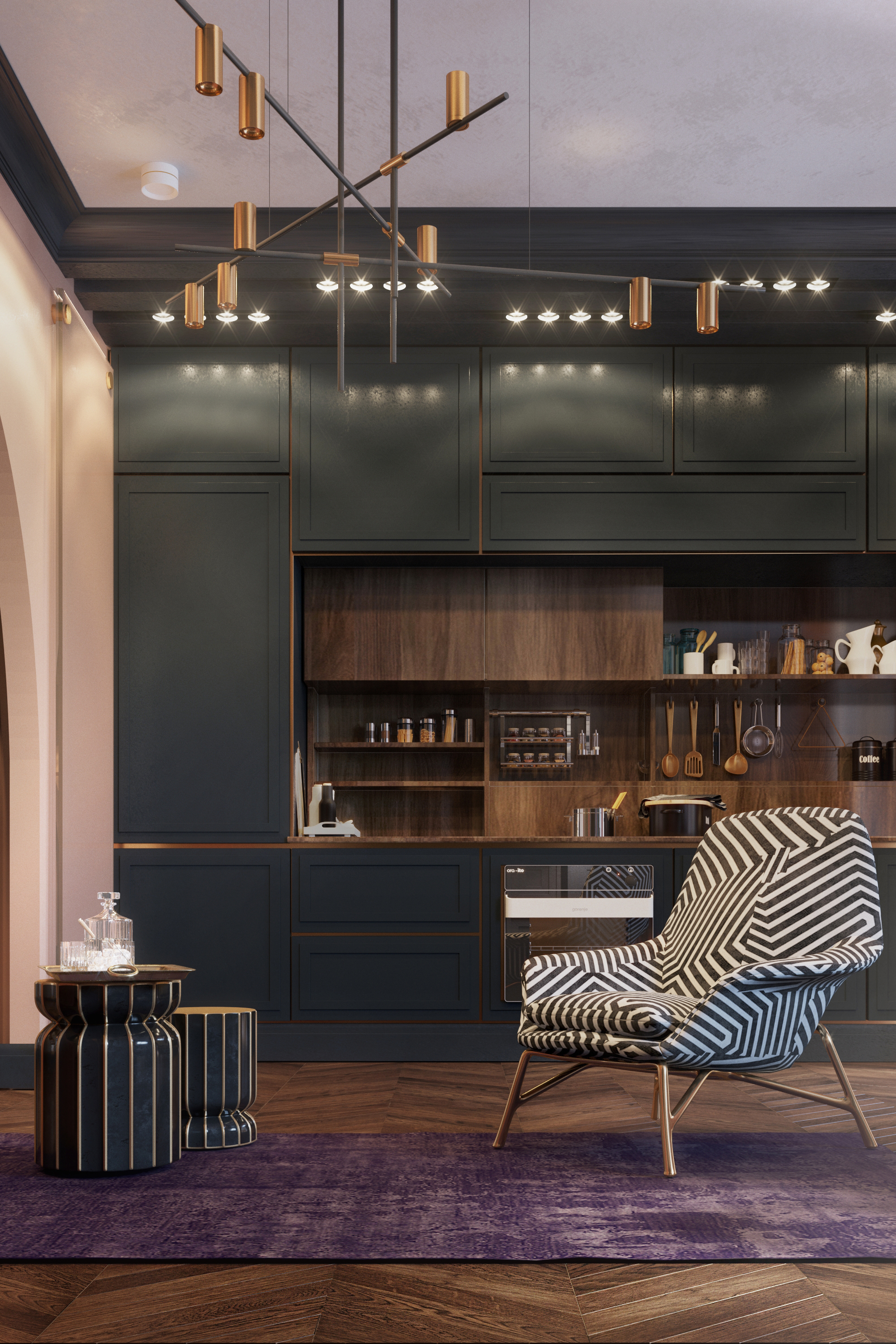 Brief:The main task of the design project was to create a multi-functional living space and its general concept aimed at creating a multidimensional space and subtle retro atmosphere, which was achieved using glasswork, unusual colour schemes in the interior and bright accents in decor. The result of this goal and vision is a comfortable European apartment with a hallway, an open living room with a kitchen, a bedroom with a wardrobe, guest bathroom, a master bathroom and a home office.