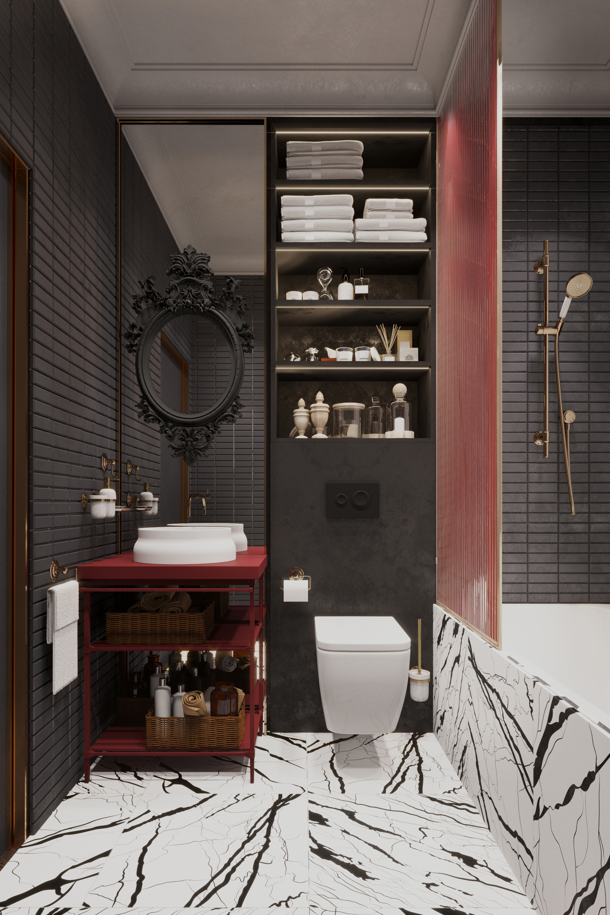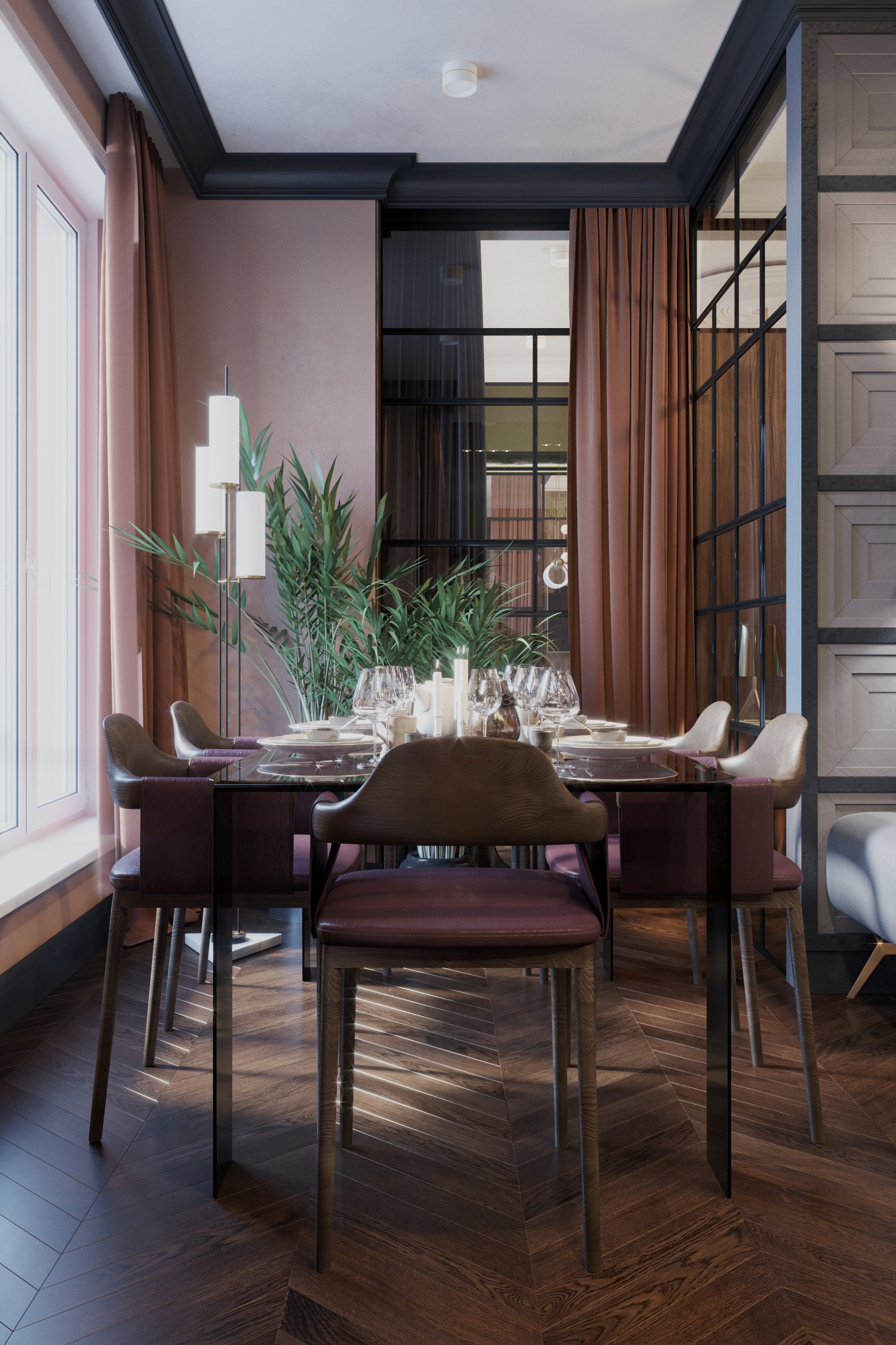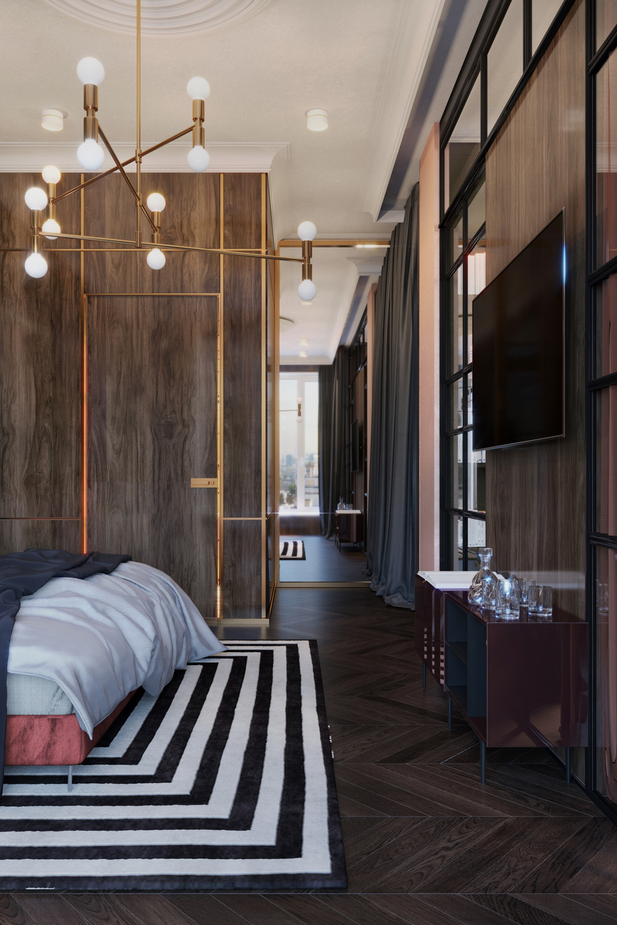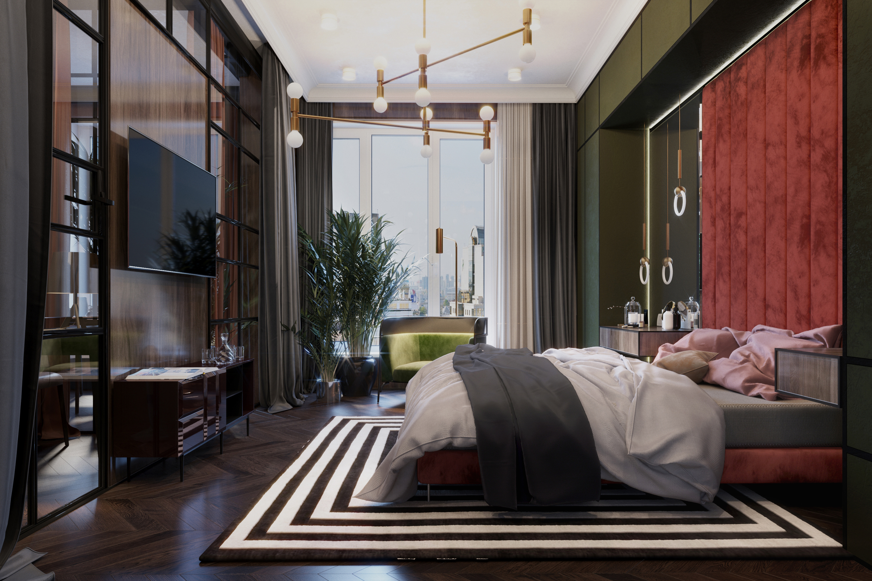Brief:The main task of the design project was to create a multi-functional living space and its general concept aimed at creating a multidimensional space and subtle retro atmosphere, which was achieved using glasswork, unusual colour schemes in the interior and bright accents in decor. The result of this goal and vision is a comfortable European apartment with a hallway, an open living room with a kitchen, a bedroom with a wardrobe, guest bathroom, a master bathroom and a home office.