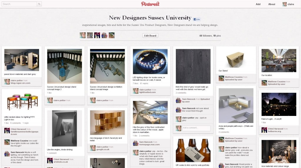 21st November 2012 | IN DESIGN ADVICE | BY SBID Share Tweet Pinterest LinkedIn We are a little bit obsessed with Pinterest. Ever since we received our invite to join the image based social media site in the beginning of 2012 we have been addicted to trawling the internet, finding great images to ‘pin’ to our boards and repinning things that others have found too. Our boards have quickly grown from a few to quite a lot and even the wee hours have found us adding new, lovely images to our collections. Not quite sure what Pinterest is? Here is a very quick introduction. In principle, Pinterest is a bit of a mash up of Twitter and Instagram with a bit of Facebook thrown in for good measure. You create a profile, then create personally titled ‘boards’, to which you can virtually pin images you have found either on the web (though a special ‘pin it’ button you can load onto your bookmark bar), or through looking at other peoples boards (a bit like re-tweeting), or just through browsing certain topics and keywords on the main Pinterest site, via organised categories. What is great is that the original source of the image is embedded in the ‘pin’ so when the image is clicked it takes the viewer back to the original website. Really, you are creating completely virtual collections and scrapbooks of great images under titled boards that everyone can see, with links back to where you found them. You can follow people. They can follow you back. You can follow just specific boards of any user. You can comment on any image and like it – just like Facebook. You can also send links from Pinterest to the other social media platforms. Lovely. A brilliant way to spend a few hours, but as a designer or design studio what is the value? We think it is absolutely huge – think about it – anyone can see the exact images that you get excited about. Things that inspire you. Things that you have designed and made. In such a visual vocation as design, surely there cannot be many social media platforms better equipped to simply and quickly showcase who you are, what you do and what you stand for as a designer, a studio or a ‘brand’? Potential clients can look at your Pinterest boards and get a pretty good idea if you would be able to translate the images in their mind into the space or product of their dreams. They could also glean your general sense of humour and get a feel of how easy you would be to work with. Your Pinterest account becomes a set of mood boards specific to you, but open for the whole world to see, like and comment upon. And whilst we are on the subject of mood boards, we have used our Pinterest account to work communicate completely virtually with a few sets of clients – and all with great success. When we were working with the students at Sussex University to help them design their New Designers exhibition stand, we created a board on our account specifically for the project, then invited the students who were also members to become ‘additional pinners’ allowed to pin to our boards. So we could pin inspirational images to the board and they could see and comment on them. Or if they found something interesting, they could pin it to the same board and the studio could comment on it. It completely removed the need for printing mood boards, having meetings, noting down the comments and revising the images – we did it all through Pinterest – quickly and virtually. Of course, everyone else in the world could see them too, but as it was not too sensitive a project privacy wise, this was a much more efficient way to work. But, Pinterest have very recently launched a very exciting feature with their new ‘secret boards’, With this new feature you can collate and share boards with only your invited guests, making it perfect to share items with clients quickly, making the initial design conversations extremely efficient – no travel, no printing, no fuss. A shared link and a conversation on the phone to save everyone’s time. This of course will never replace client / designer meetings with the traditional mood board and will be more relevant for some projects more than others, but the ease of communication allowed with the Pinterest boards is extremely exciting. In the next post – our top ten tips for using Pinterest as a designer… Claire Potter, founder of Claire Potter Design (All images taken from the Claire Potter Design Pinterest Account )