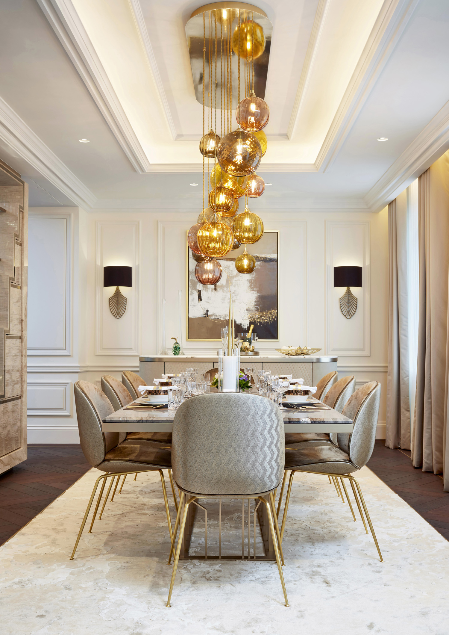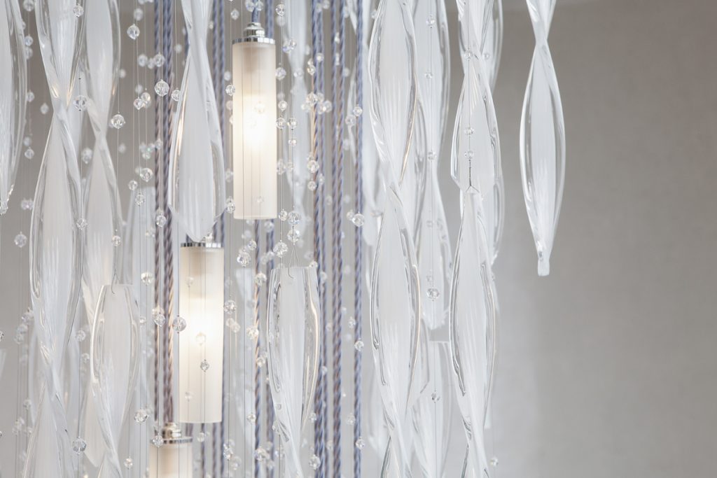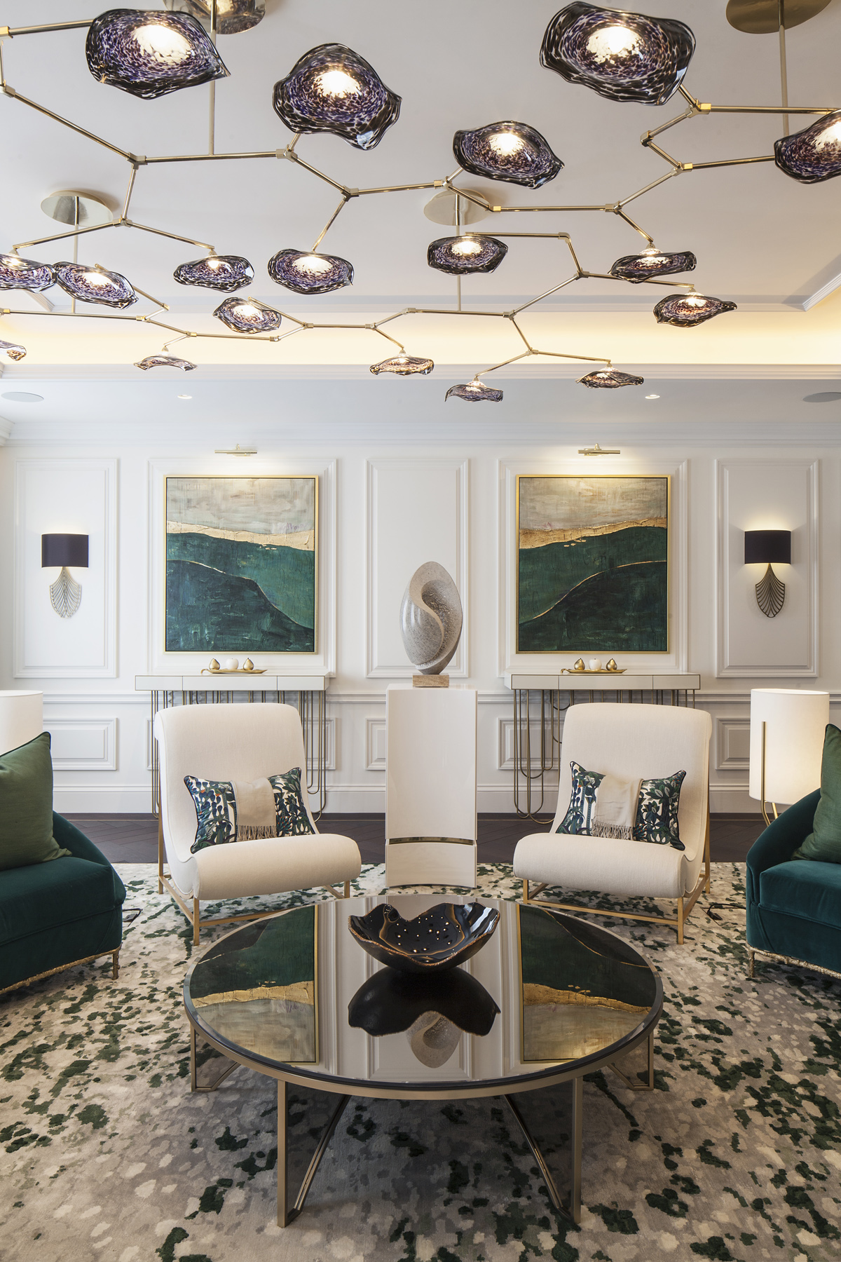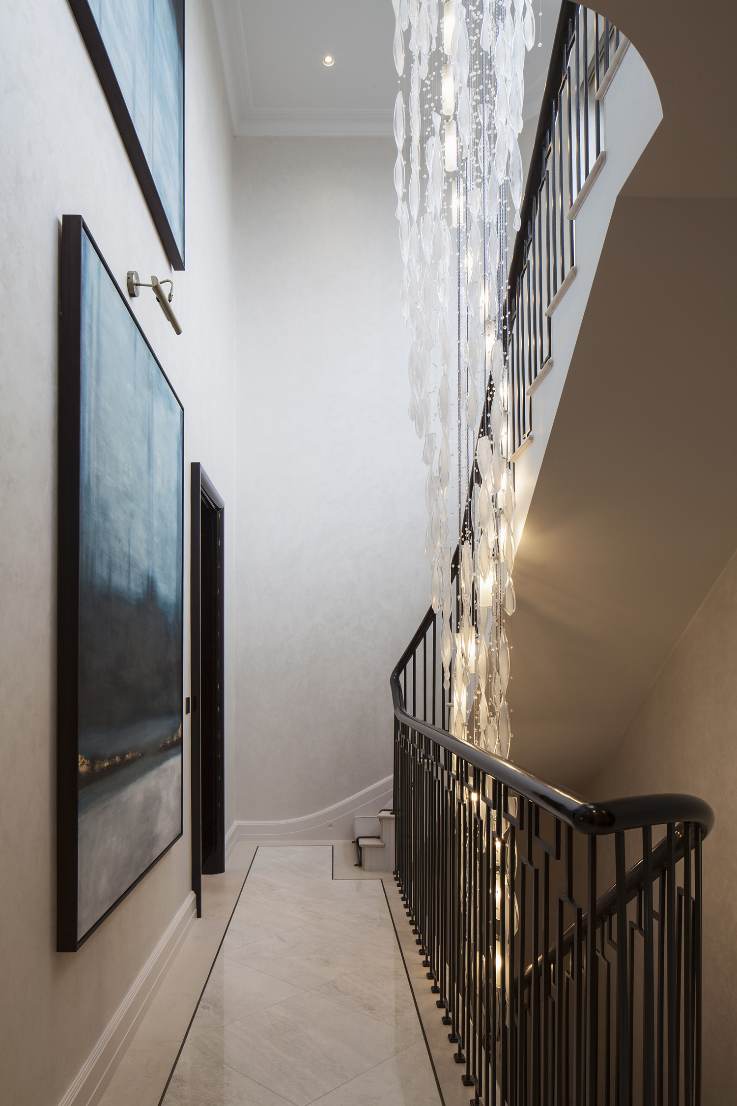 26th September 2018 | IN PROJECT OF THE WEEK | BY SBID Share Tweet Pinterest LinkedIn This week’s instalment of the #SBIDinspire interior design series comprises of a spectacular penthouse set across two buildings and a charming garden apartment. The Eaton Place residence offers an unparalleled level of luxury and sophistication; with a fusion of opulent style and functional design, this period property has been thoughtfully re-designed to epitomise luxurious modern living. An iconic address in the heart of Central London, Belgravia is one of London’s most vibrant and prestigious destinations, with grand Georgian architecture surrounded by the green open spaces of both Hyde Park and Buckingham Palace Gardens. Working in close partnership with developer and interior designer, Fenton Whelan Design, Nulty Bespoke assisted with the completion and installation of several stunningly custom-made lighting pieces throughout this luxury residential apartment. The overall interior design skilfully mixes contemporary finishes with the building’s classical proportions, giving a homely yet truly inspiring sensation to each space. The sympathetic treatment of the listed building’s key rooms ensures that the historic grandeur of the property is not only retained but enhanced. Céline Gehamy, Product Designer at Nulty Bespoke comments, ‘We immensely enjoyed working on this residential project with its high spec and elegant design. From designing a creative, beautiful and practical solution for a chandelier in the tall, thin stairwell, to overseeing the colour combinations of the glass pendants within the dining room, this was just the kind of project that the Nulty Bespoke team thrives upon. Throughout the design, manufacture and installation every detail was diligently considered – from the positioning of each individual element in the design stage to the threading and fastening of every tiny crystal’. We interviewed Celine Gehamy and Ollie Yates, Product Creation at Nulty Bespoke about their collaboration with Desariot Ademaj, the Creative Director at Fenton Whelan Design to produce bespoke lighting solutions for a project of this luxurious magnitude! Company: Fenton Whelan Design & Nulty Bespoke Project: Eaton Place Project Location: London, UK What was the client’s brief? The client requested a selection of unique and individual luminaires designed for a luxury residential apartment in London. There were a number of spaces that we had to create bespoke pieces for ranging from the living room, dining room, entertainment space, stairwell and bedroom. The project was very high end and the design of the pendants had to reflect this, whilst supporting the individual style of each room. What inspired the design of the project? Each space required its own identity, and this is reflected in the design of the luminaires. Such as the finishes, the shape, light source and colour temperature. A light sculpture in the main entertaining space of the apartment, incorporates 22 mouth-blown dish-like glass shades made in London. Each shade is a combination of different hues of purple and white. The sculpture consists of two separate polished champagne-gold-coloured metal frames, which seamlessly blend together as one. Each section has two ceiling plates incorporating the same metal. The LED light source is housed in an oval-shaped detail accommodating the natural, variations of glass thickness. The underside of the glass resembles an oyster shell with a pearl nestled within. Three large tailor-made Art Deco inspired luminaires add a stylish touch to the top floor entertaining space. The refined light fittings, each measuring 1.6m x 0.25m have been handcrafted with sandblasted reeded glass, a material reminiscent of the Art Deco era. Each luminaire exudes a diffused light, and a warm temperature of 2400k providing a soft radiant effect within the ceiling cove. The trio of elegant handmade luminaires brings a sense of perspective to the room and demonstrates that simplicity can most definitely be striking. The quality of the luminaires complements the rich materials used in the interior design, adding a classic touch to the gentleman’s club-feel of the room. A statement cluster of 19 hand-blown glass shades made in England hang above the dining table, complementing the sense of drama in this opulent space. Dimmable filament bulbs, produce a warm colour and the shades have a variety of finishes (diamonds, ribbed, smooth) and colours (amber, grey, purple and light brown). A handcrafted seven-metre chandelier is suspended from a precision engineered, polished nickel structure positioned directly below the elliptical skylight within the stairwell. The frame is purposely simple and open in a design to make sure the flow of natural light is not restricted. The impressive lighting installation resembles a waterfall and comprises over 100 handmade Italian glass twists and 1500 faceted crystal spheres. The glass twists have a rippled texture, an opaque centre and a pointed tip for added definition, and they complement the crystal droplets beautifully. Cascading through the centre is a spiral of 22 frosted glass lanterns housing LED lamps, which provide a soft, warm glow of light to the space, while highlighting the sculpture’s intricate glass work and sparkling crystals. A glamorous chandelier hangs from the centre of the bedroom ceiling. Two bronze-plated rings form the base of the chandelier and over 100 triangular Italian glass prisms hang from the rings and refract the LED light within, producing a warm colour temperature. Dark brown fabric envelopes the cables leading to the bronze-plated ceiling plate. The entire piece has a drop of 400mm from the ceiling What was the toughest hurdle your team overcame during the project? Adapting to the construction constraints on site proved tricky at times but we managed to work closely with the client to provide quick and efficient solutions to deliver the project 