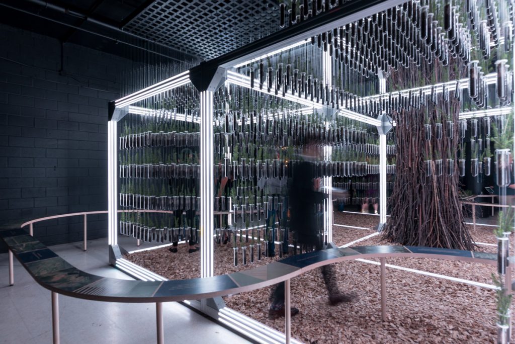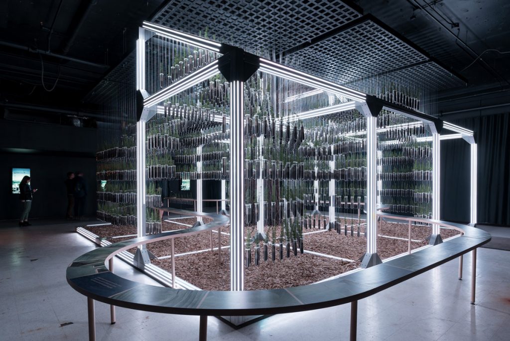 This week’s instalment of the #SBIDinspire interior design series features the immersive metaphor for managed forests and the future of renewable construction designed in a collaboration between STACKLAB, Community Agency, and Great Gulf.  This public space design presents an abstracted representation of a house being gradually overgrown by a nascent pine forest. At the centre of the 60-square-metre exhibit, a twig-wrapped base-building column acts as the figurative tree trunk. Suspended around it were the ‘leaves’: 4,085 glass test tubes, filled with soil and pine saplings, hanging from a CNC-milled birch plywood trellis bolted to the existing concrete ceiling. The Lightframe display system integrates programmable multi-colour LEDs within reconfigurable structural aluminium modules, allowing for infinitely customisable spatial forms and lighting patterns. That attribute was exploited to make Wild Abode an immersive, multi-sensory experience, with slowly undulating waves of light from the LEDs timed to simulate a body’s breathing and heartbeat.