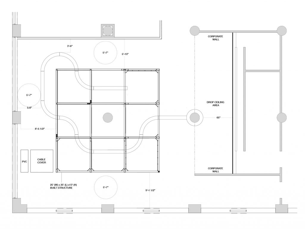 The Wild Abode features the first public launch of Stacklab project’s prototypic “Lightframe” system, which they developed in collaboration with architect, and University of Waterloo professor, Jonathan Enns in 2015 and 2016. Wild Abode used the Lightframe system to present an abstracted home being gradually consumed by a nascent pine forest. Arrayed around a central, sculptural tree trunk made of salvaged twigs, were 4870 pine saplings and soil in test tubes, ready to be planted for later use as a renewable building material. The Lightframe prototype was programmed with slowly undulating waves of light from the LEDs, timed to simulate a body’s breathing and heartbeat. The scale of the Lightframe module’s 8 by 8-foot bay relates comfortably to the human body. The dimensions permit easy, flat-pack shipping, and hauling inside a standard elevator. All of the Wild Abode exhibit components fit inside an 18-wheeler truck.