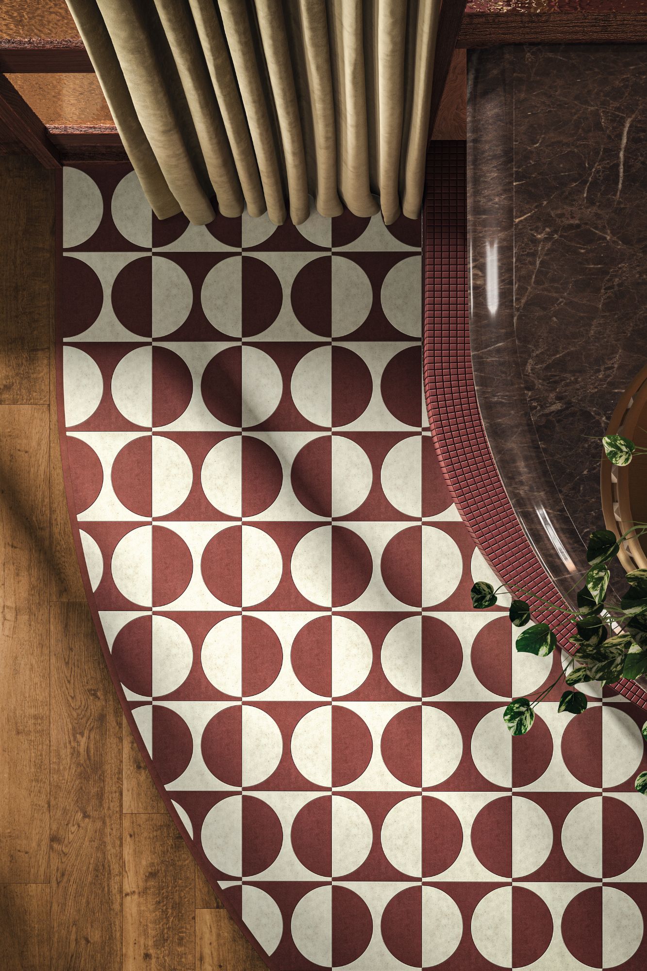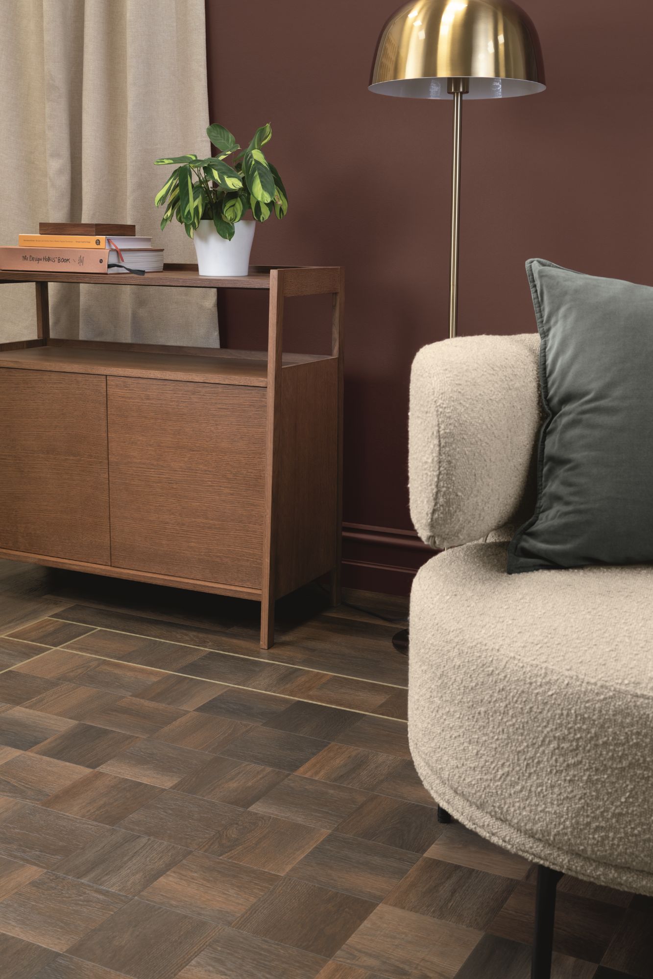 Nostalgic Reset shows in the retro styling of: DC633 Lune Small in Packwood Stone and red wine-hued Stucco Roselle, the sculptural semi-circle design is playful yet sophisticated. DC630 nods to vintage patterns with Check in oversized Tay Oak squares - pair with a gold stripping border for added elegance. DC629 pairs Chantilly Weave in a bold two-tone Bordeaux Oak and Buxton Oak design to re-energise the heritage weave pattern, making it perfect for boutique lounges and bars. DC631 is a classic black and white Check in statement Bianca Classic Marble and Nero Classic Marble. DC635 is a throwback to mixed wood grain floors with a Small Parquet laying pattern in five tones from cool, scandi-inspired Wharncliffe Oak to warm, golden Rotterdam Oak.