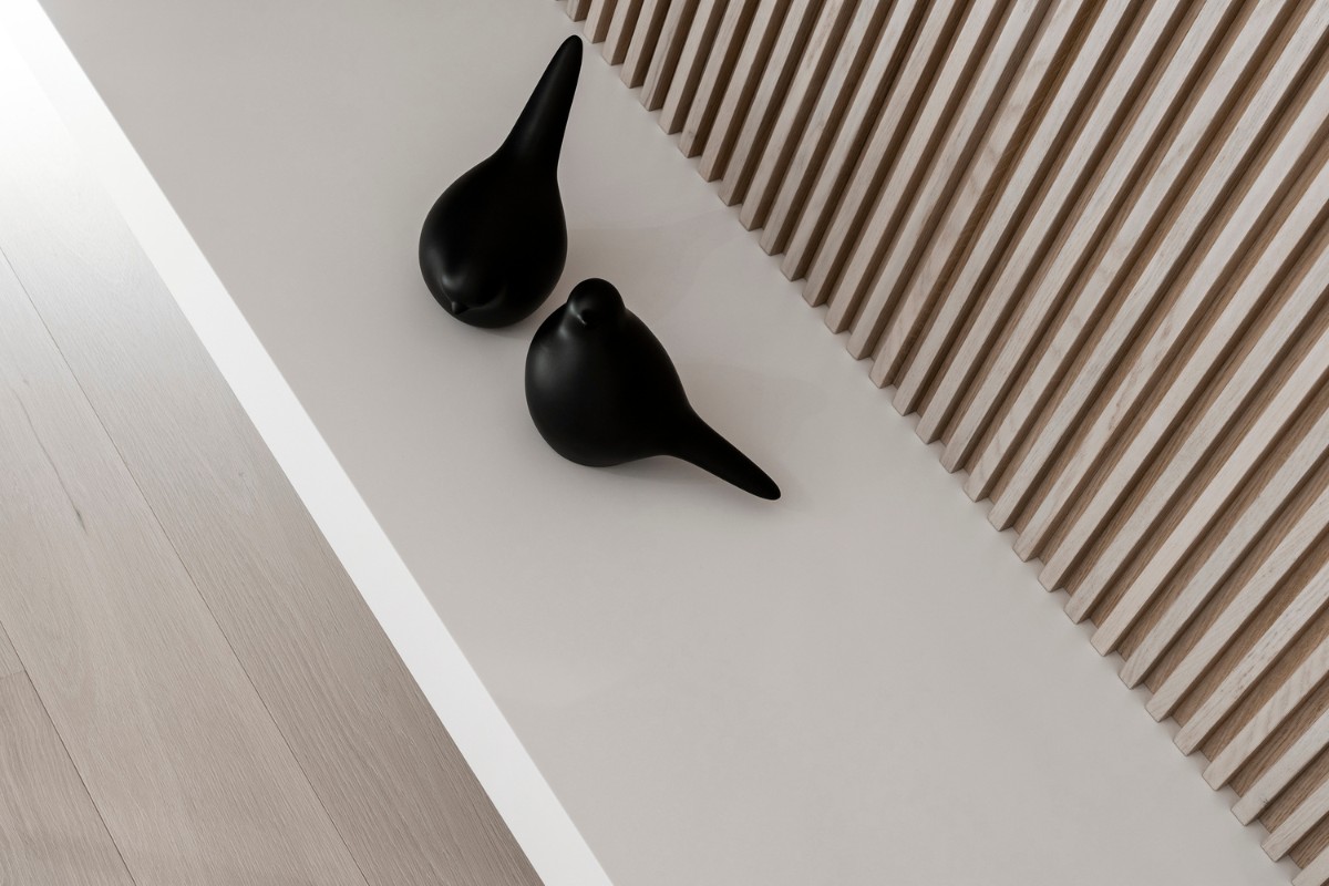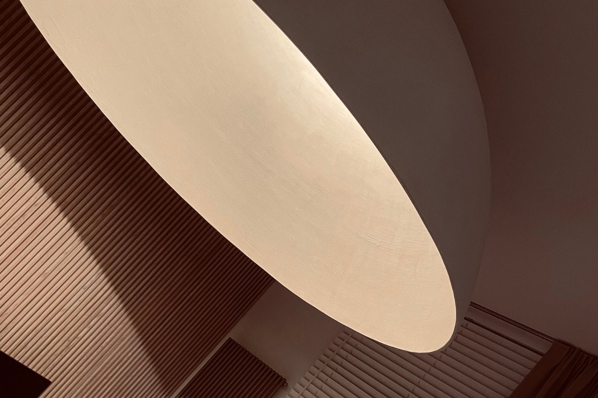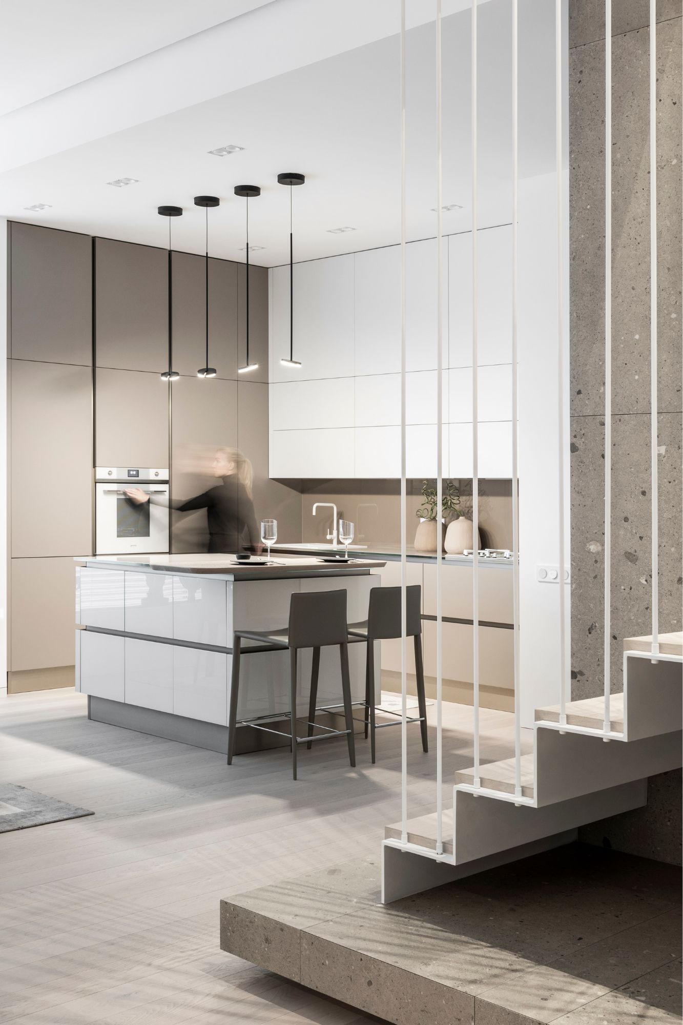 A 165 sqm duplex penthouse for a young couple in minimalist style. The main decoration of the living room is the luxurious fibre concrete cupola, which creates an unusual light show that also delimits the space and creates a special atmosphere. The conceptual interior fulfils the basic objective of minimalism - conciseness.