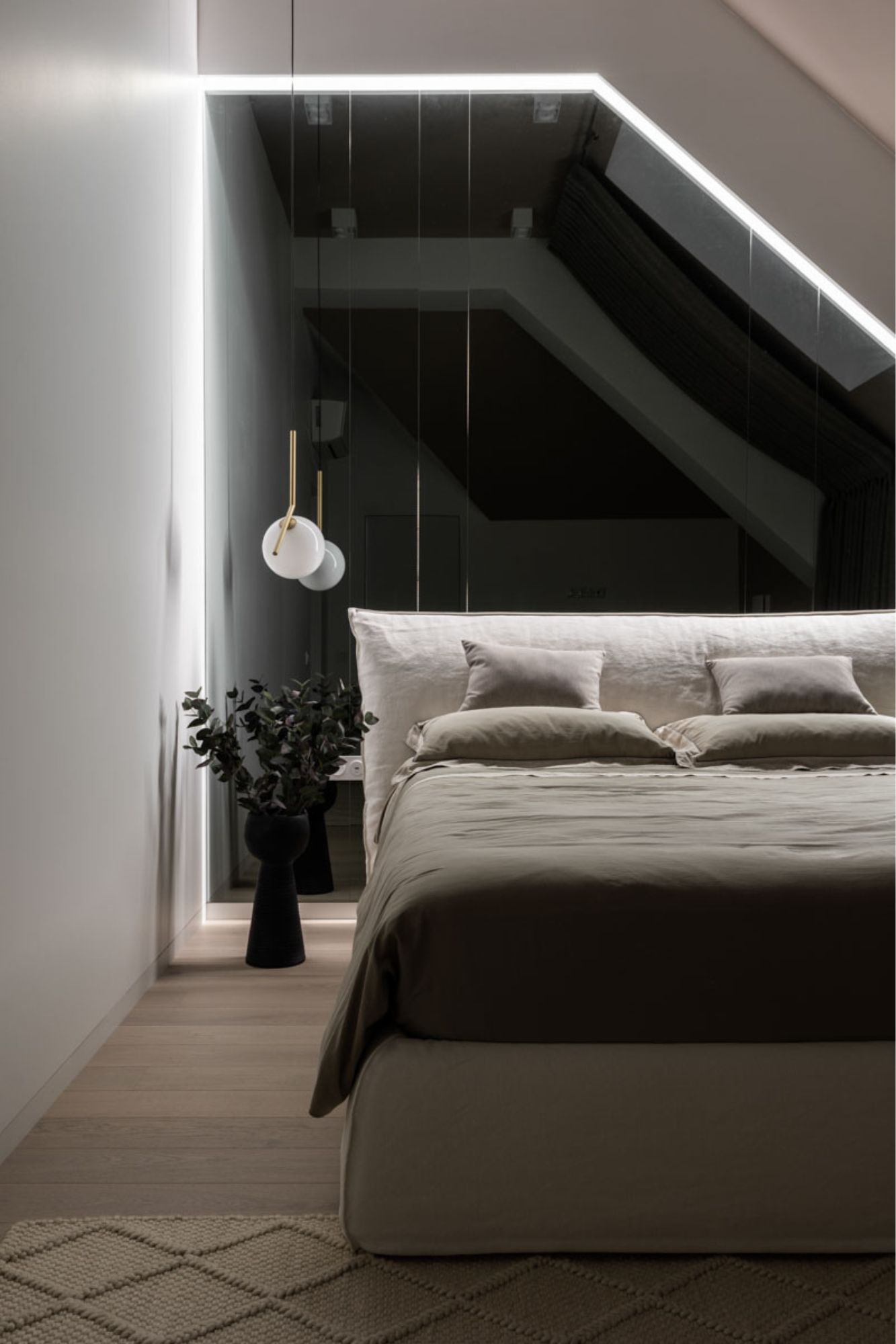 A 170-square-meter apartment in the HIGH PARK clubhouse. The interior is designed in a modern style, close to luxury minimalism. The decor of the bedrooms is enriched by geometric textile panels, while colourful mirrors create a visual effect of infinite space. The LED lights, installed across the apartment, lead the eye from the central scene to the background, creating a wave-like effect. A pleasant haze of soft light envelops the space.