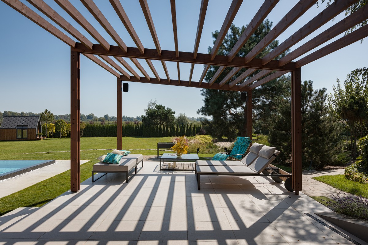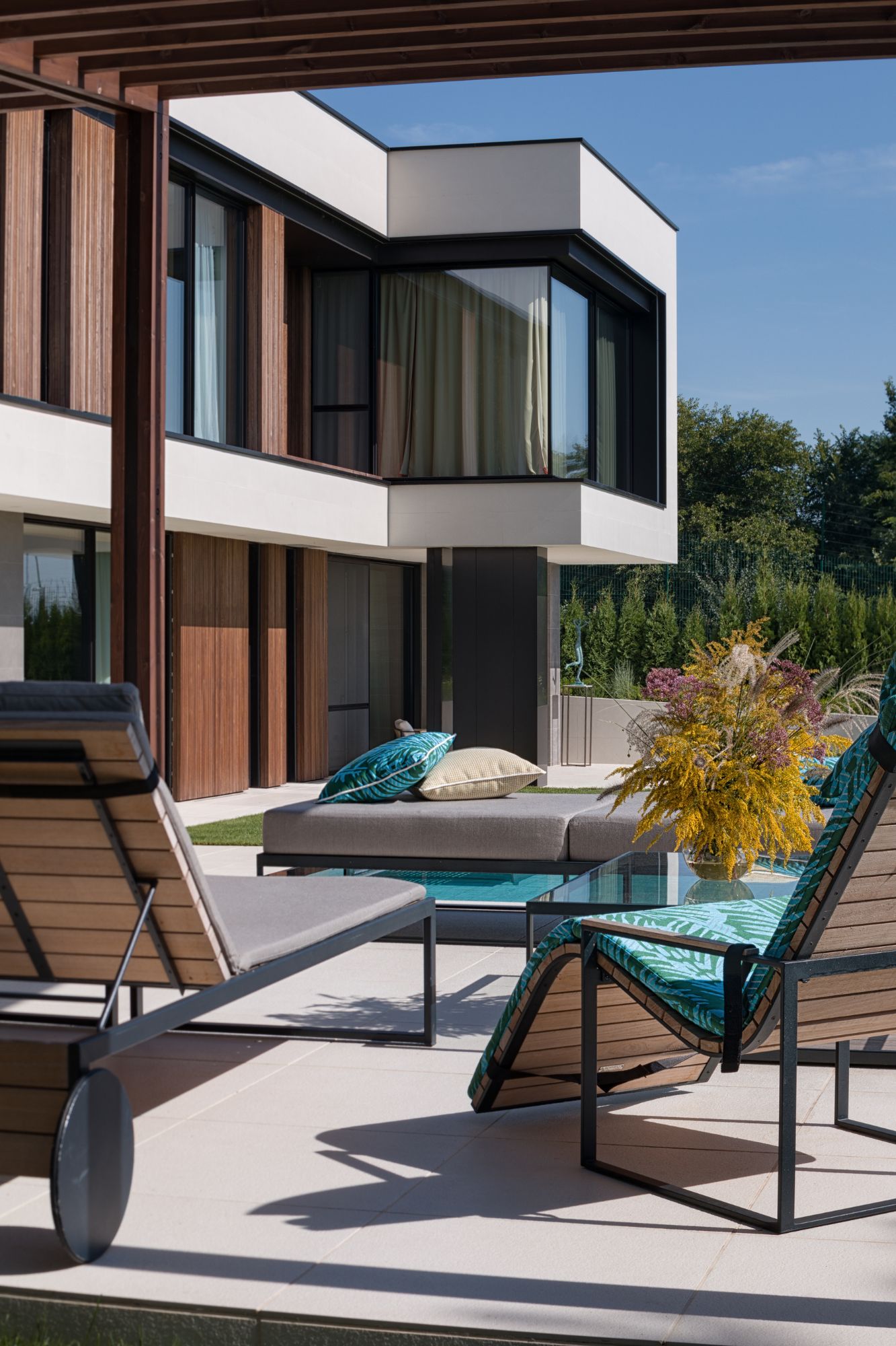 The house's design carefully considers the movement patterns of its occupants, eliminating unnecessary elements like corridors and cramped passages. Its architecture features clean lines complemented by the use of natural materials such as wood and stone. With windows oriented towards the garden, each room offers picturesque views of the verdant surroundings. To preserve a tree on the porch, architects ingeniously integrated it into the roof structure, creating a unique opening to accommodate its crown.