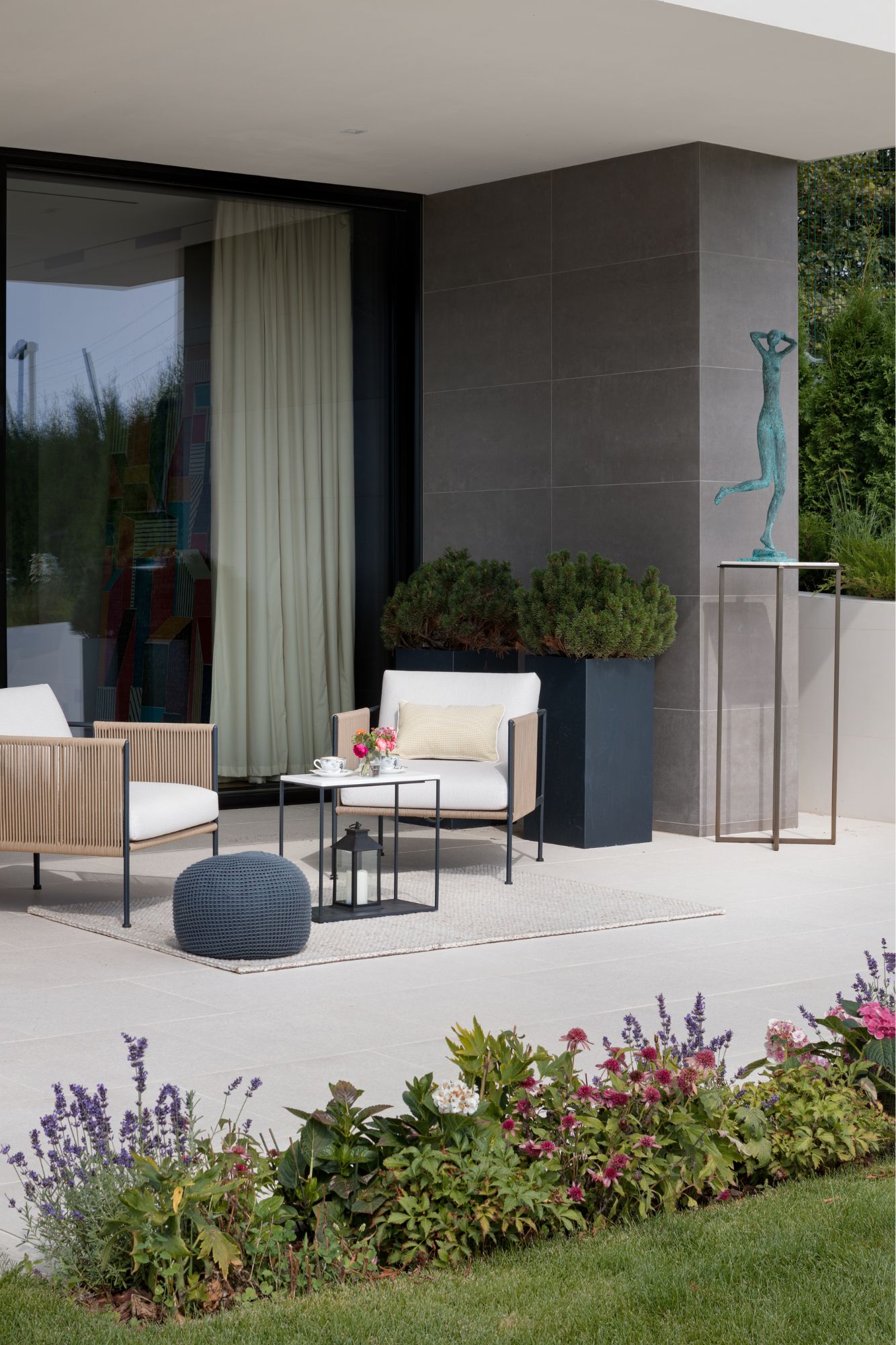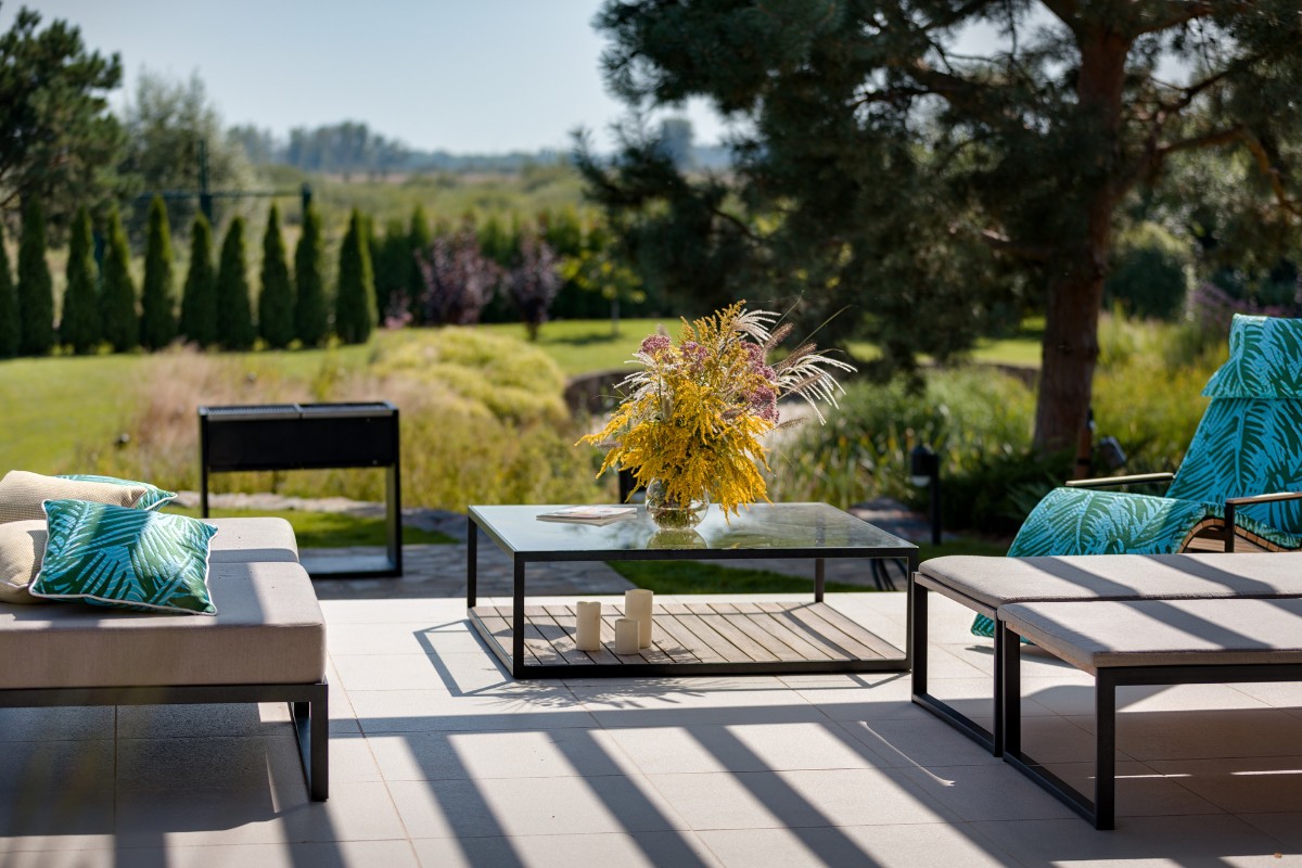 A beloved highlight of the apartment is undoubtedly its expansive terrace boasting uninterrupted views of the sea. Adorned with sophisticated outdoor seating from Kettal and a snug hanging armchair by Dedon, this space offers the ideal setting to admire the picturesque horizon in serene comfort.