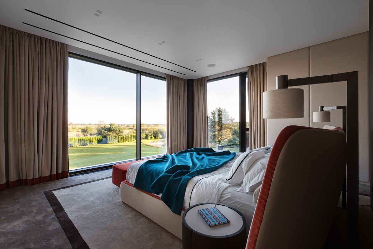The stylistic direction, colour palette, and material selection for this interior were driven by the desire to streamline the spatial layout. In the master bedroom, we incorporated textile panels in a calming caramel brown hue and installed warm walnut parquet flooring to introduce a sense of softness and intimacy. These panels were intricately tailored and crafted by hand in Italy, providing not just a decorative touch but also practicality, as they can be conveniently replaced or cleaned when needed.