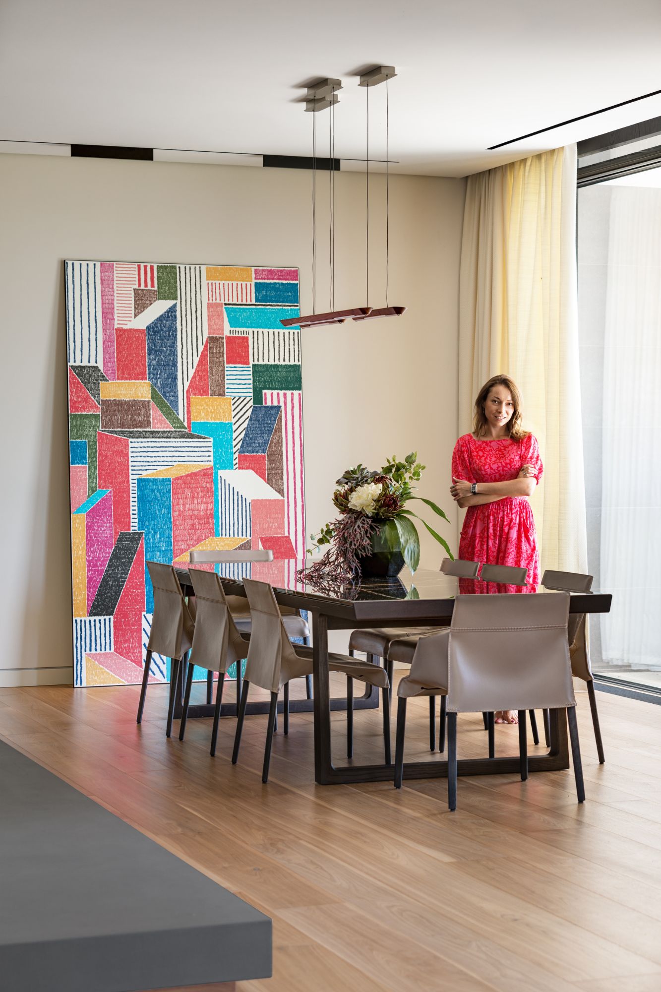 The dining area is elegantly minimalist, centered around a large table accompanied by chairs, comfortably seating eight individuals. Warm diffused light emanates from a horizontal lamp overhead. Setting the tone for the dining room is an abstract urbanist panel titled "Day," a component of the triptych "A Walk in the City," envisioned by Northern Irish illustrator Nigel Peek for the House of Hermès. The vibrant colours and geometric shapes of the panels extend their influence into the living room, expertly transformed by the designer into a focal point of the entire interior.